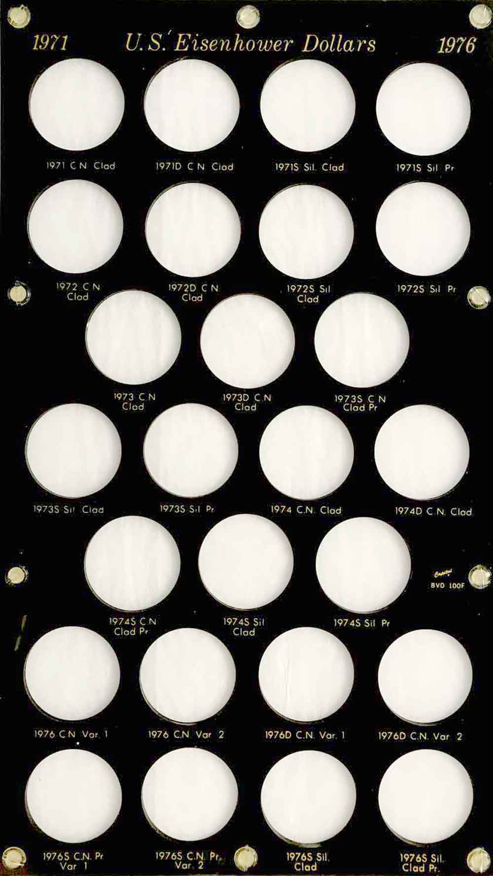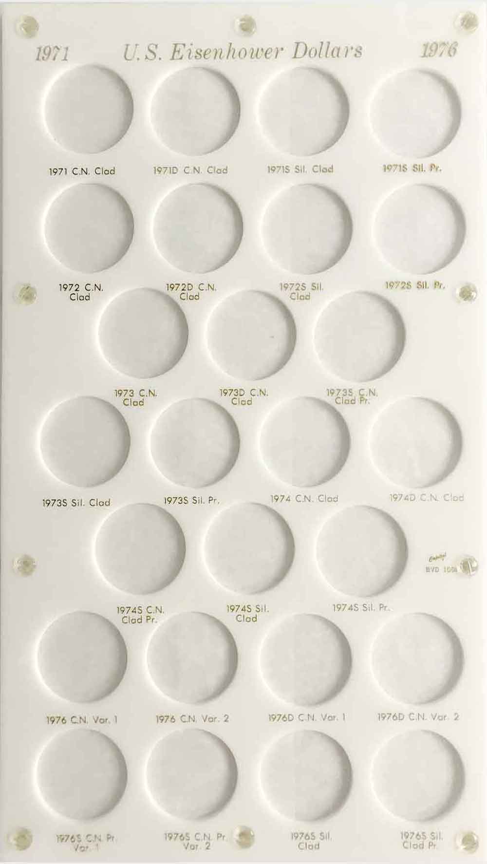 Capital Plastics offers the largest selection of premium coin holders of any available brand. This holder has 26 holes for Eisenhower Dollars dated from 1971 to 1976-S. Purchase Capital Holder 452E for the rest of the Eisenhower set. Sized to fit inside a bank vault drawer.