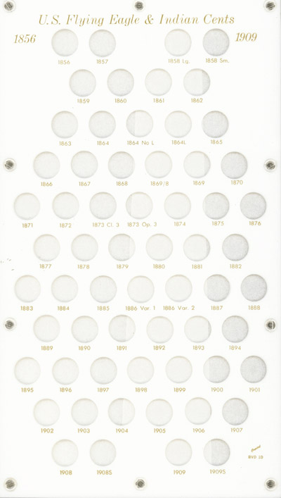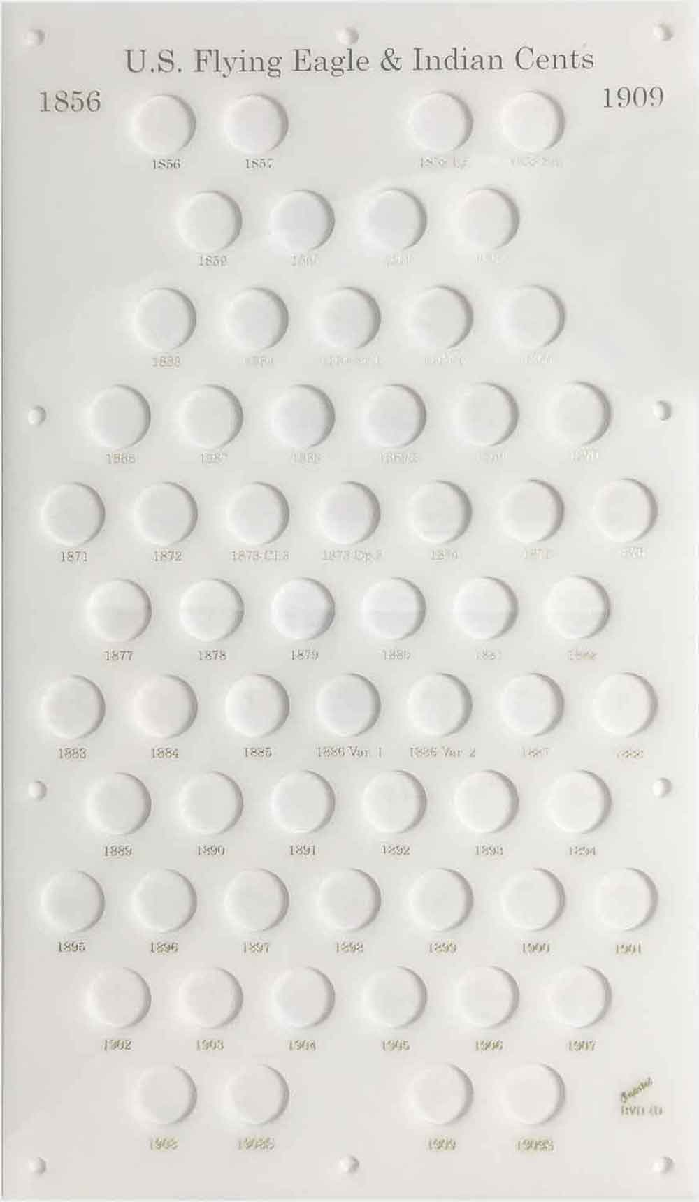 Capital Plastics offers the largest selection of premium coin holders of any available brand. This holder has 62 holes for the Flying Eagle Cents from 1856 to 1858 and the Indian Head Cents from 1859 to 1909-S. It includes a hole for the 1869/8 overdate and two holes each for 1873 and 1886 so that both types can be displayed. Sized to fit inside a bank vault drawer.