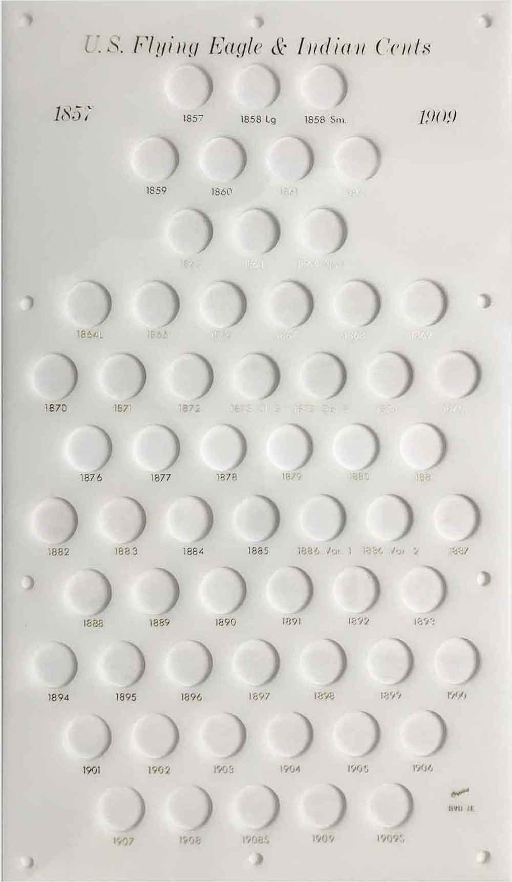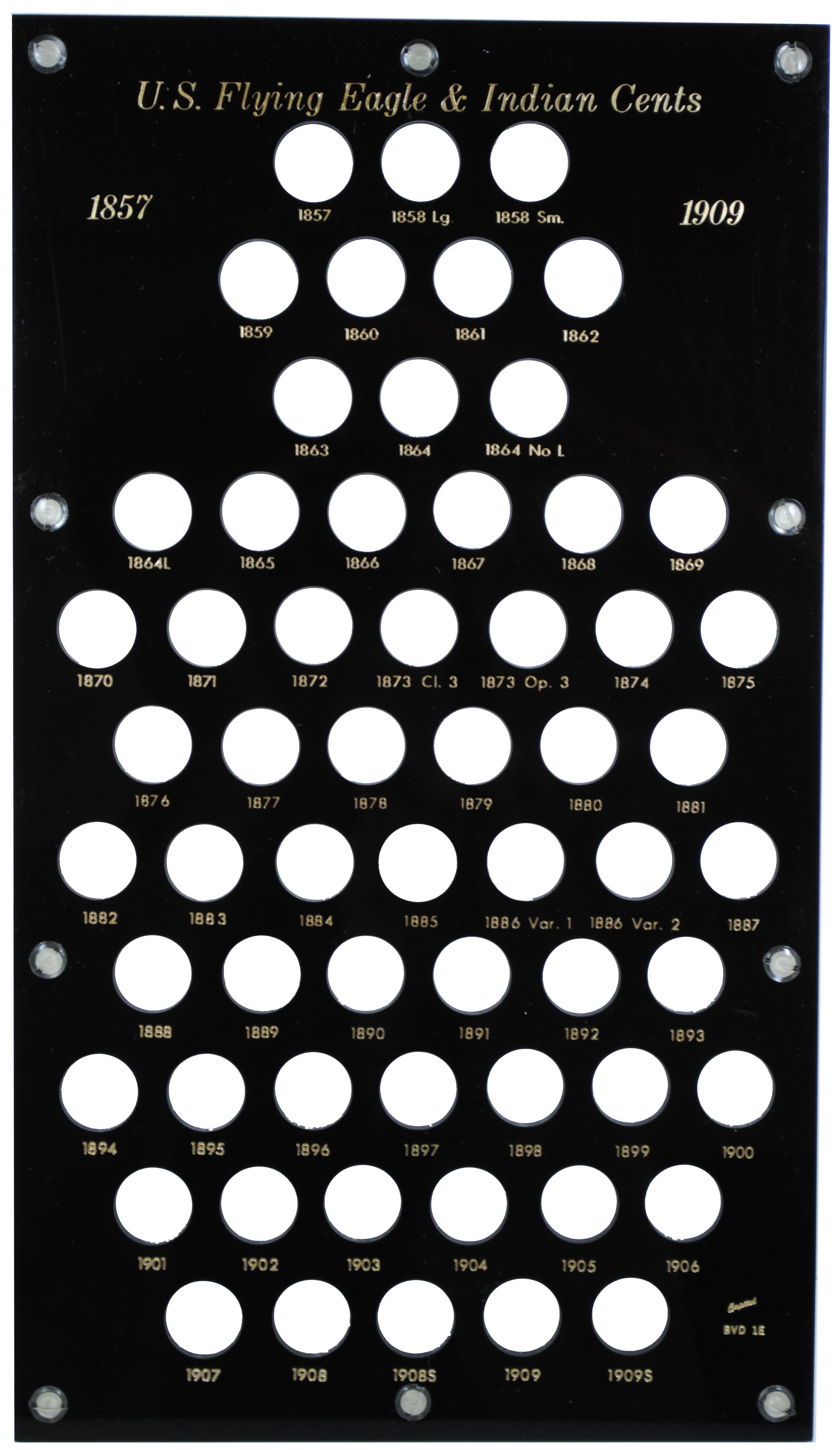 Capital Plastics offers the largest selection of premium coin holders of any available brand. This holder has 60 holes for the Flying Eagle Cents from 1857 to 1858 and the Indian Head Cents from 1859 to 1909-S. It has two holes each for 1873 and 1886 so that both types can be displayed. It does not include holes for the 1856 Flying Eagle Cent or the 1869/8 overdate. Sized to fit inside a bank vault drawer.