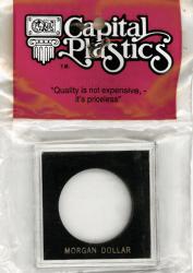 Capital Plastics offers the largest selection of premium coin holders of any available brand. The 2x3 style holder is made of clear molded plastic pieces that snap together around a black or white core with gold printing. It is sized similar to a slab and includes space at the top for a label.