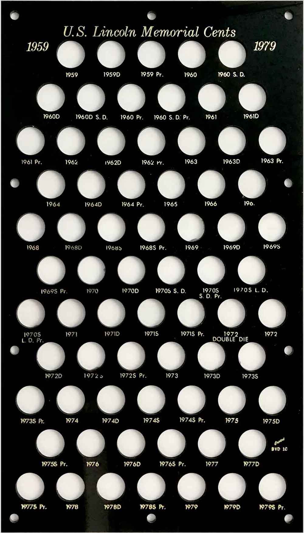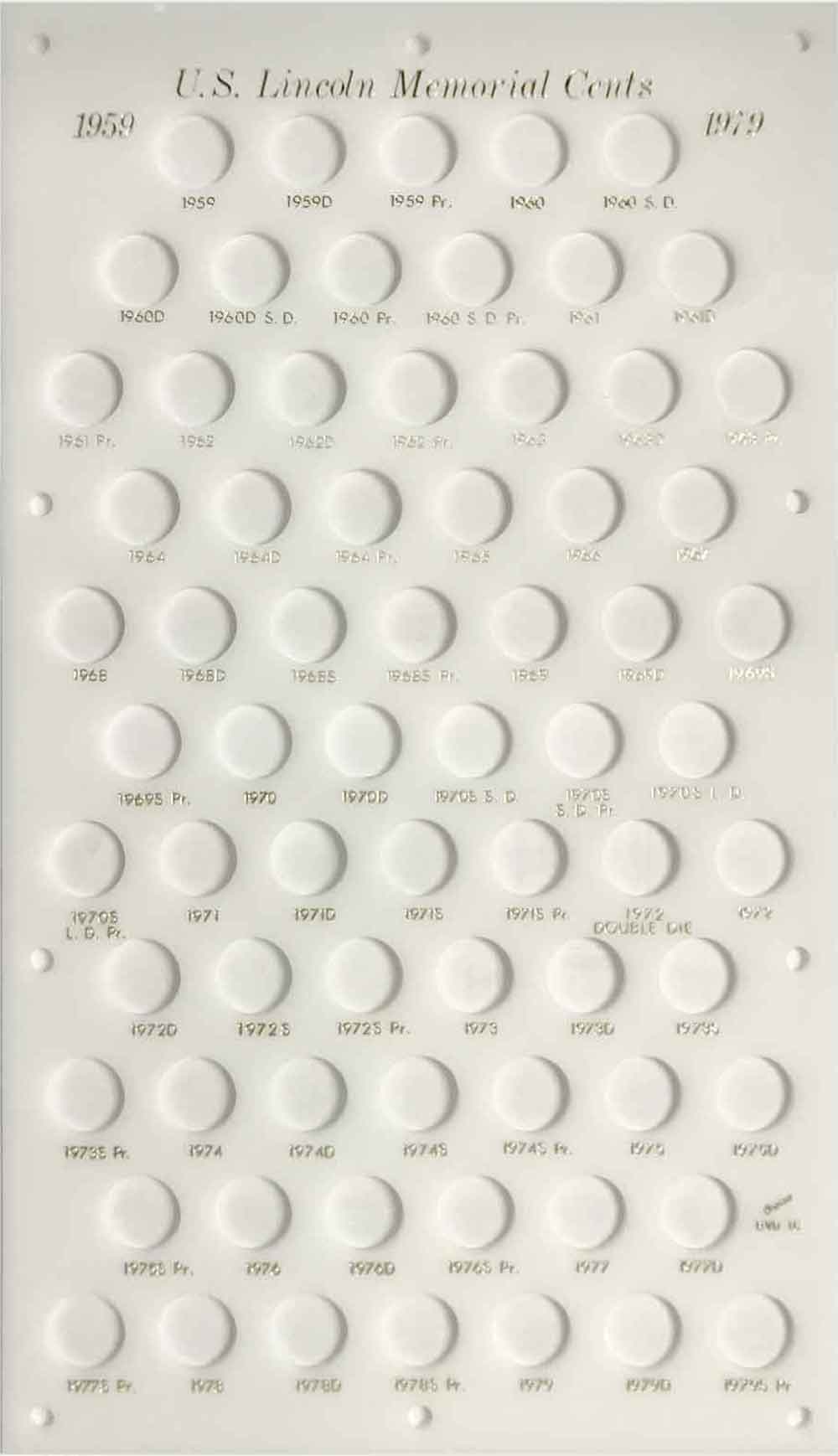 Capital Plastics offers the largest selection of premium coin holders of any available brand. This holder has 70 holes for the Lincoln Memorial Cents from 1959 to 1979-S (including holes for S-mint proofs). Sized to fit inside a bank vault drawer.