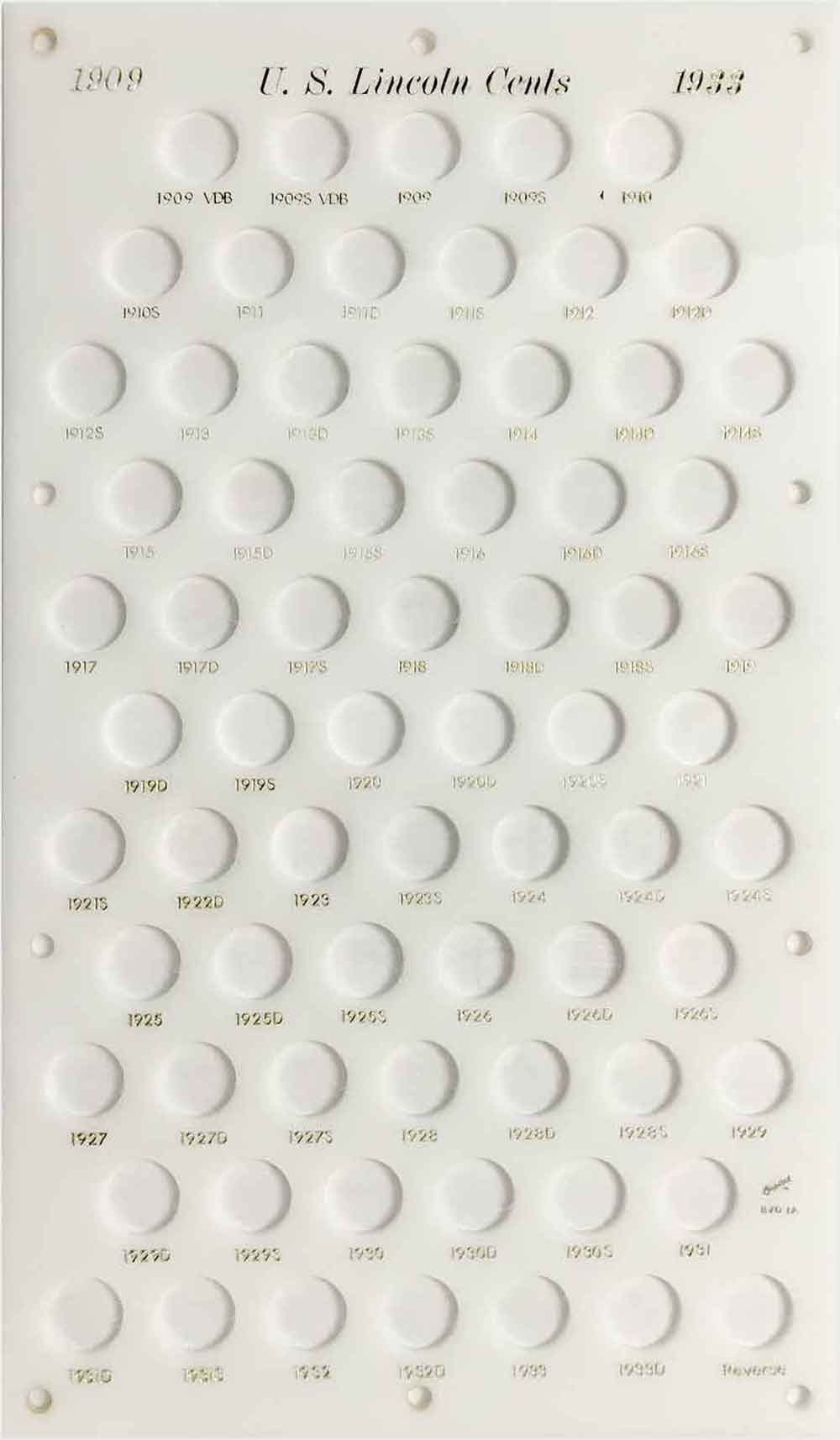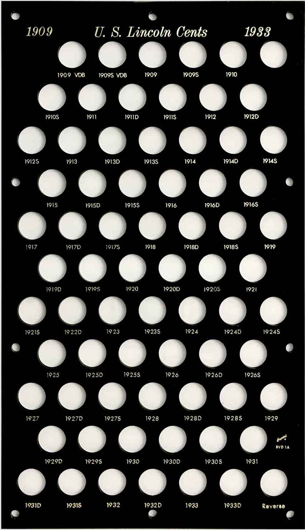 Capital Plastics offers the largest selection of premium coin holders of any available brand. This holder has 70 holes for the Lincoln Wheat Cents from 1909 to 1933-D. It includes an extra hole to show an example of the reverse. It does not include a hole for the 1922 Plain. Sized to fit inside a bank vault drawer.