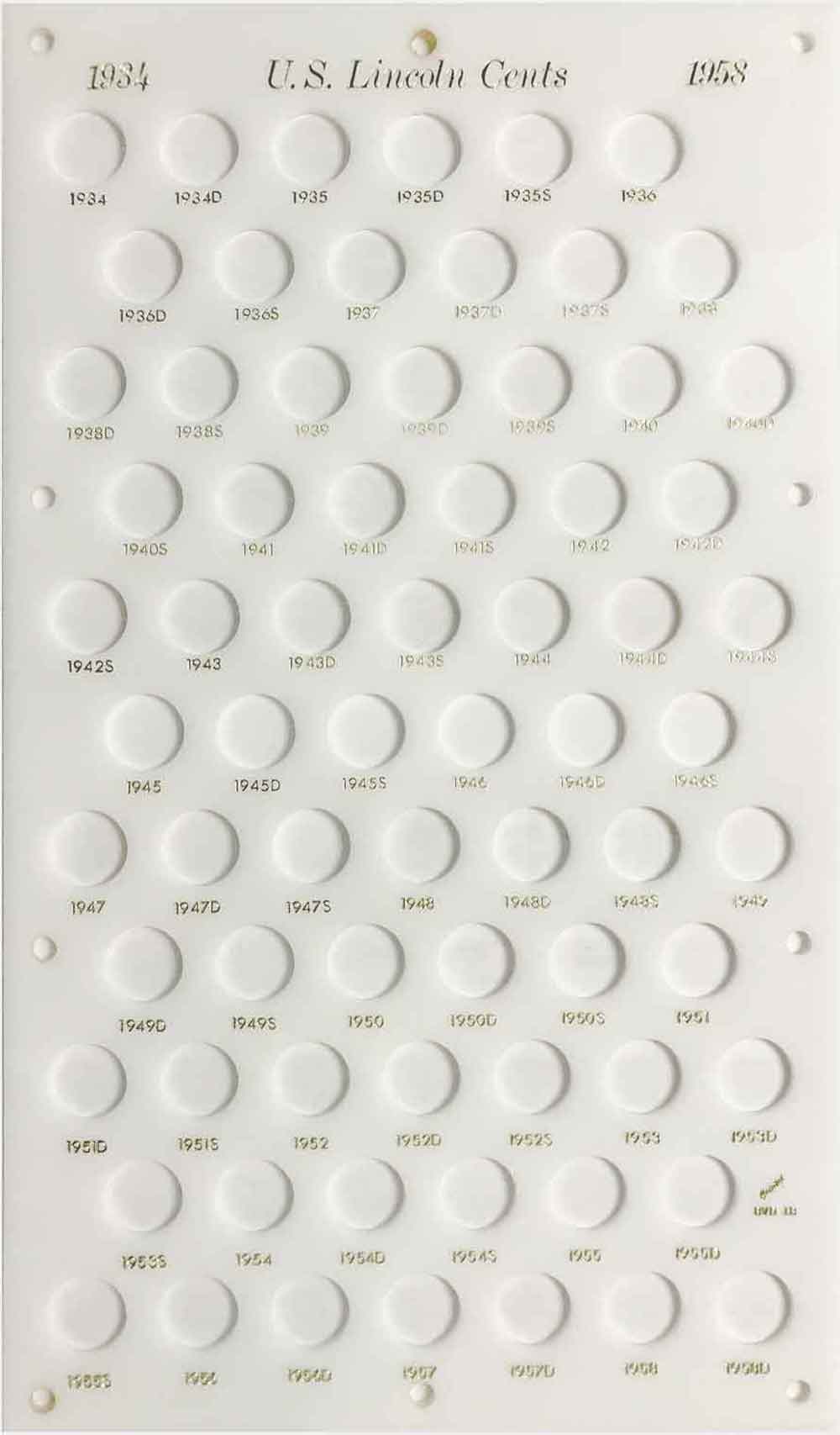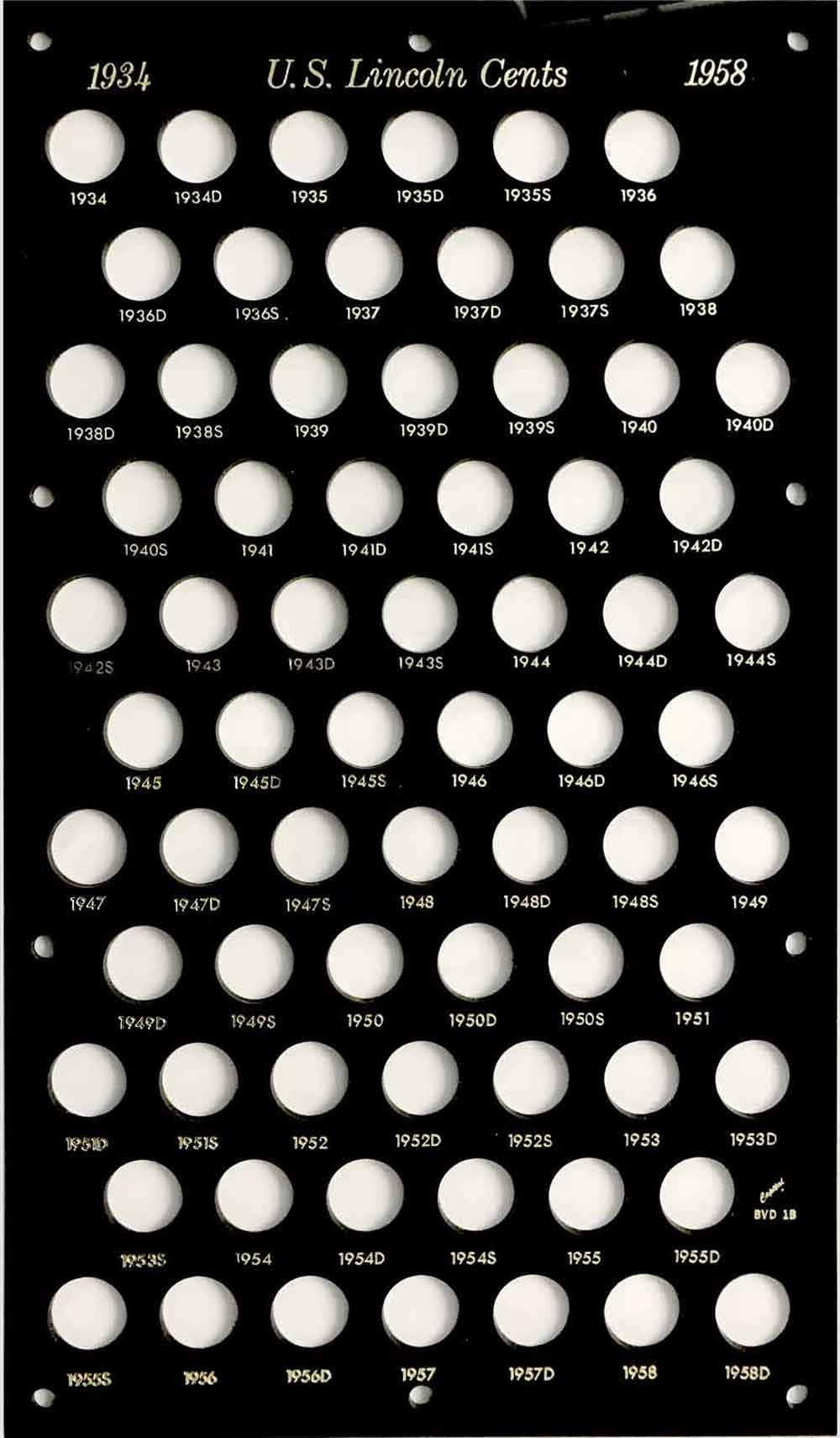 Capital Plastics offers the largest selection of premium coin holders of any available brand. This holder has 71 holes for the Lincoln Wheat Cents from 1934 to 1958-D. It does not include a hole for the 1955 Double Die. However, upon request, an extra hole can be provided to accomdate the 1955 Double Die. Sized to fit inside a bank vault drawer.
