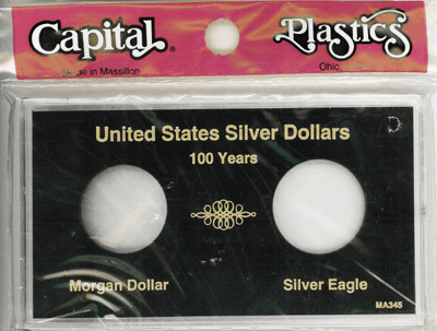 Capital Plastics offers the largest selection of premium coin holders of any available brand. This is Capital's Meteor style snap together holder with for a Morgan Dollar and American Silver Eagle with dates 100 years apart (e.g. 1886 to 1904 for the Morgan Dollar and 1986 to 2004 for the American Silver Eagle).