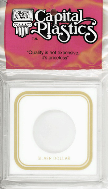 Capital Plastics offers the largest selection of premium coin holders of any available brand. The 3.3x3.3 style holder is vest pocket sized and made of clear molded plastic pieces that snap together around a black or white core with gold printing. It has a double gold border around the edge.