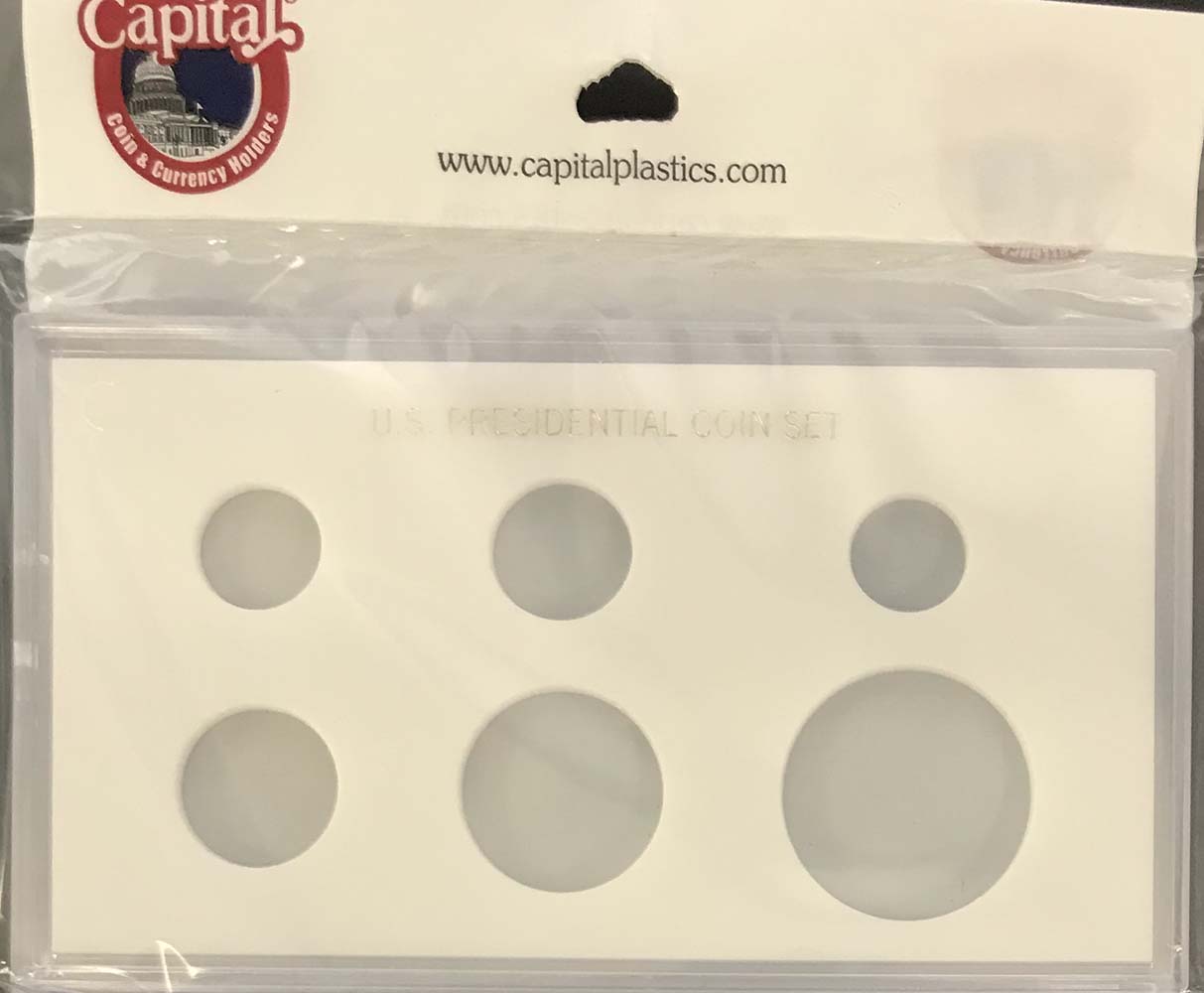 Capital Plastics offers the largest selection of premium coin holders of any available brand. This is Capital's Meteor style snap together holder with six holes for an example each of the Presidential series of coins (Lincoln Cent, Jefferson Nickel, Roosevelt Dime, Washington Quarter, Kennedy Half Dollar and Eisenhower Dollar).