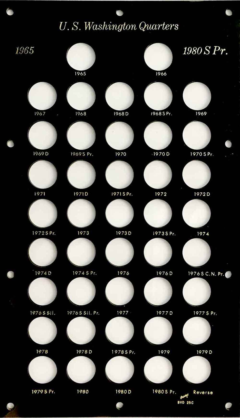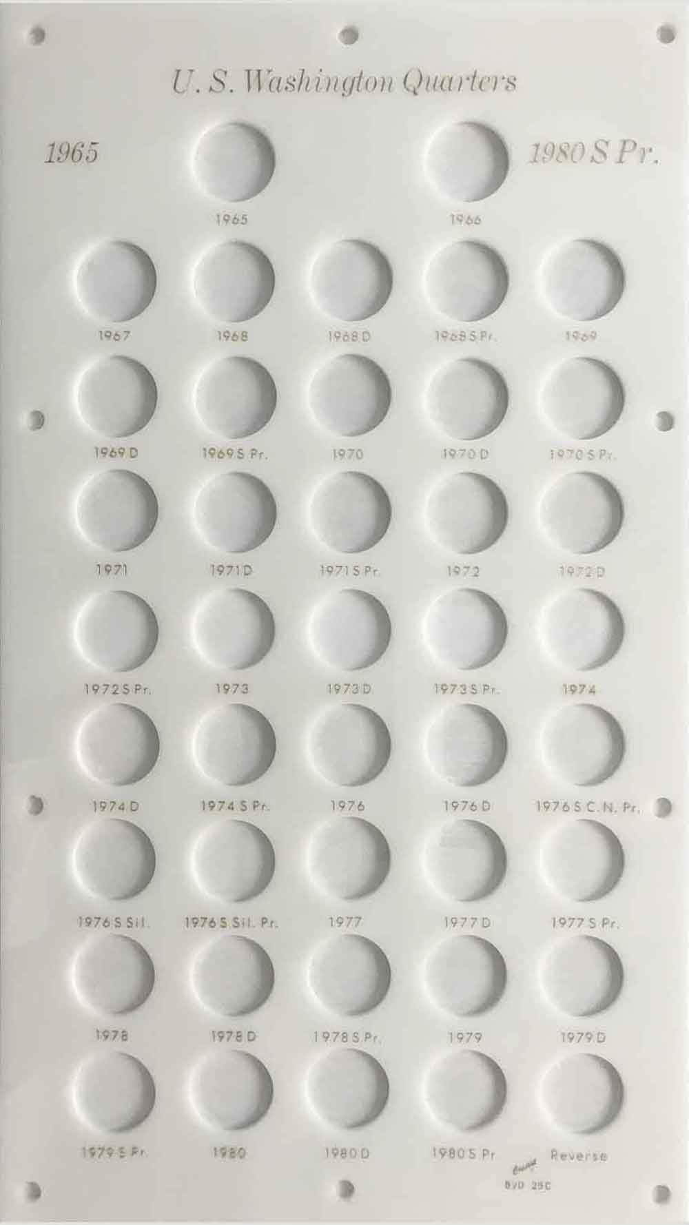 Capital Plastics offers the largest selection of premium coin holders of any available brand. This holder has 42 holes for the Washington Quarters from 1965 to 1980S. It includes holes for the proof only issues. Sized to fit inside a bank vault drawer.