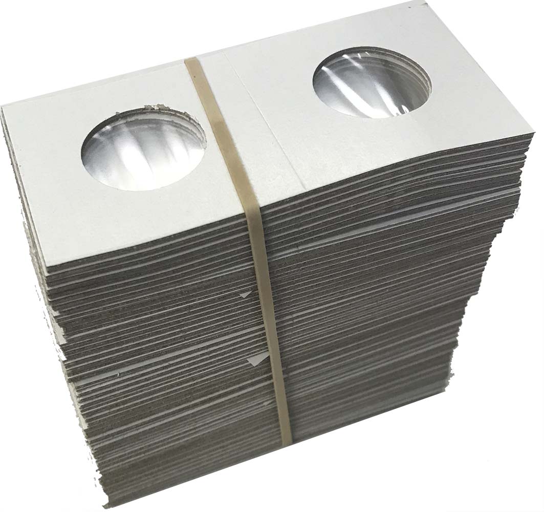 Cardboard 2x2 flips are the most widely used coin holders in the industry. Just insert a coin, fold over and staple. Cowen's brand holders--made with heavier (thicker) cardboard-- provide more protection for your coins than the other brands of 2x2 cardboard coin holders available on the market. The inside of Cowen's holders are lined with DuPont Mylar, the chemically most non-reactive lining available for coins. Mylar does not tear or scratch and is also the most moisture resistant film available. Mylar film is also dustproof with the lowest available permeability. Sold in bundles of 100 or cases of 3000 (30 bundles).