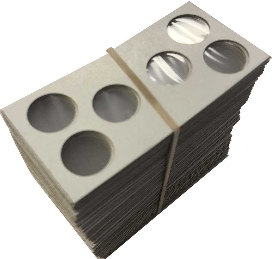 These standard 2x2 sized flips have three holes sized to fit cents or dimes and are ideal for PDS sets or other similar three-piece sets of coins. Just insert the coins, fold over and staple. Sold in bundles of 100.