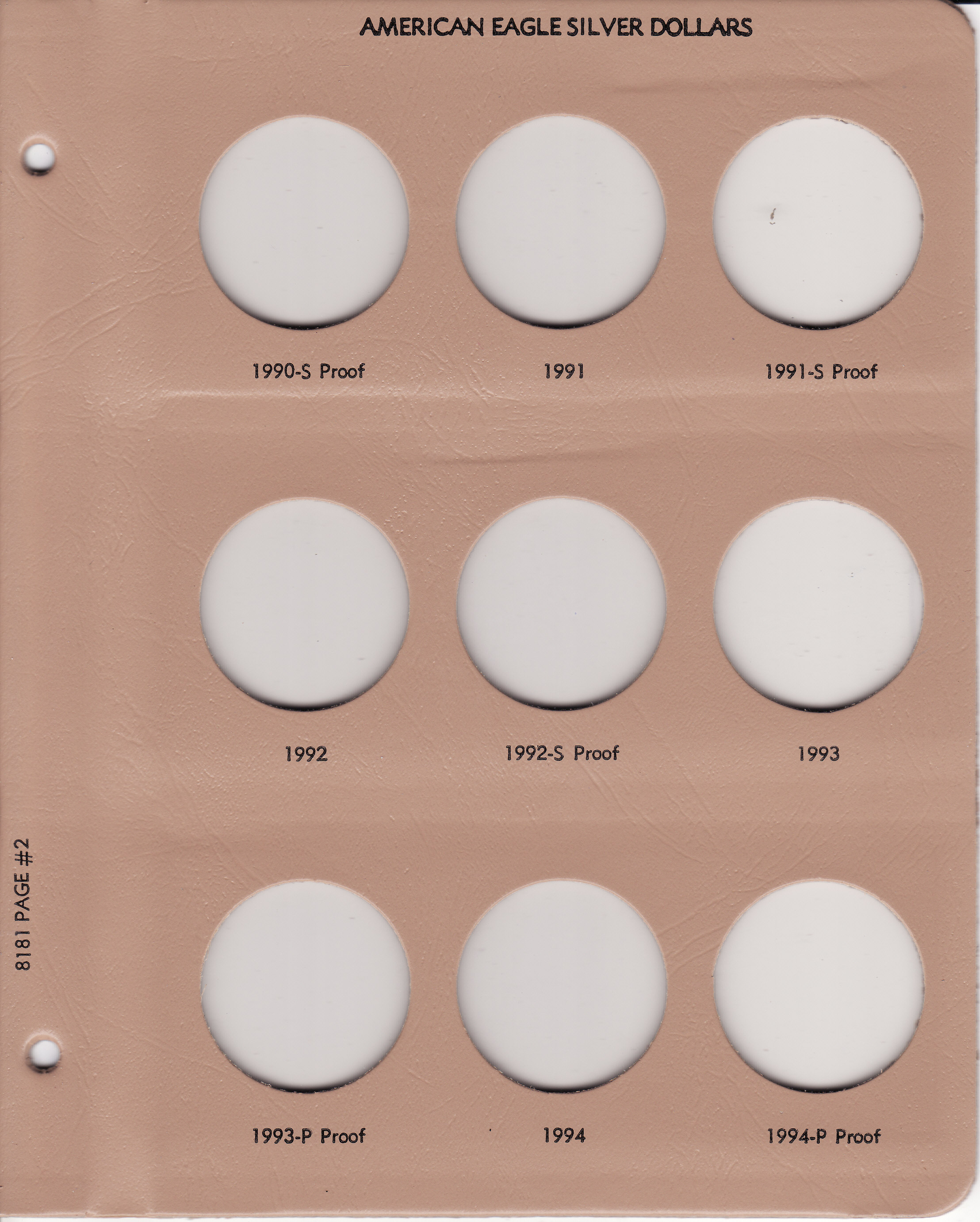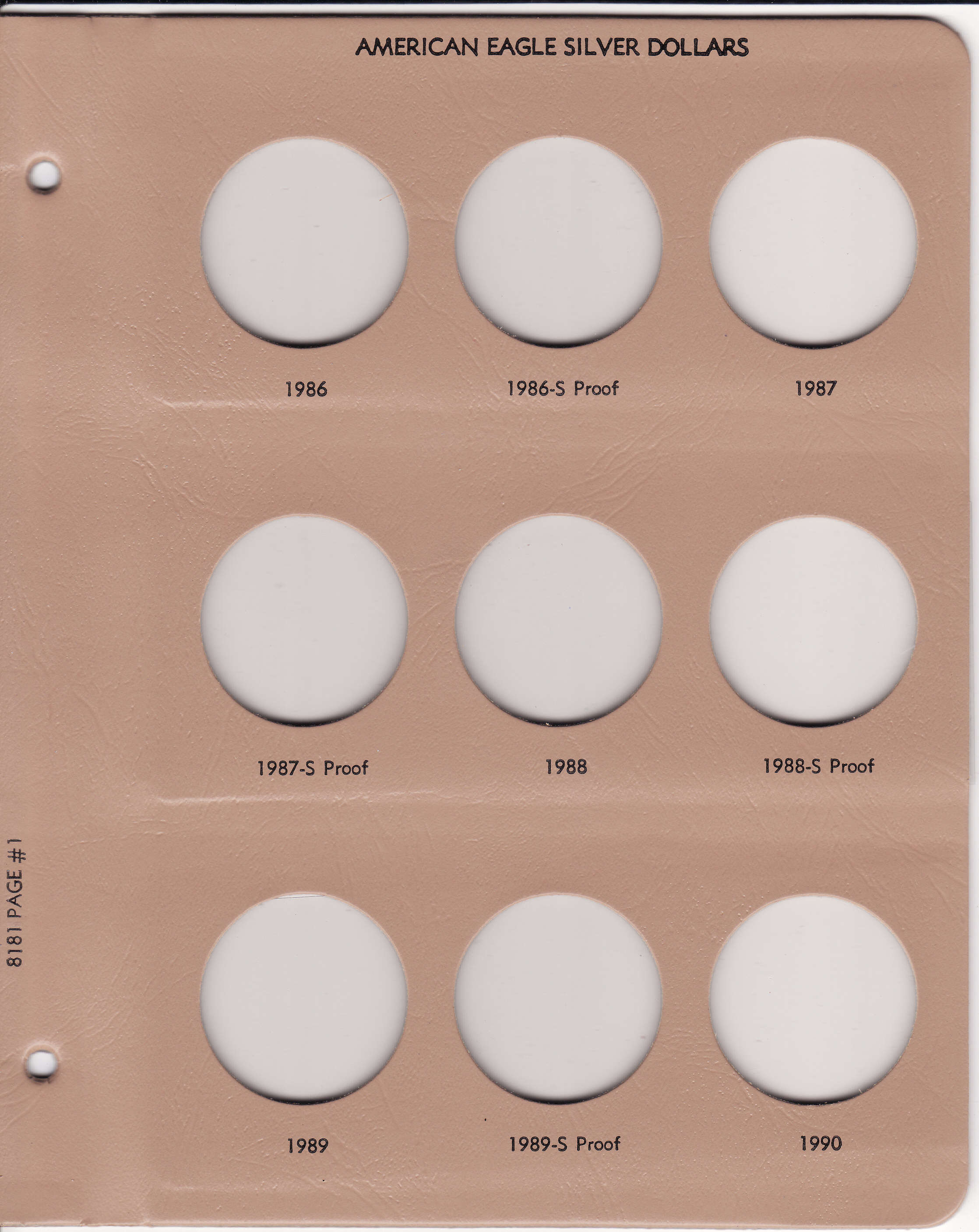 This Dansco Supreme Album for American Eagle Silver Dollars w/ Proof (Dansco model number 8181) consists of a brown leatherette binder with loose-leaf hinged pages. The binder is gold stamped and the plastic coated pages are tan in color with black lettering. The pages are held in the binder with two posts that screw apart so that pages can be added, removed and replaced with ease. If a slip case is desired, the 7/8 inch slip case is the proper size for this album.