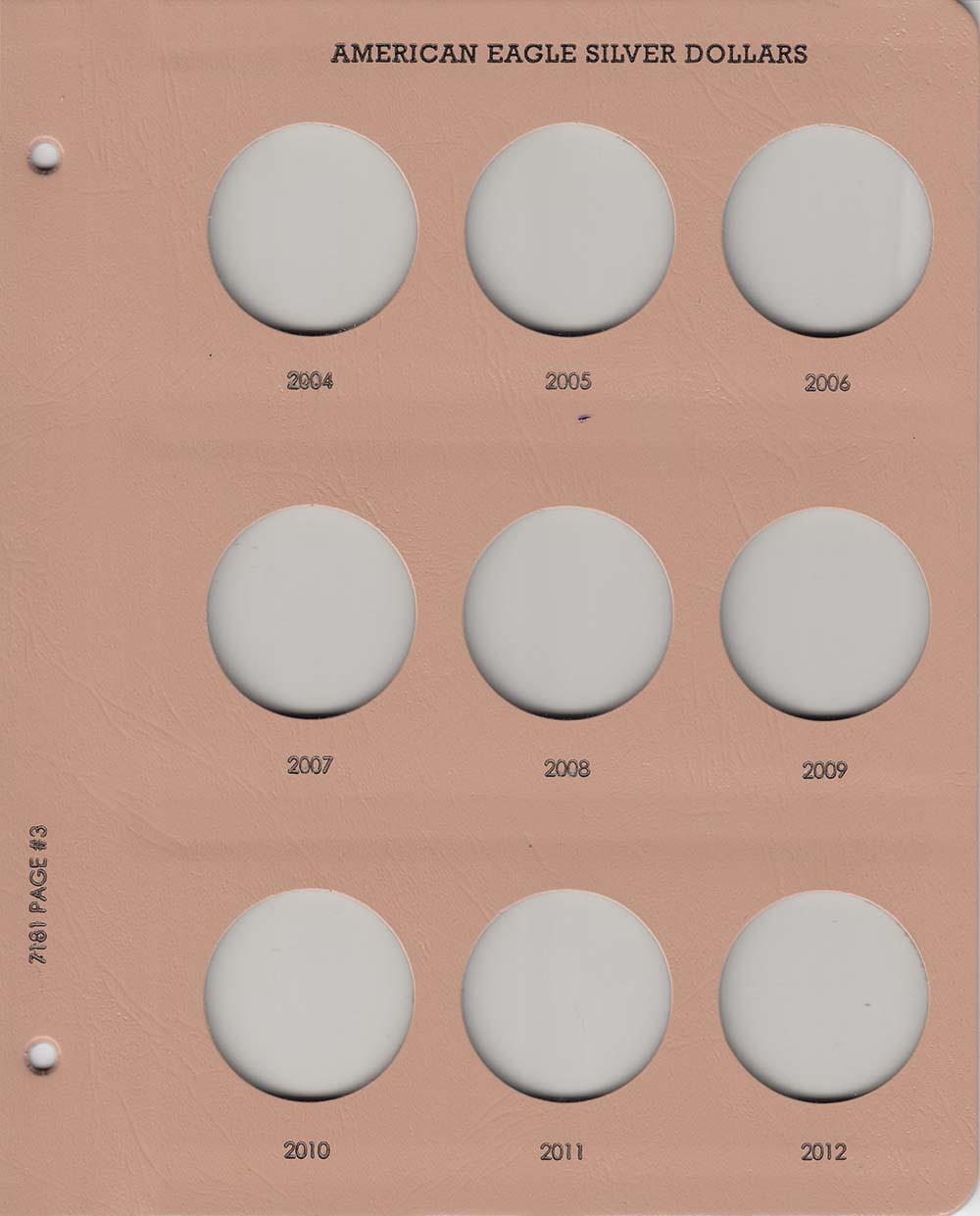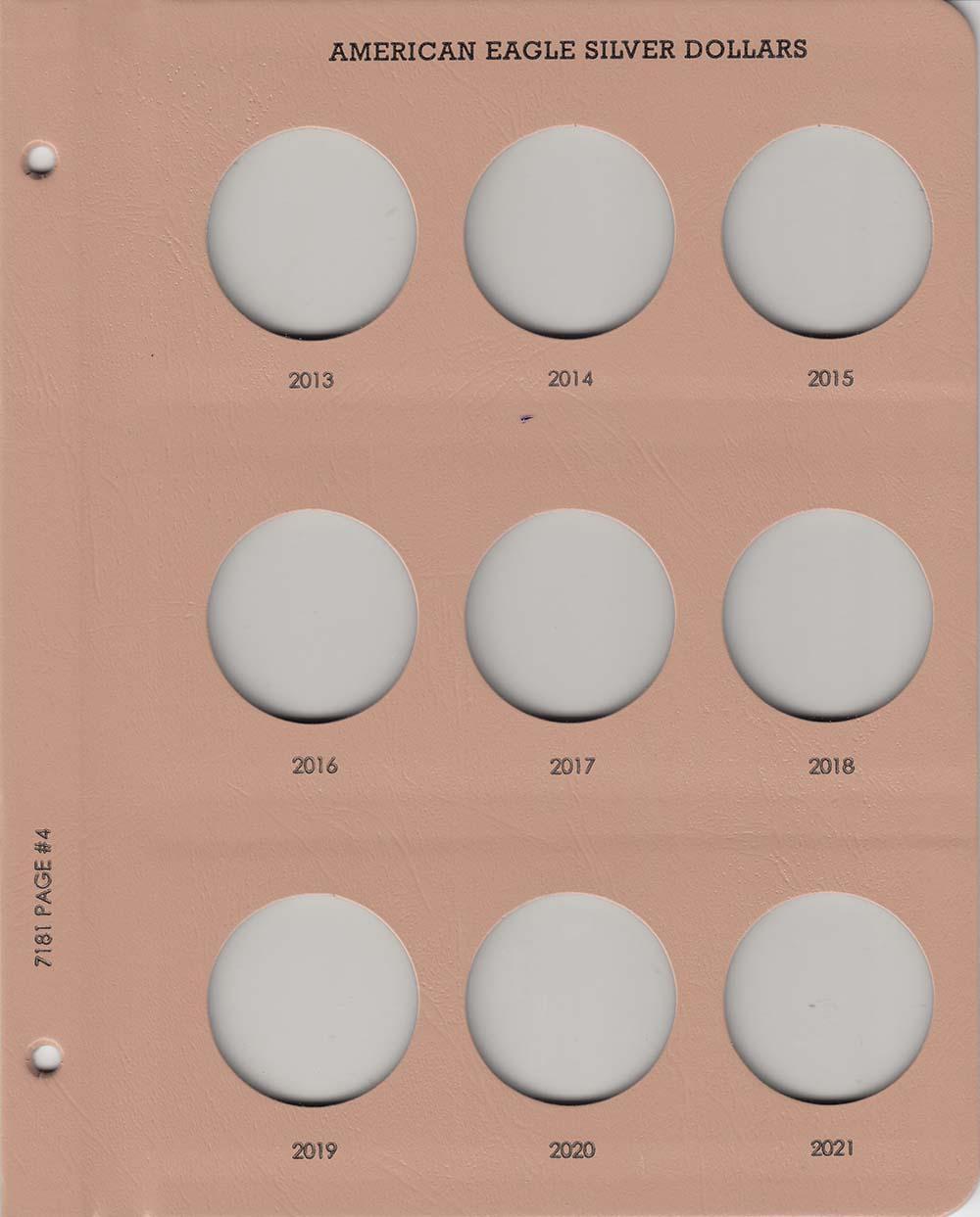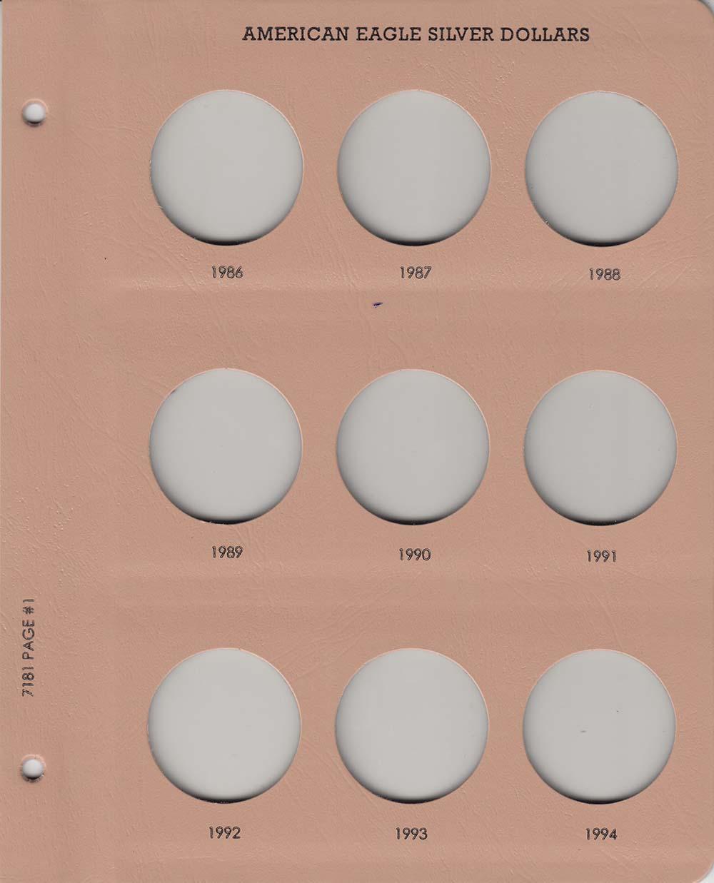 This Dansco Supreme Album for American Eagle Silver Dollars (Dansco model number 7181) consists of a brown leatherette binder with loose-leaf hinged pages. The binder is gold stamped and the plastic coated pages are tan in color with black lettering. The pages are held in the binder with two posts that screw apart so that pages can be added, removed and replaced with ease. If a slip case is desired, the 3/4 inch slip case is the proper size for this album.
