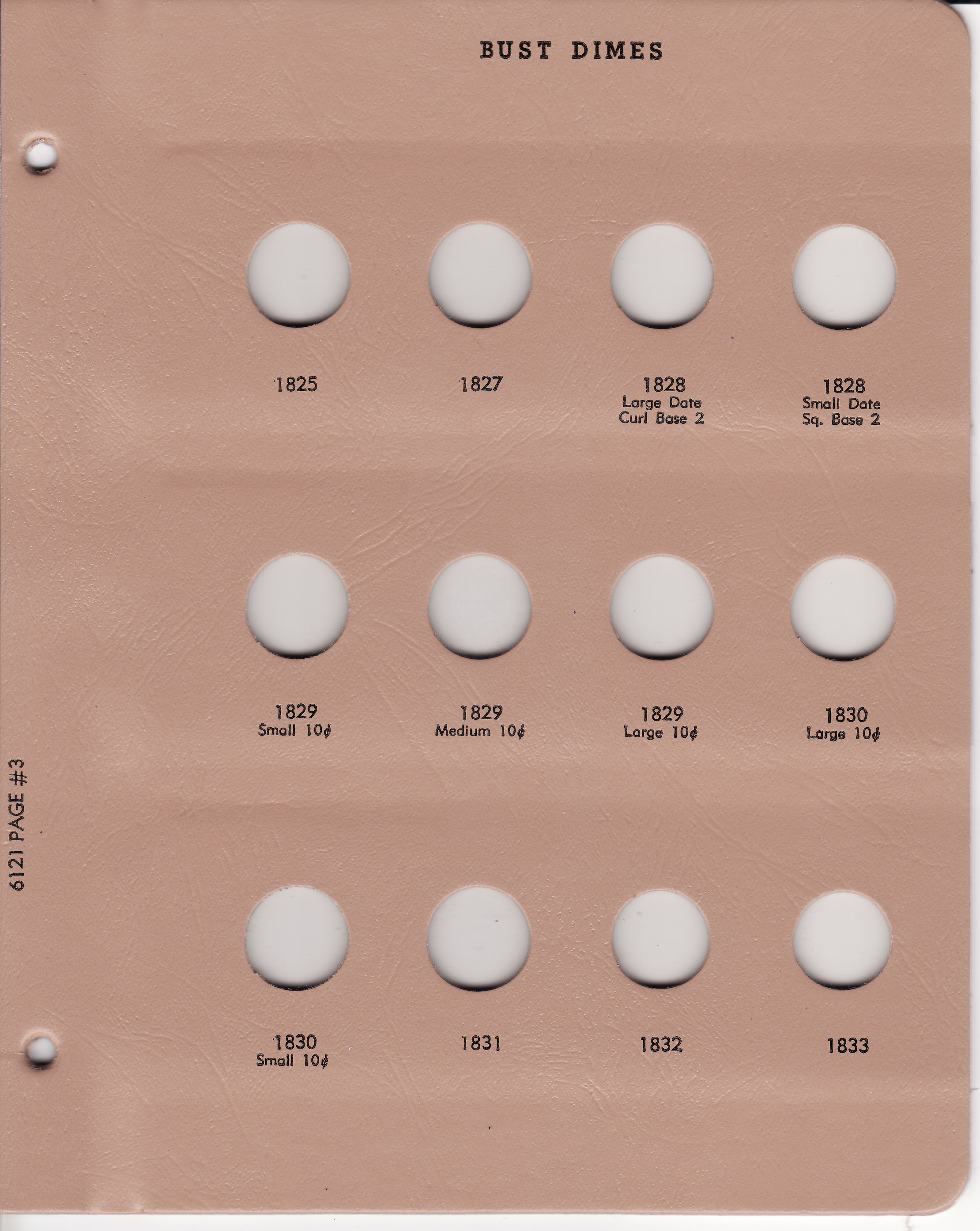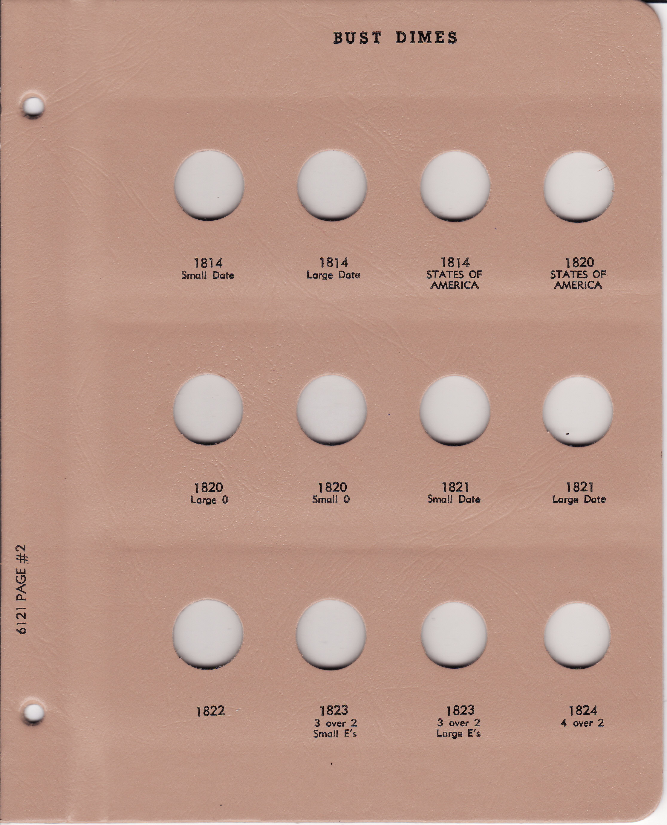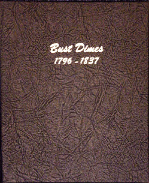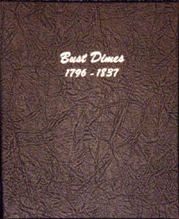 This Dansco Supreme Album for Bust Dime 1796-1837 (Dansco model number 6121) consists of a brown leatherette binder with loose-leaf hinged pages. The binder is gold stamped and the plastic coated pages are tan in color with black lettering. The pages are held in the binder with two posts that screw apart so that pages can be added, removed and replaced with ease. If a slip case is desired, the 3/4 inch slip case is the proper size for this album.