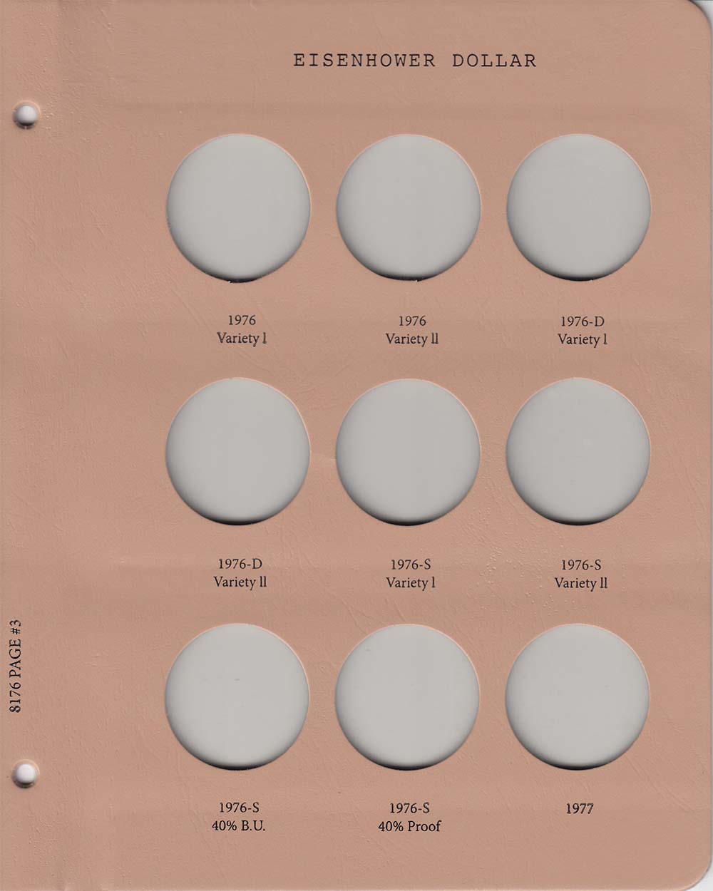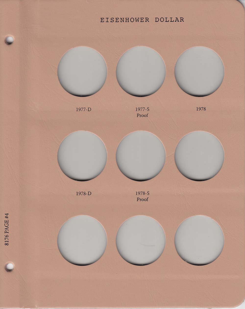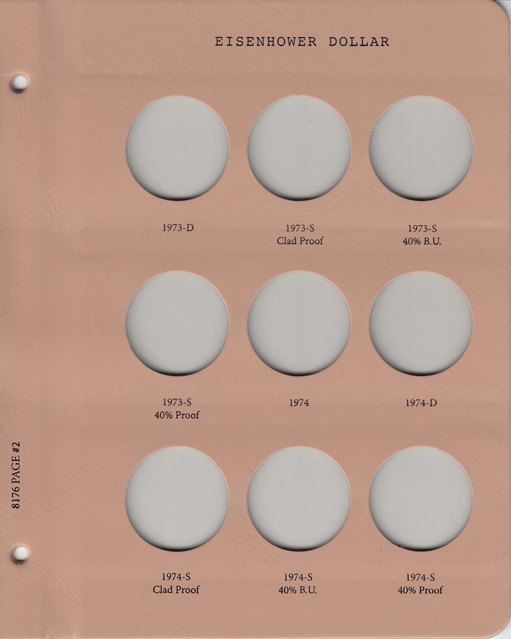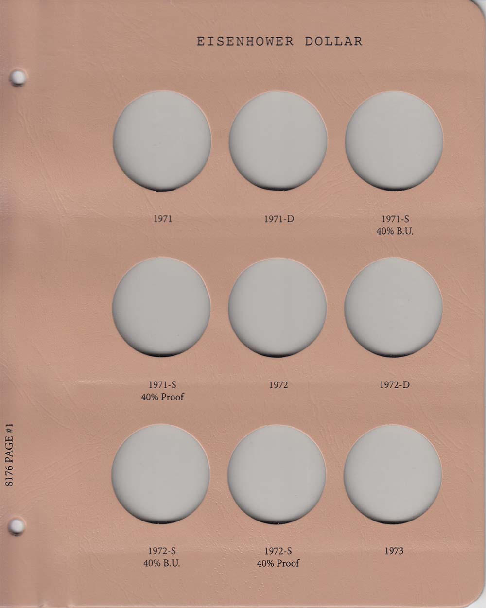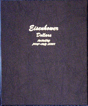This Dansco Supreme Album for Eisenhower Dollars w/ Proof (Dansco model number 8176) consists of a brown leatherette binder with loose-leaf hinged pages. The binder is gold stamped and the plastic coated pages are tan in color with black lettering. The pages are held in the binder with two posts that screw apart so that pages can be added, removed and replaced with ease. If a slip case is desired, the 5/8 inch slip case is the proper size for this album.