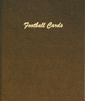 This Dansco Supreme Album for Football Cards (Dansco model number 7017) consists of a brown leatherette binder with loose-leaf vinyl pages. The binder is gold stamped. The pages are held in the binder with two posts that screw apart so that pages can be added, removed and replaced with ease. Each of the fifteen vinyl pages contains four pockets per page for a total of 60 pockets. If a slip case is desired, the 1-1/8 inch slip case is the proper size for this album.