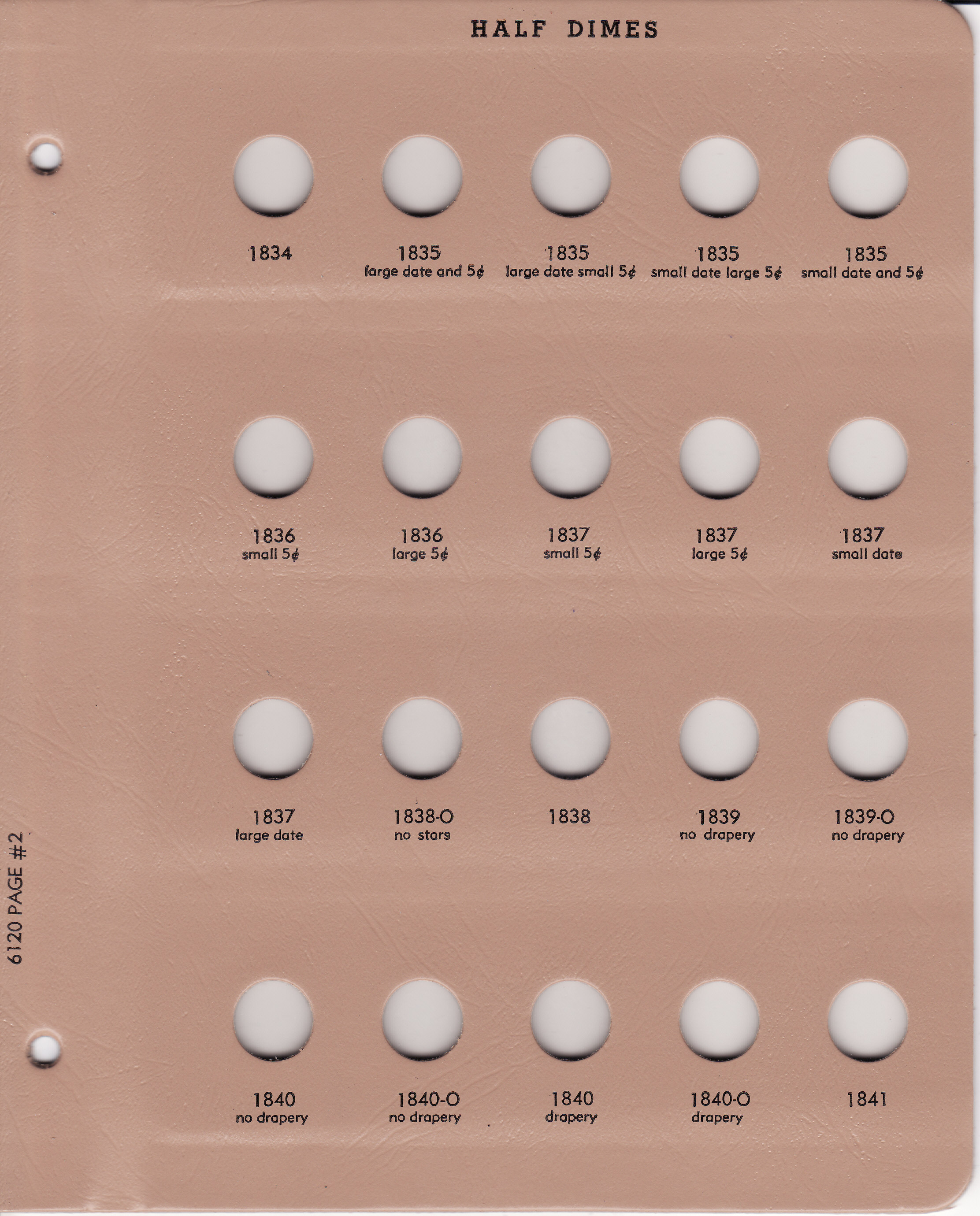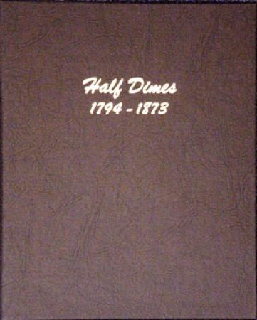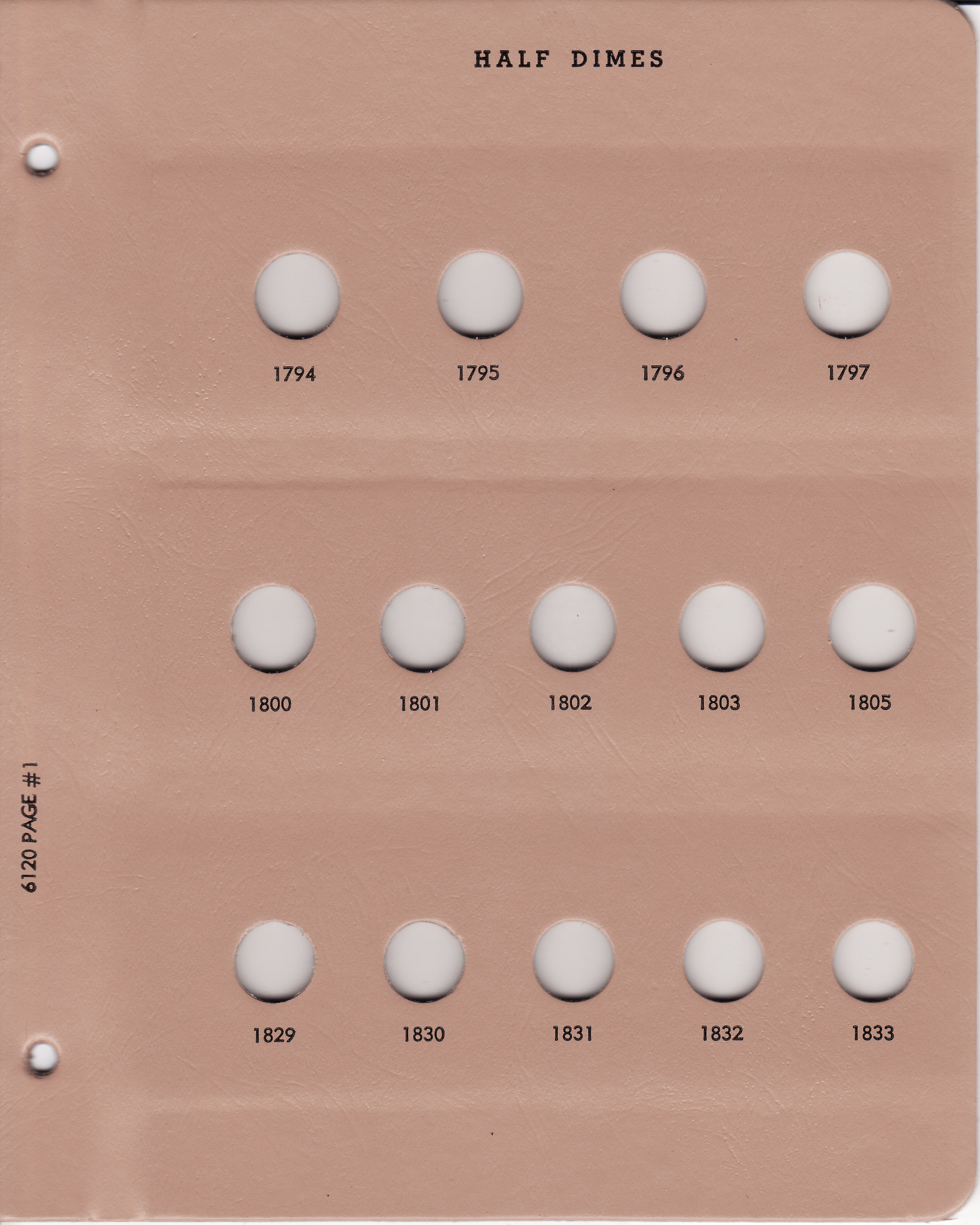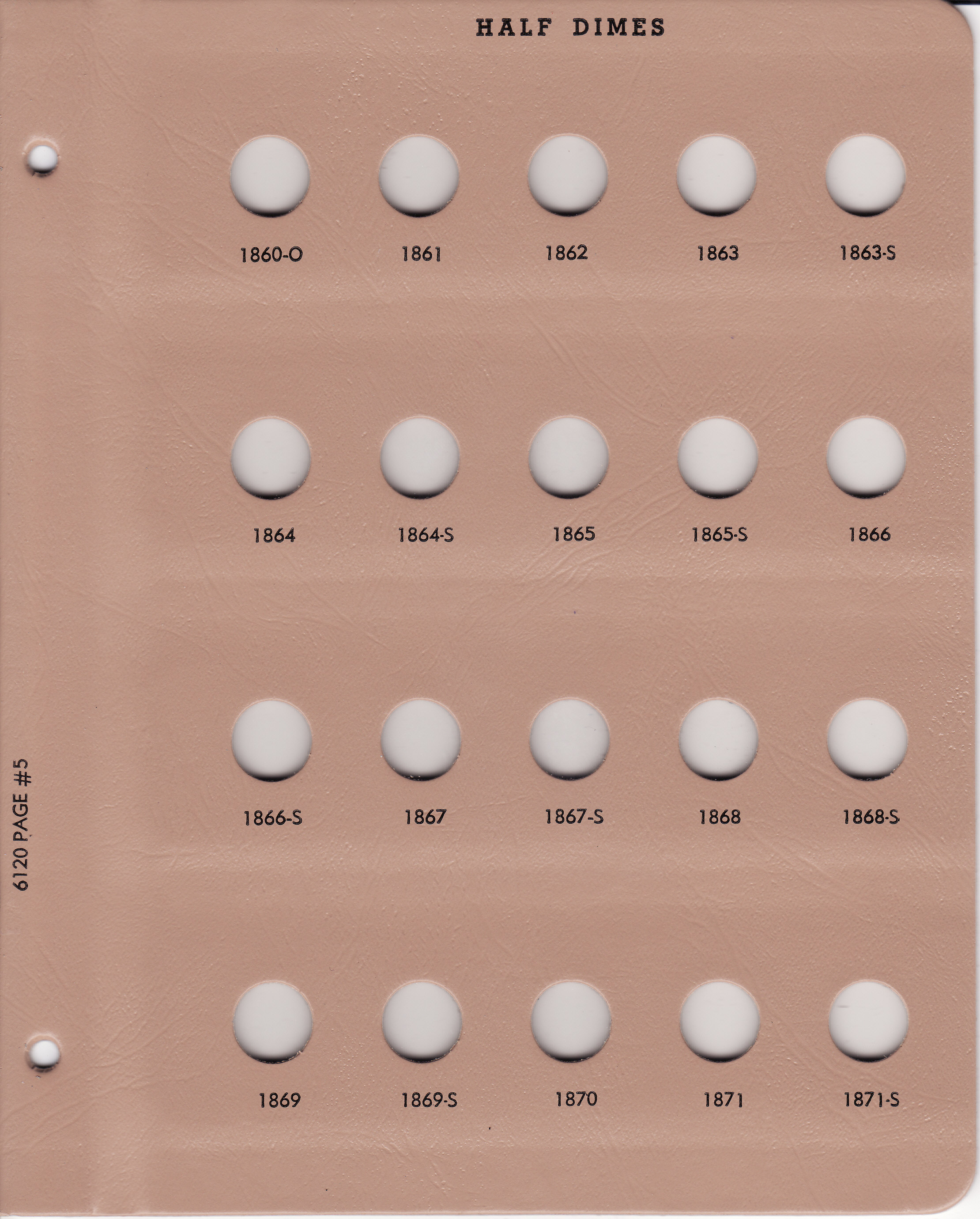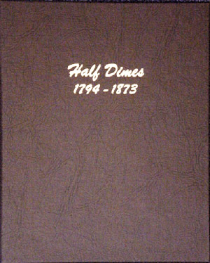 This Dansco Supreme Album for Half Dimes 1794-1873 (Dansco model number 6120) consists of a brown leatherette binder with loose-leaf hinged pages. The binder is gold stamped and the plastic coated pages are tan in color with black lettering. The pages are held in the binder with two posts that screw apart so that pages can be added, removed and replaced with ease. If a slip case is desired, the 1 inch slip case is the proper size for this album.