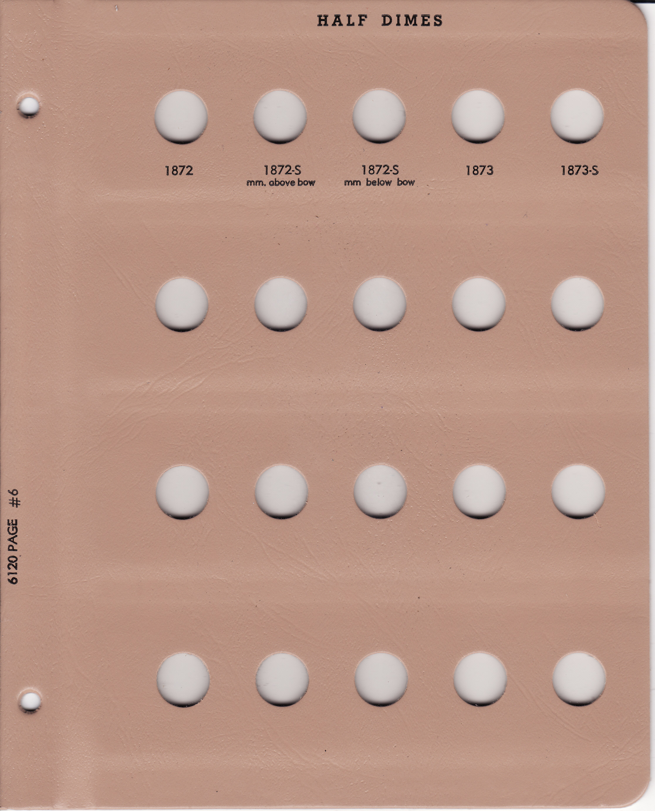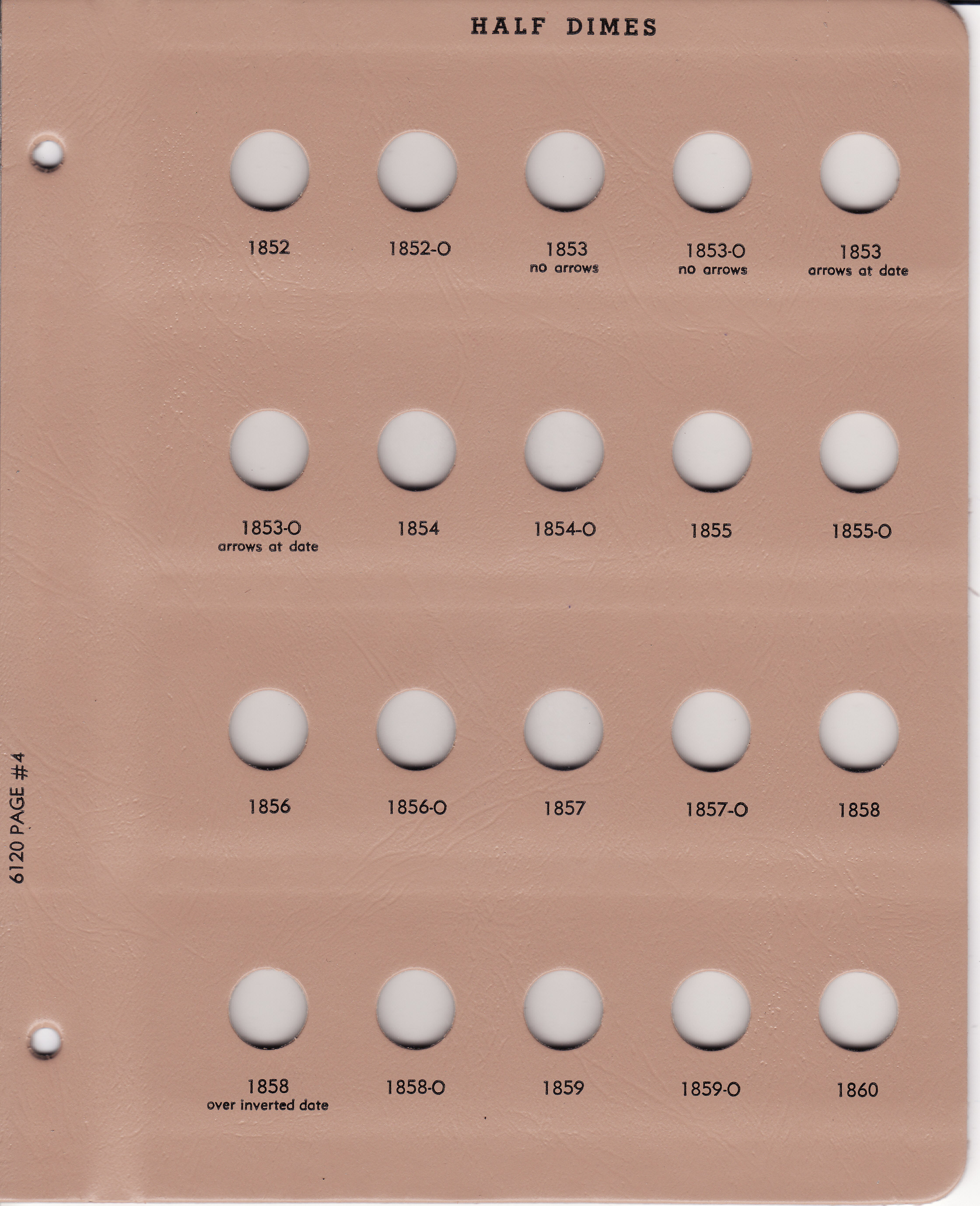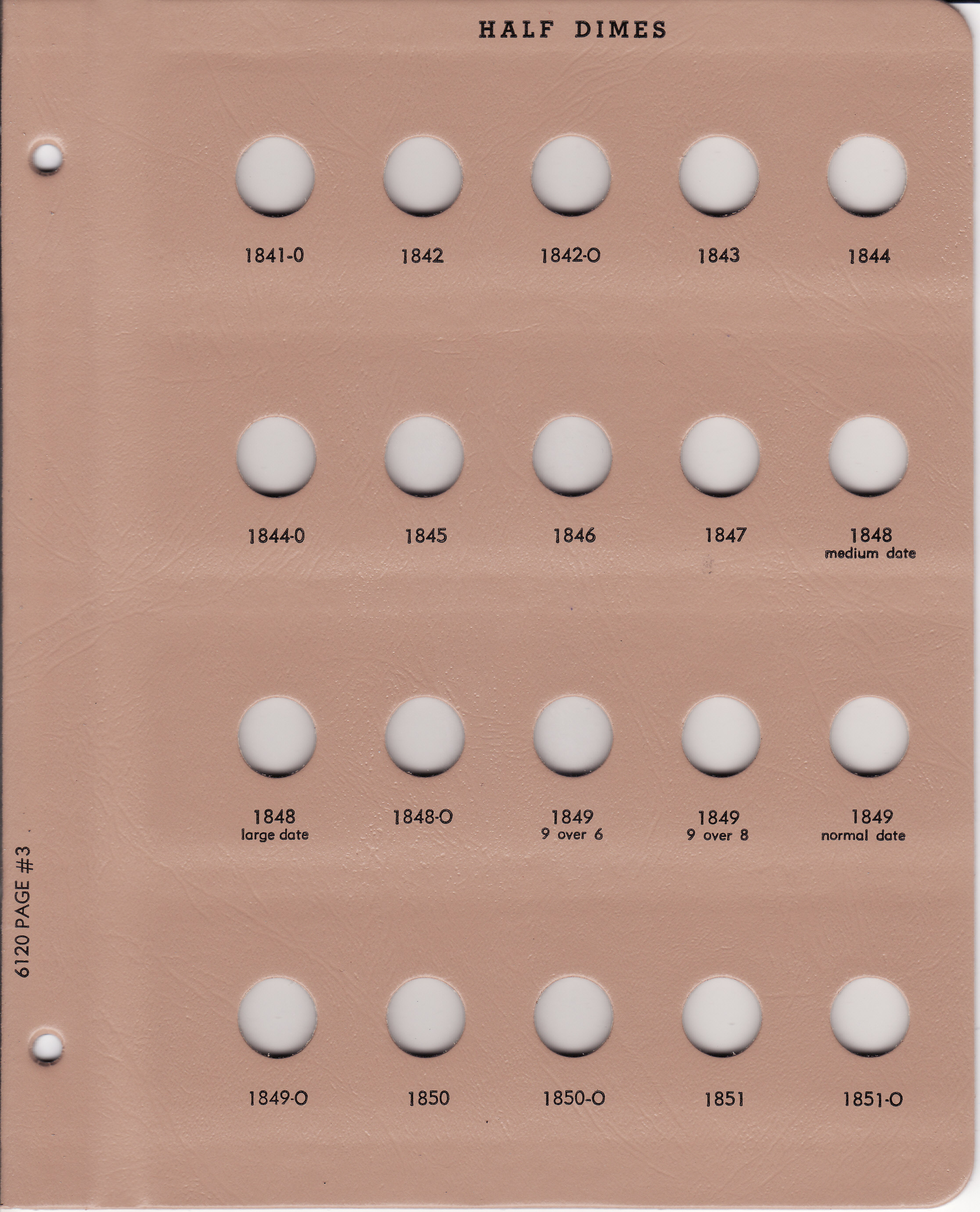 This Dansco Supreme Album for Half Dimes 1794-1873 (Dansco model number 6120) consists of a brown leatherette binder with loose-leaf hinged pages. The binder is gold stamped and the plastic coated pages are tan in color with black lettering. The pages are held in the binder with two posts that screw apart so that pages can be added, removed and replaced with ease. If a slip case is desired, the 1 inch slip case is the proper size for this album.