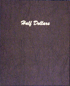 This Dansco Supreme Album for Half Dollars Plain (Dansco model number 7157) consists of a brown leatherette binder with loose-leaf hinged pages. The binder is gold stamped and the plastic coated pages are tan in color with black lettering. The pages are held in the binder with two posts that screw apart so that pages can be added, removed and replaced with ease. The album includes four pages with 20 ports on each page. Each page is titled Half Dollars but the individual ports are unlabeled. If a slip case is desired, the 5/8 inch slip case is the proper size for this album.
