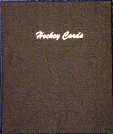 This Dansco Supreme Album for Hockey Cards (Dansco model number 7018) consists of a brown leatherette binder with loose-leaf vinyl pages. The binder is gold stamped. The pages are held in the binder with two posts that screw apart so that pages can be added, removed and replaced with ease. Each of the fifteen vinyl pages contains four pockets per page for a total of 60 pockets. If a slip case is desired, the 5/8 inch slip case is the proper size for this album.