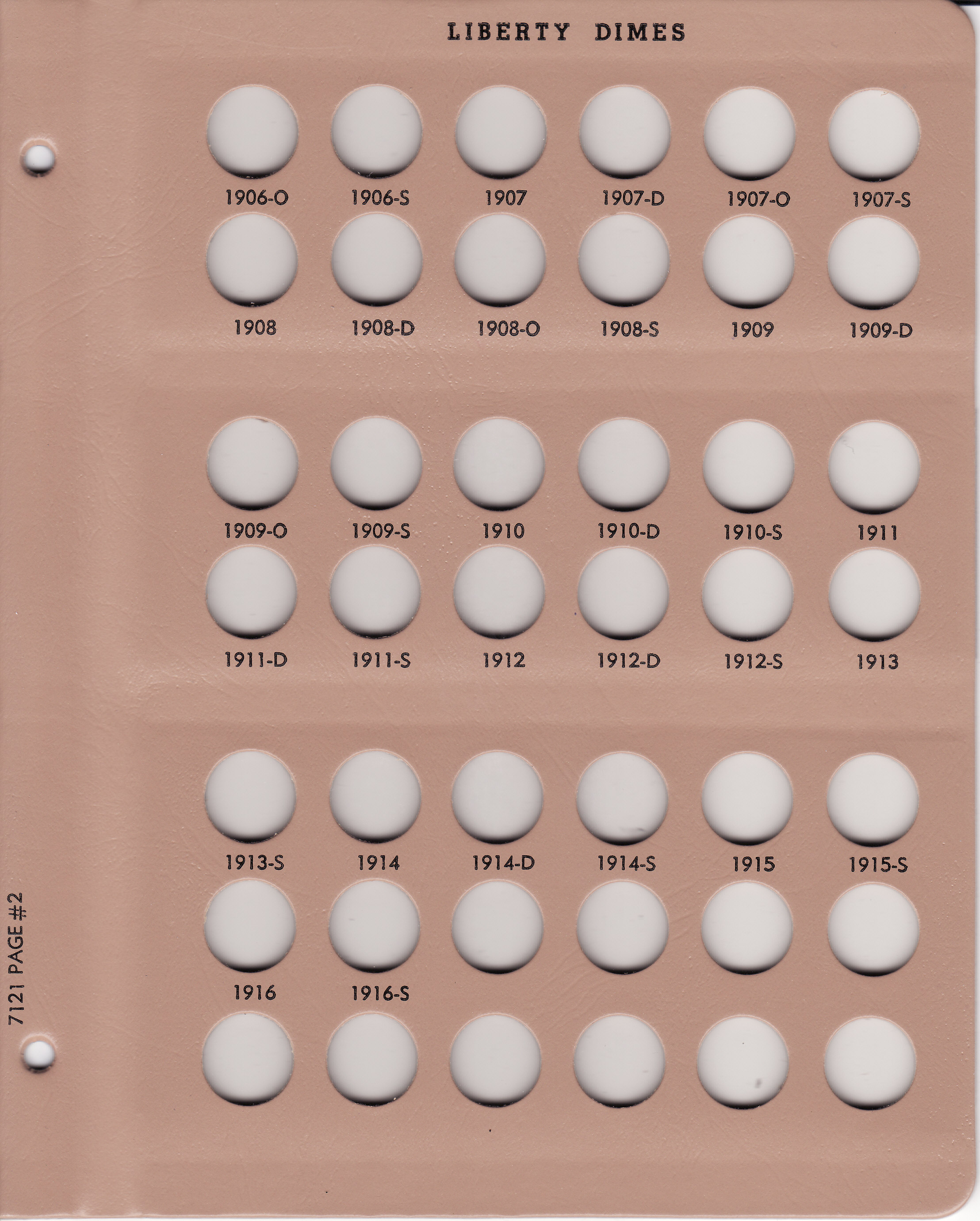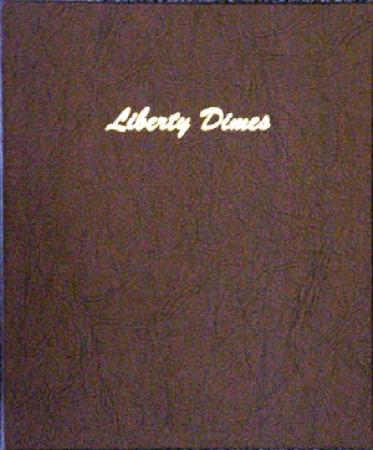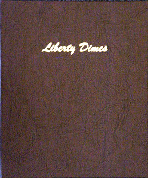 This Dansco Supreme Album for Liberty Head Barber Dimes (Dansco model number 7121) consists of a brown leatherette binder with loose-leaf hinged pages. The binder is gold stamped and the plastic coated pages are tan in color with black lettering. The pages are held in the binder with two posts that screw apart so that pages can be added, removed and replaced with ease. If a slip case is desired, the 5/8 inch slip case is the proper size for this album.