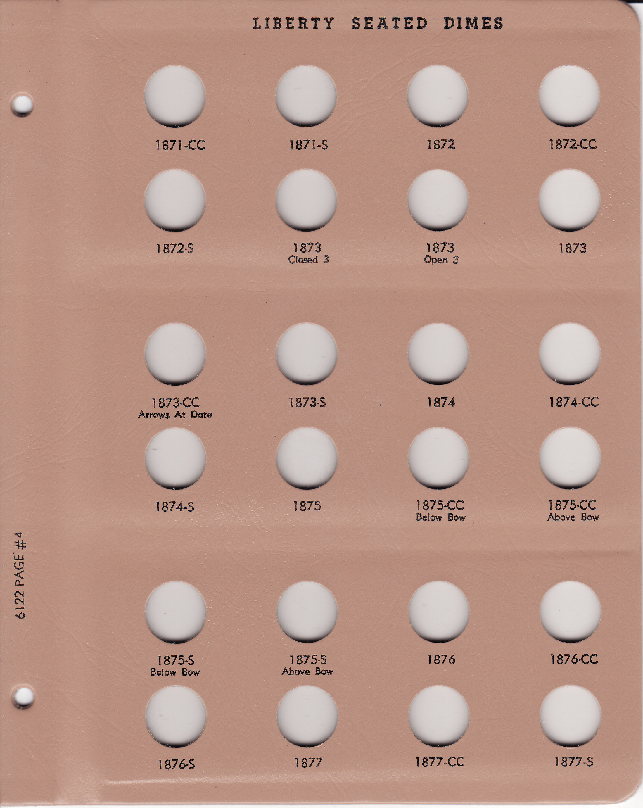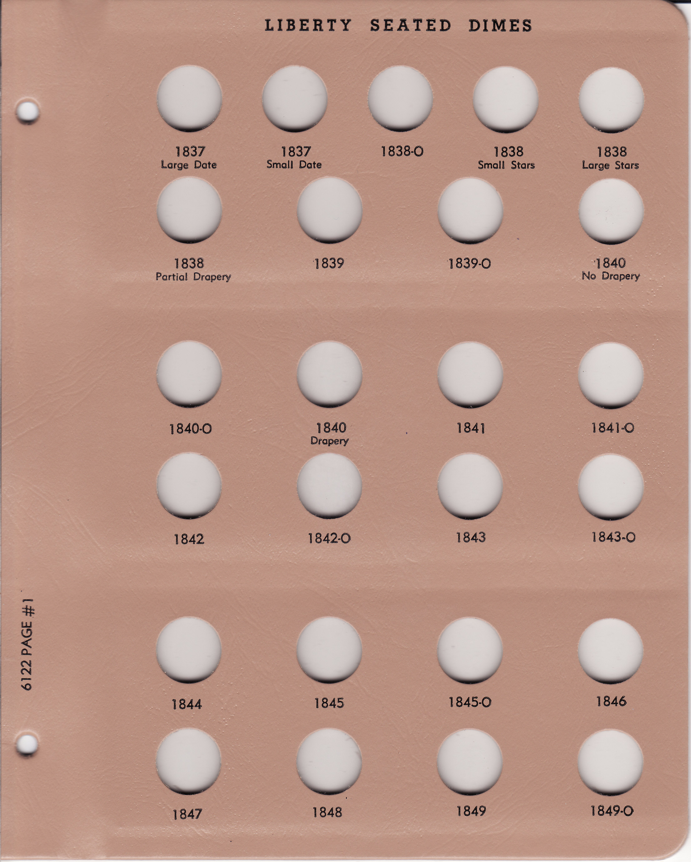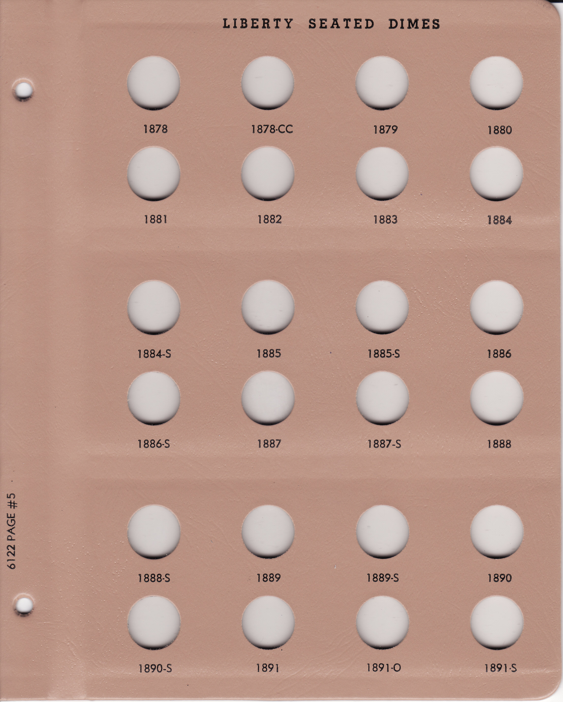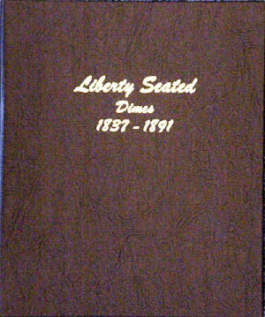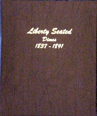 This Dansco Supreme Album for Liberty Seated Dimes 1837-1891 (Dansco model number 6122) consists of a brown leatherette binder with loose-leaf hinged pages. The binder is gold stamped and the plastic coated pages are tan in color with black lettering. The pages are held in the binder with two posts that screw apart so that pages can be added, removed and replaced with ease. If a slip case is desired, the 7/8 inch slip case is the proper size for this album.