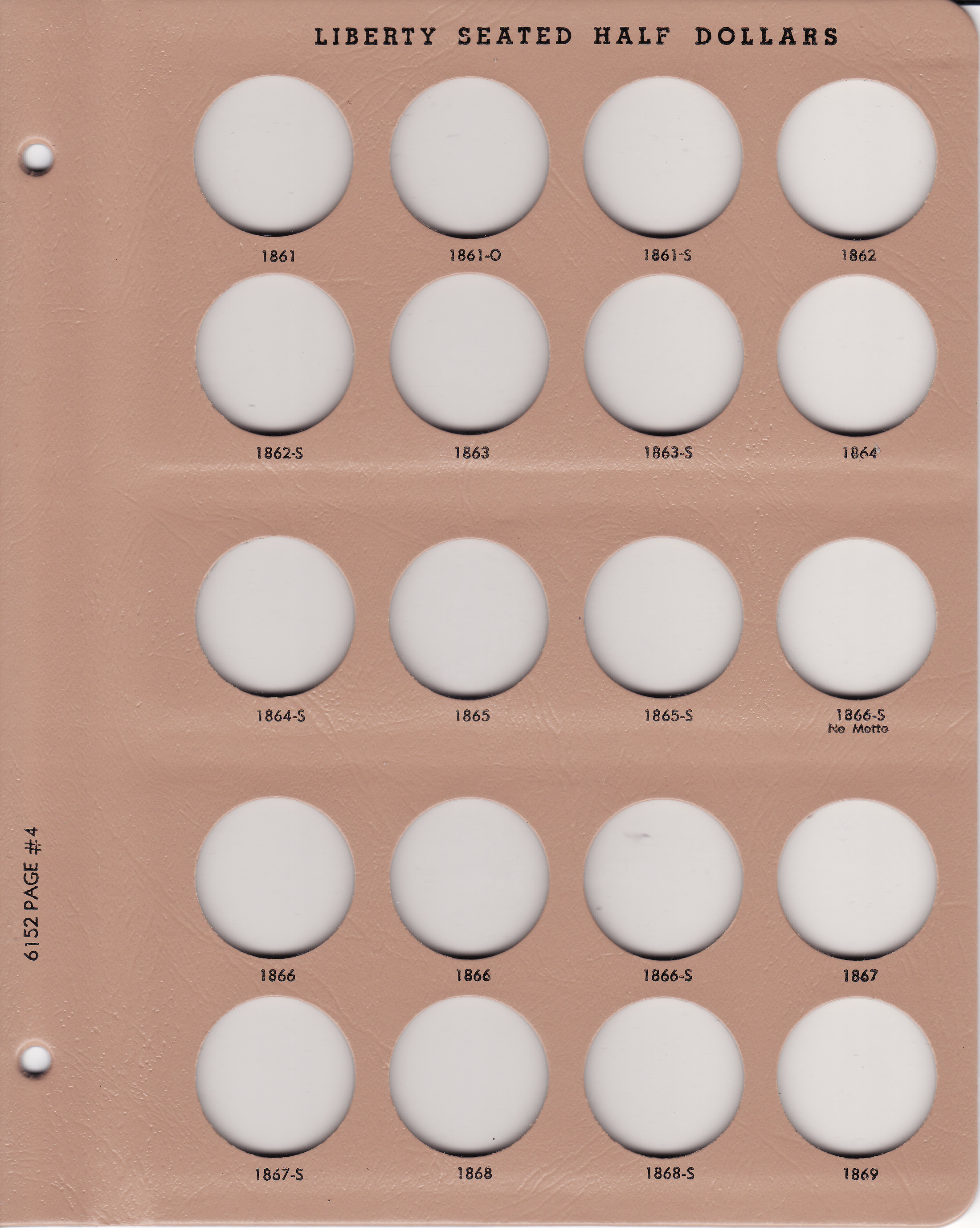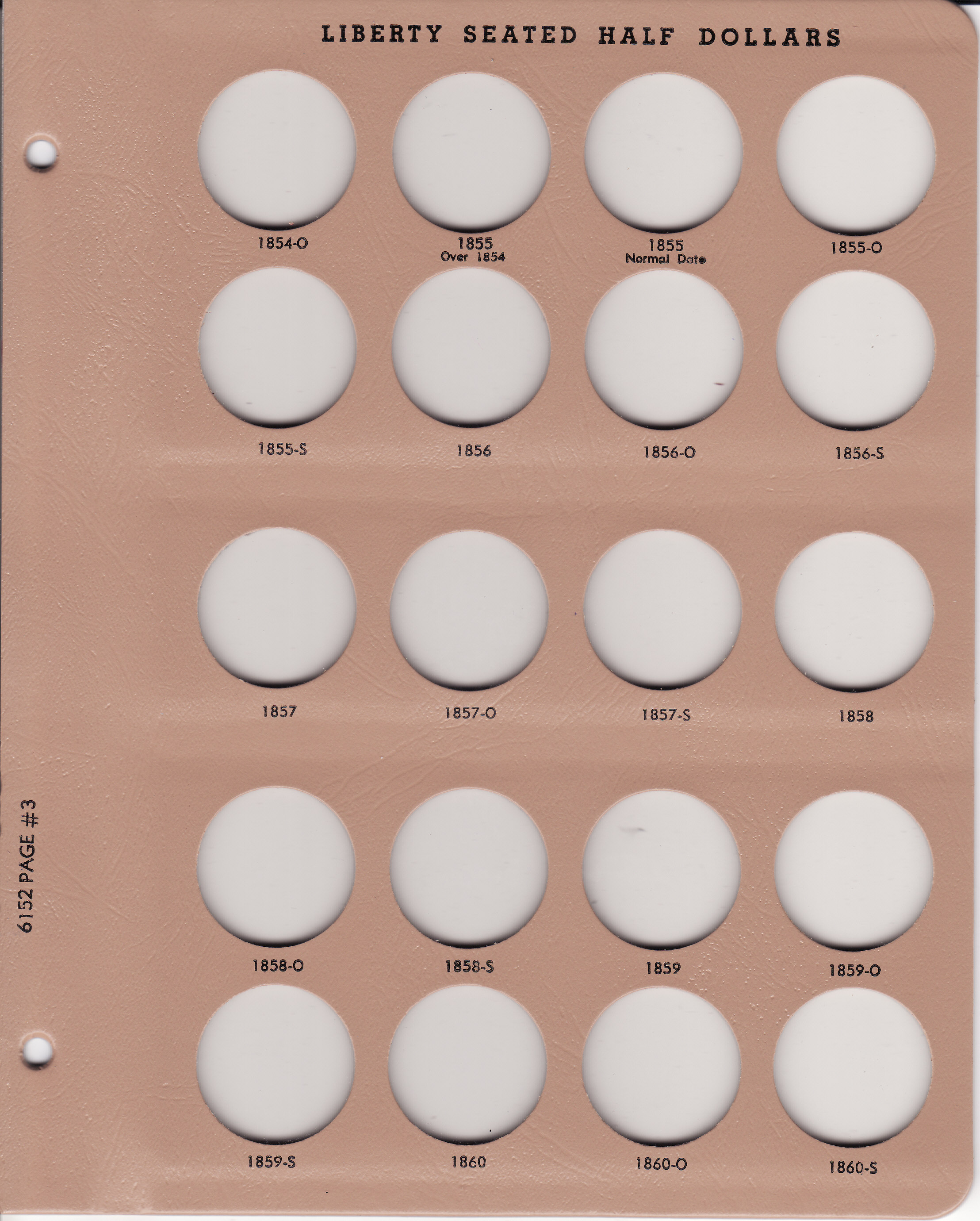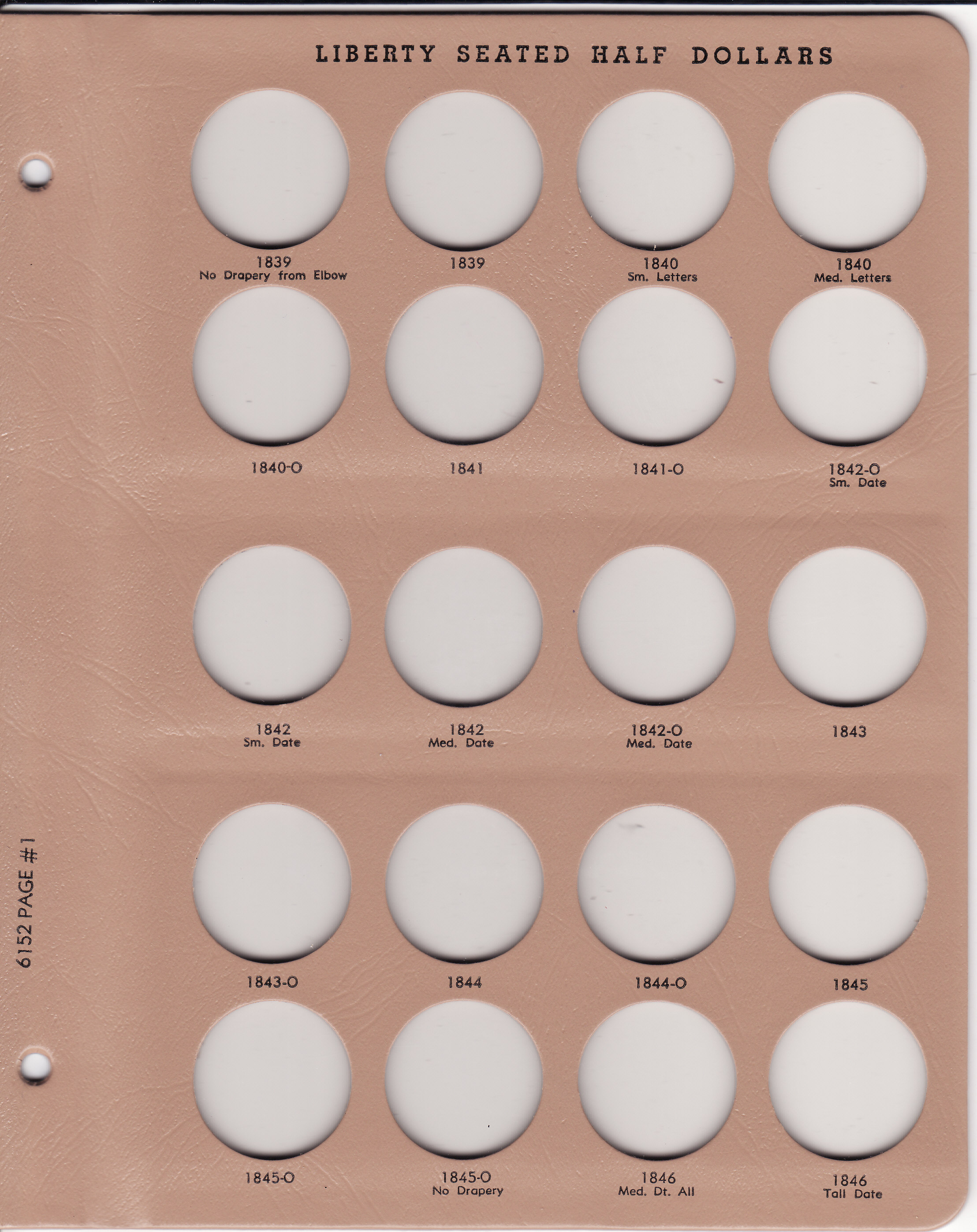 This Dansco Supreme Album for Liberty Seated Half Dollars 1839-1891 (Dansco model number 6152) consists of a brown leatherette binder with loose-leaf hinged pages. The binder is gold stamped and the plastic coated pages are tan in color with black lettering. The pages are held in the binder with two posts that screw apart so that pages can be added, removed and replaced with ease. If a slip case is desired, the 1-1/8 inch slip case is the proper size for this album.