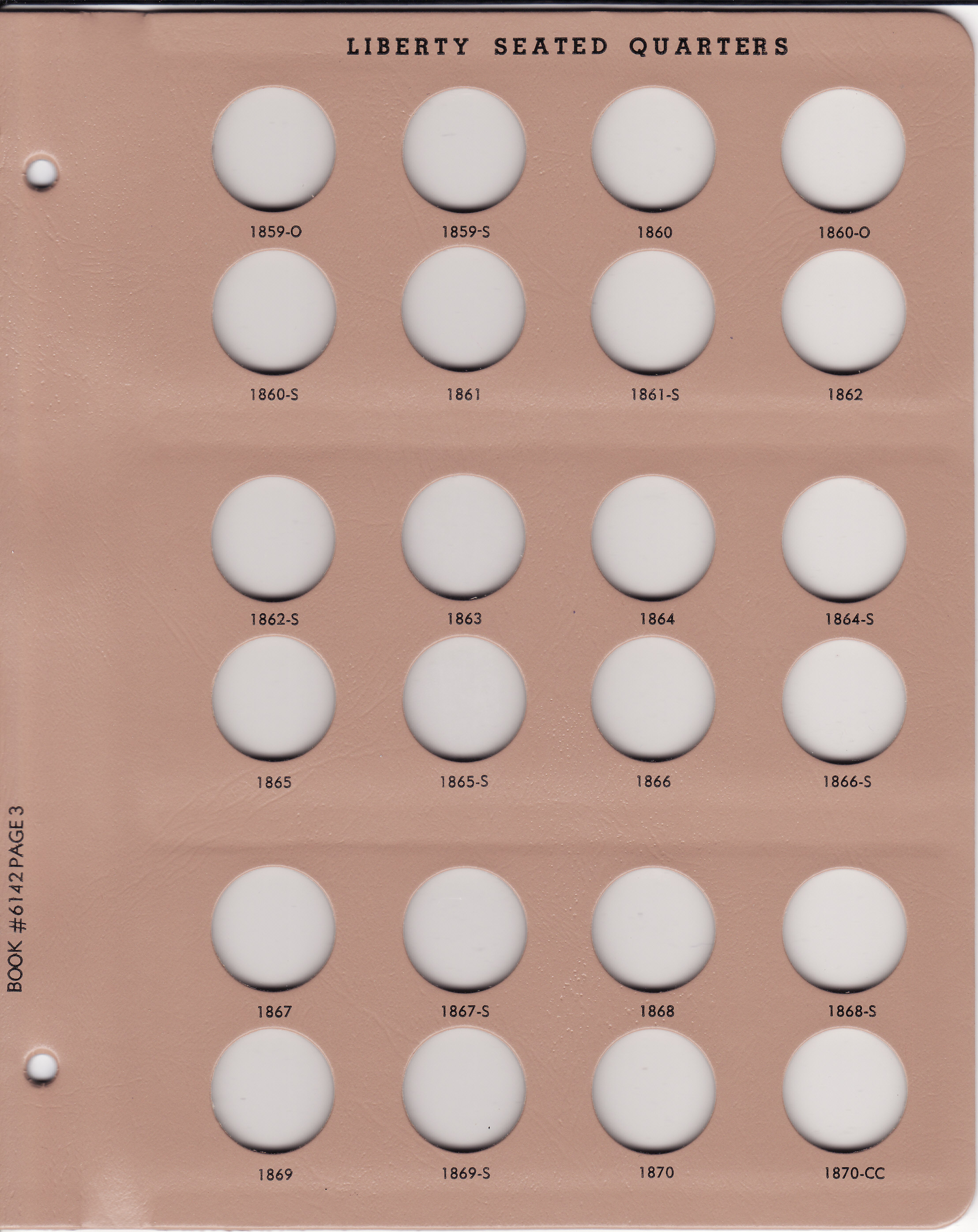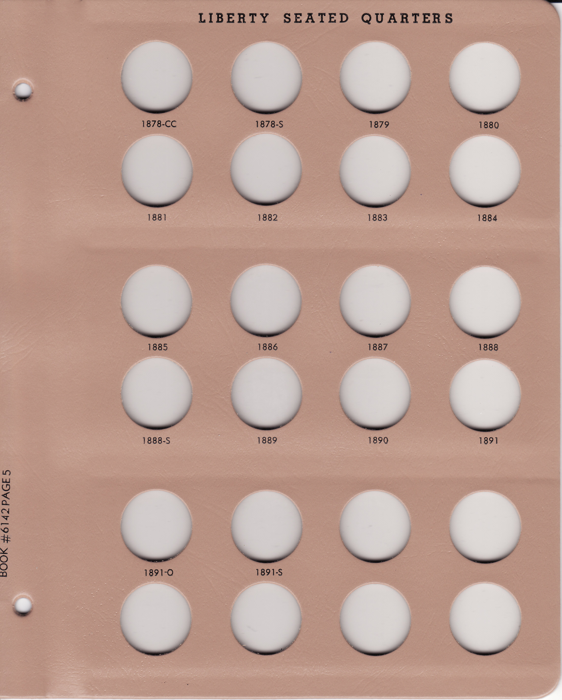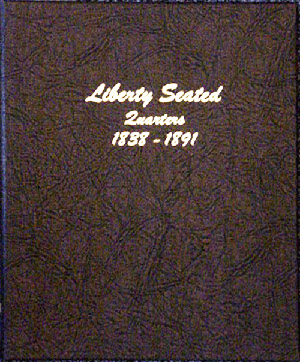 This Dansco Supreme Album for Liberty Seated Quarters 1838-1891 (Dansco model number 6142) consists of a brown leatherette binder with loose-leaf hinged pages. The binder is gold stamped and the plastic coated pages are tan in color with black lettering. The pages are held in the binder with two posts that screw apart so that pages can be added, removed and replaced with ease. If a slip case is desired, the 7/8 inch slip case is the proper size for this album.