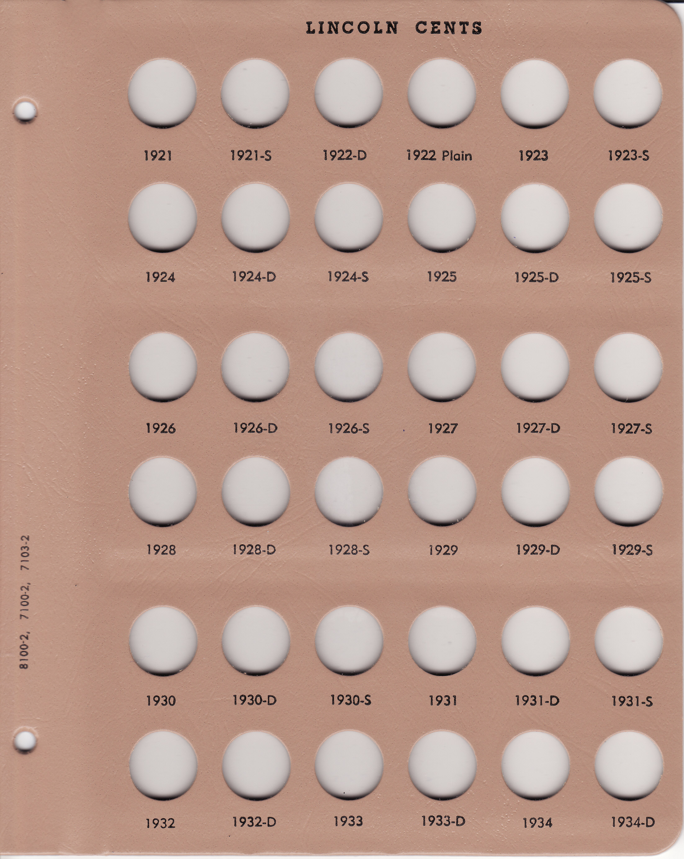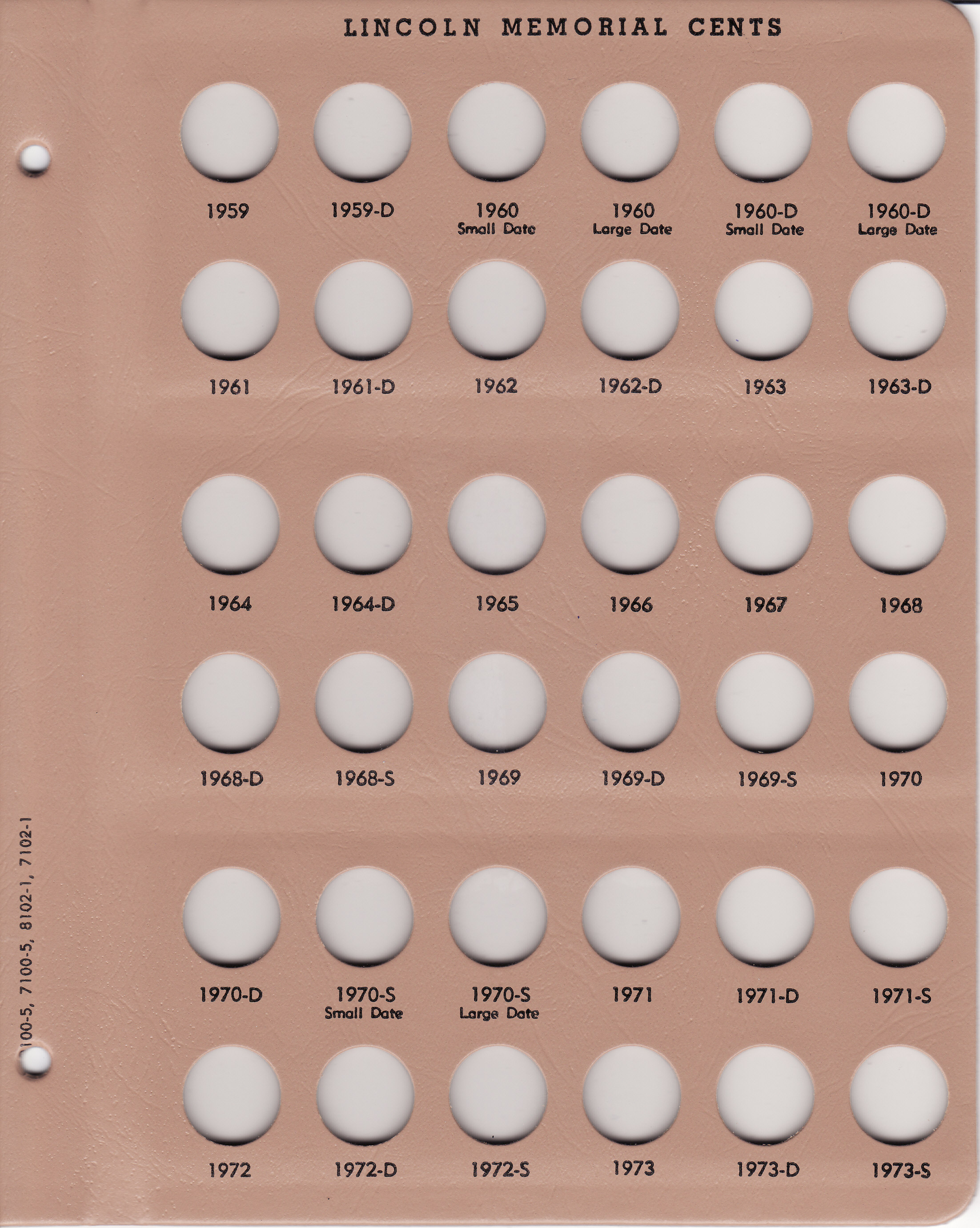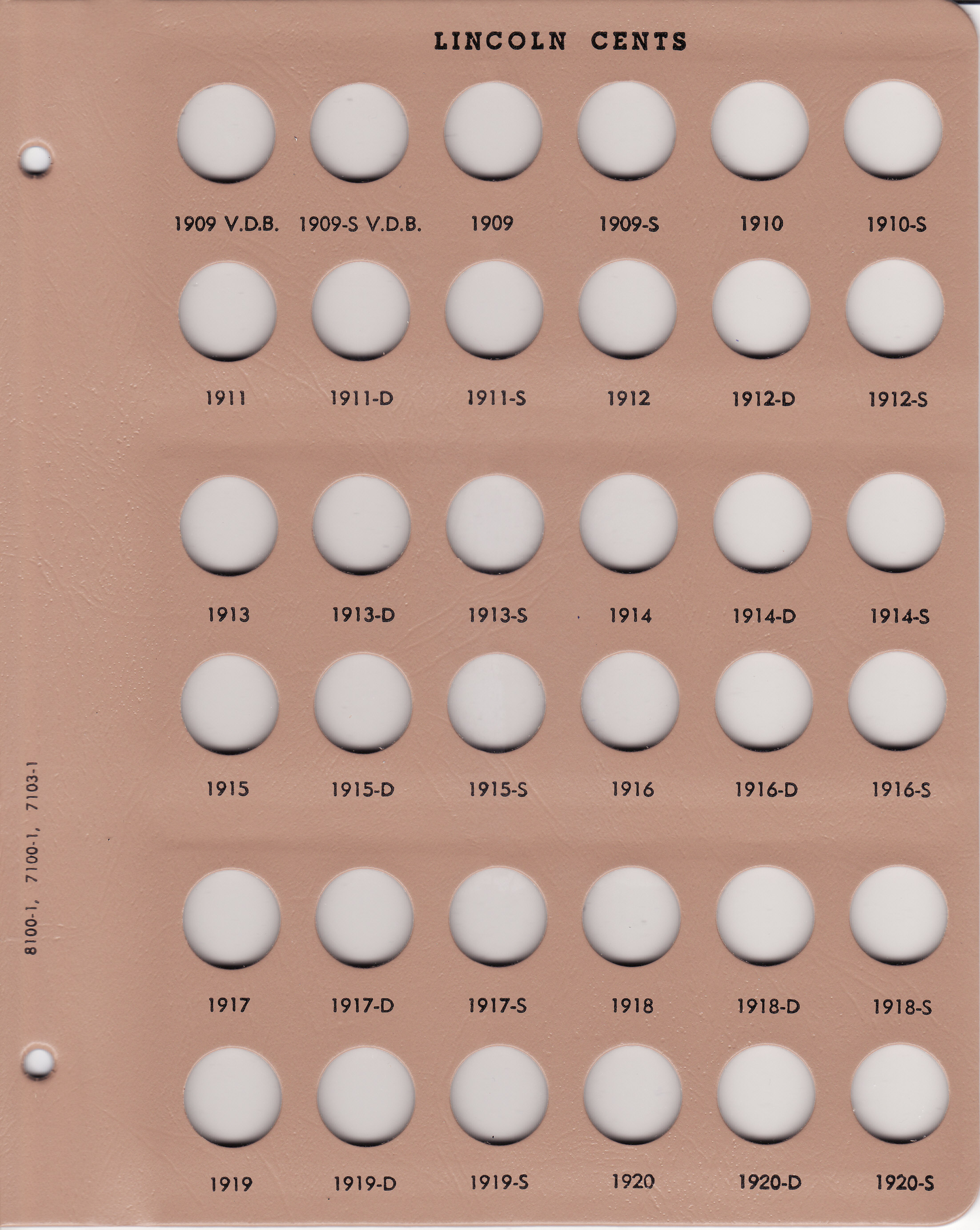 This Dansco Supreme Album for Lincoln Cents 1909-2009 (Dansco model number 7100) consists of a brown leatherette binder with loose-leaf hinged pages. The binder is gold stamped and the plastic coated pages are tan in color with black lettering. The pages are held in the binder with two posts that screw apart so that pages can be added, removed and replaced with ease. If a slip case is desired, the 1-1/4 inch slip case is the proper size for this album.