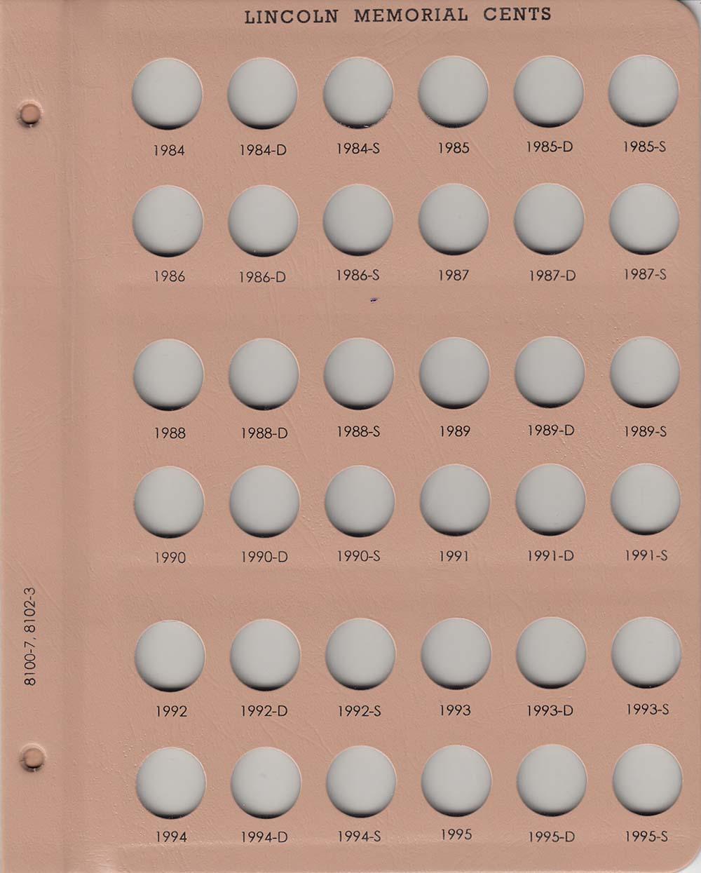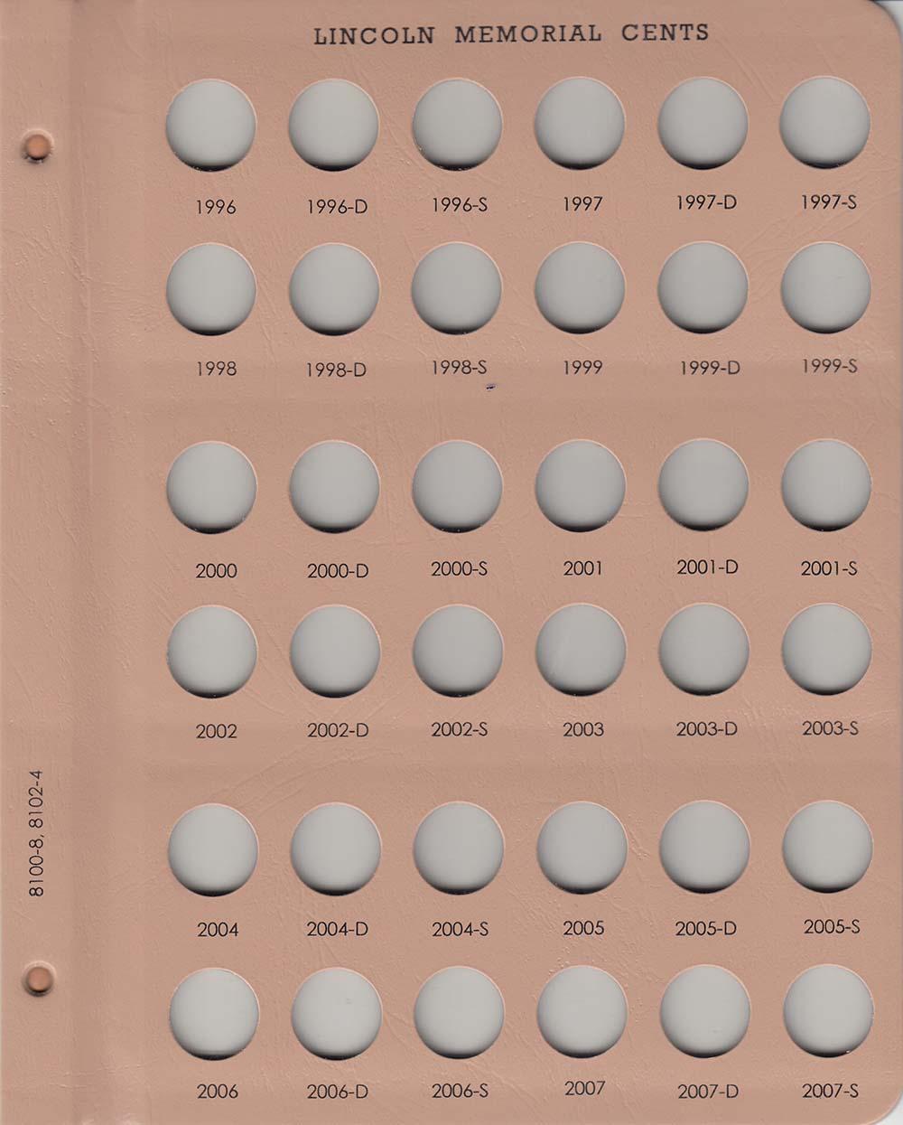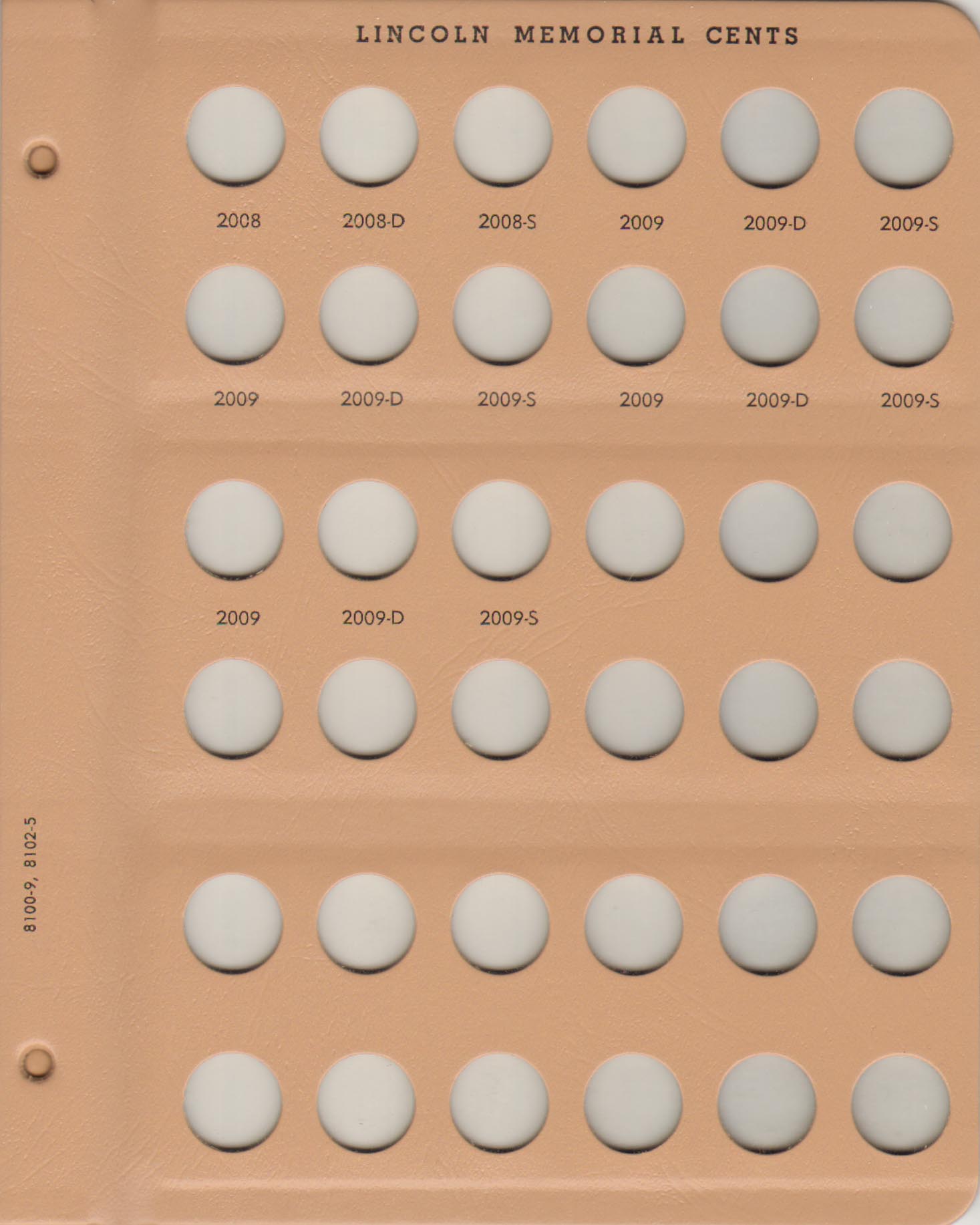 This Dansco Supreme Album for Lincoln Memorial Cents 1959-2009 w/ Proof (Dansco model number 8102) consists of a brown leatherette binder with loose-leaf hinged pages. The binder is gold stamped and the plastic coated pages are tan in color with black lettering. The pages are held in the binder with two posts that screw apart so that pages can be added, removed and replaced with ease. If a slip case is desired, the 7/8 inch slip case is the proper size for this album.