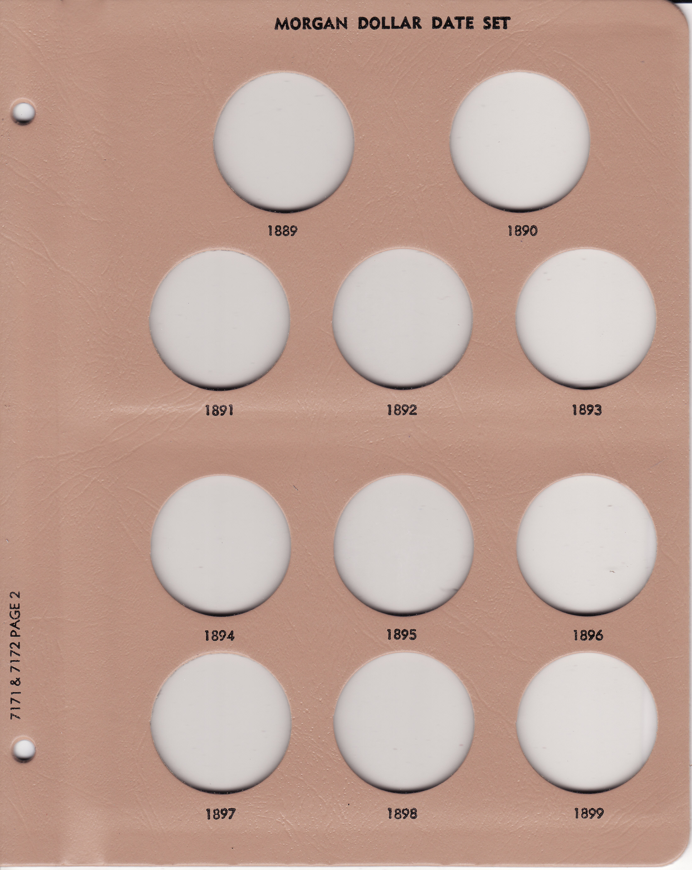 This Dansco Supreme Album for Morgan Dollars Date Set 1878-1921 (Dansco model number 7171) consists of a brown leatherette binder with loose-leaf hinged pages. The binder is gold stamped and the plastic coated pages are tan in color with black lettering. The pages are held in the binder with two posts that screw apart so that pages can be added, removed and replaced with ease. If a slip case is desired, the 5/8 inch slip case is the proper size for this album.