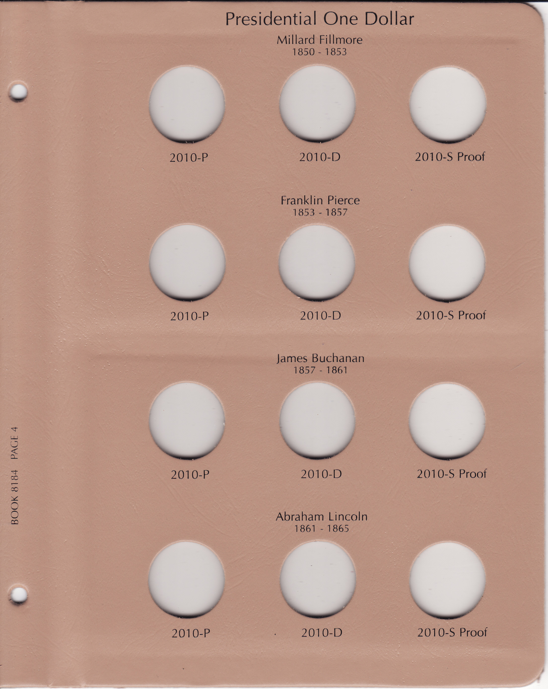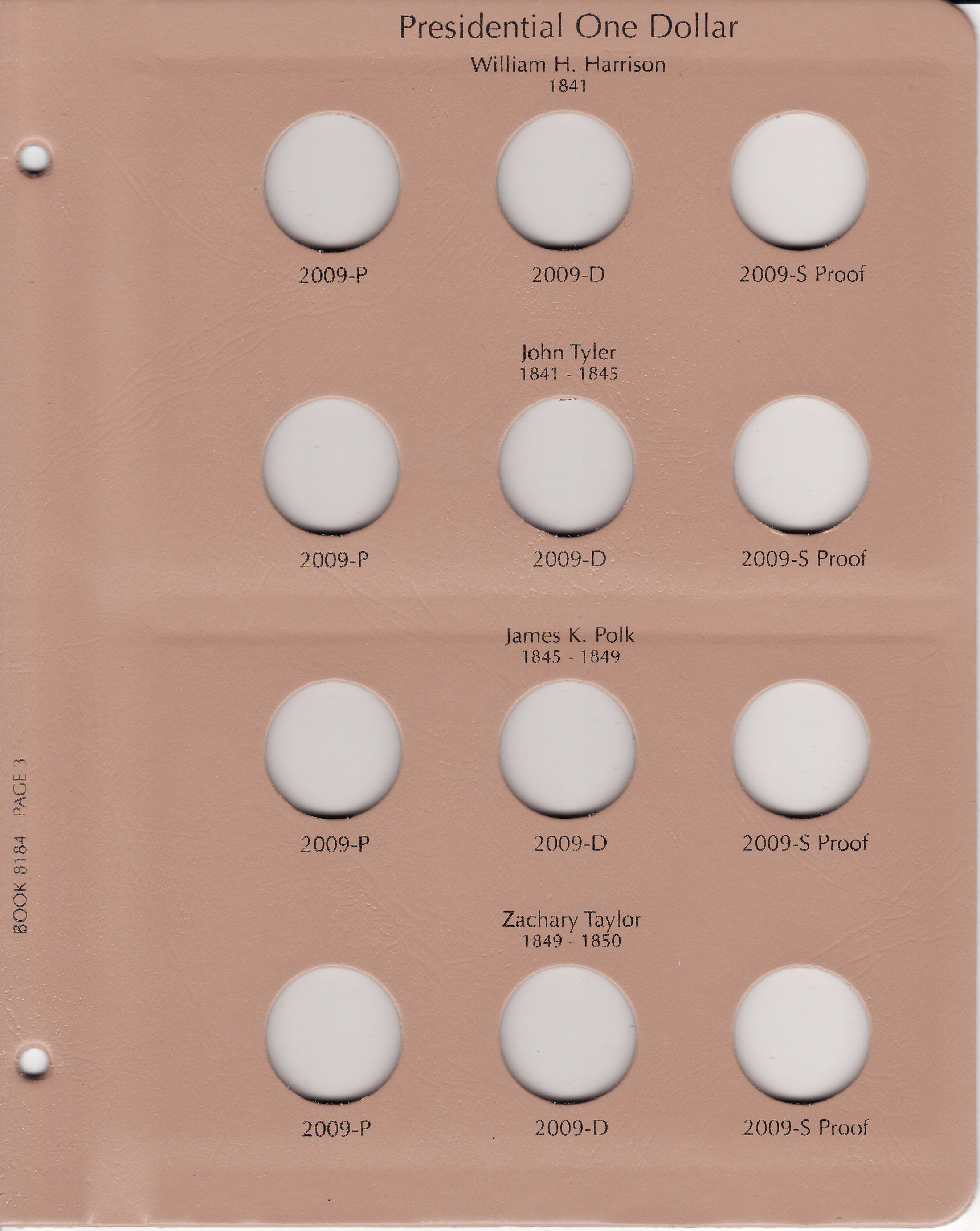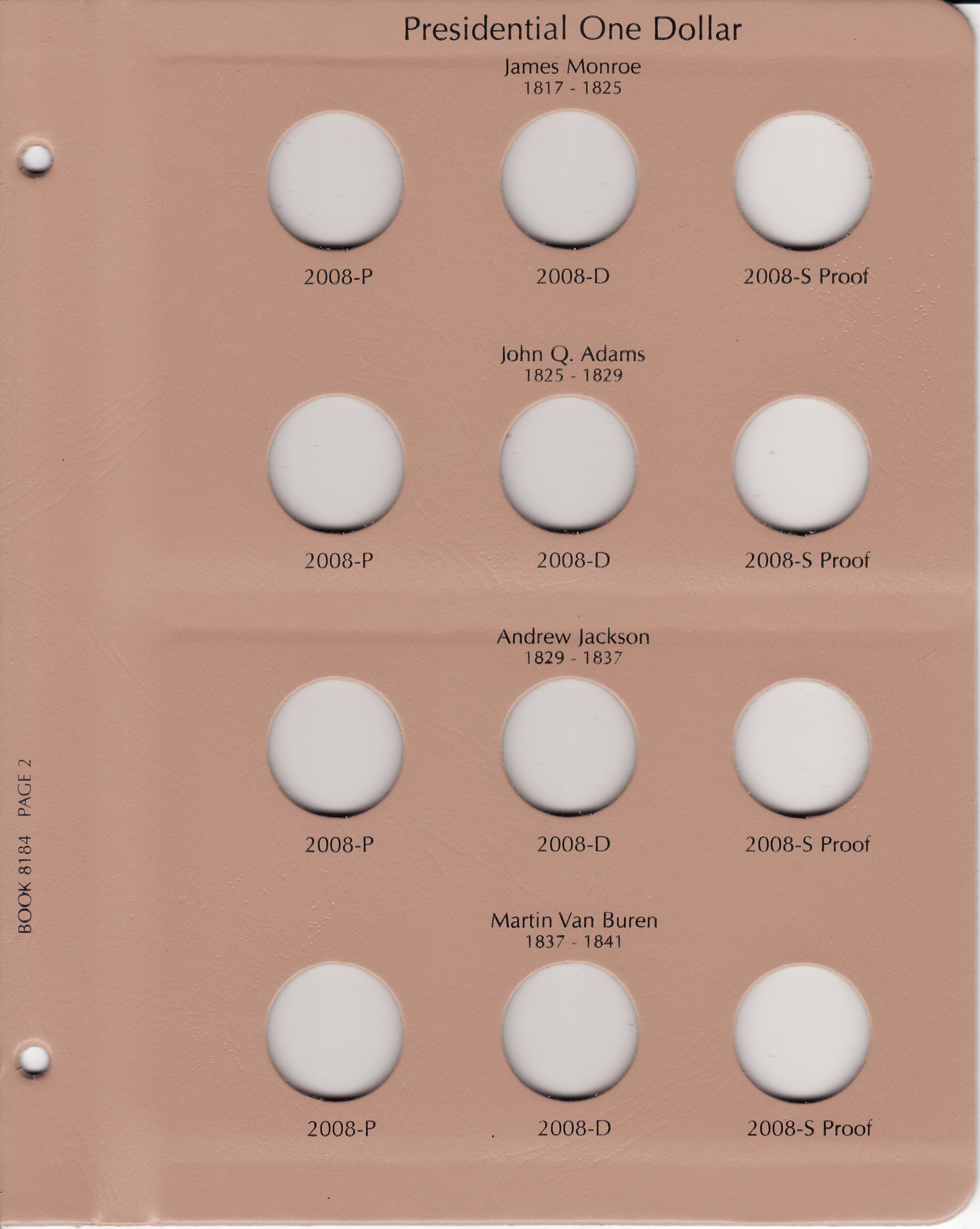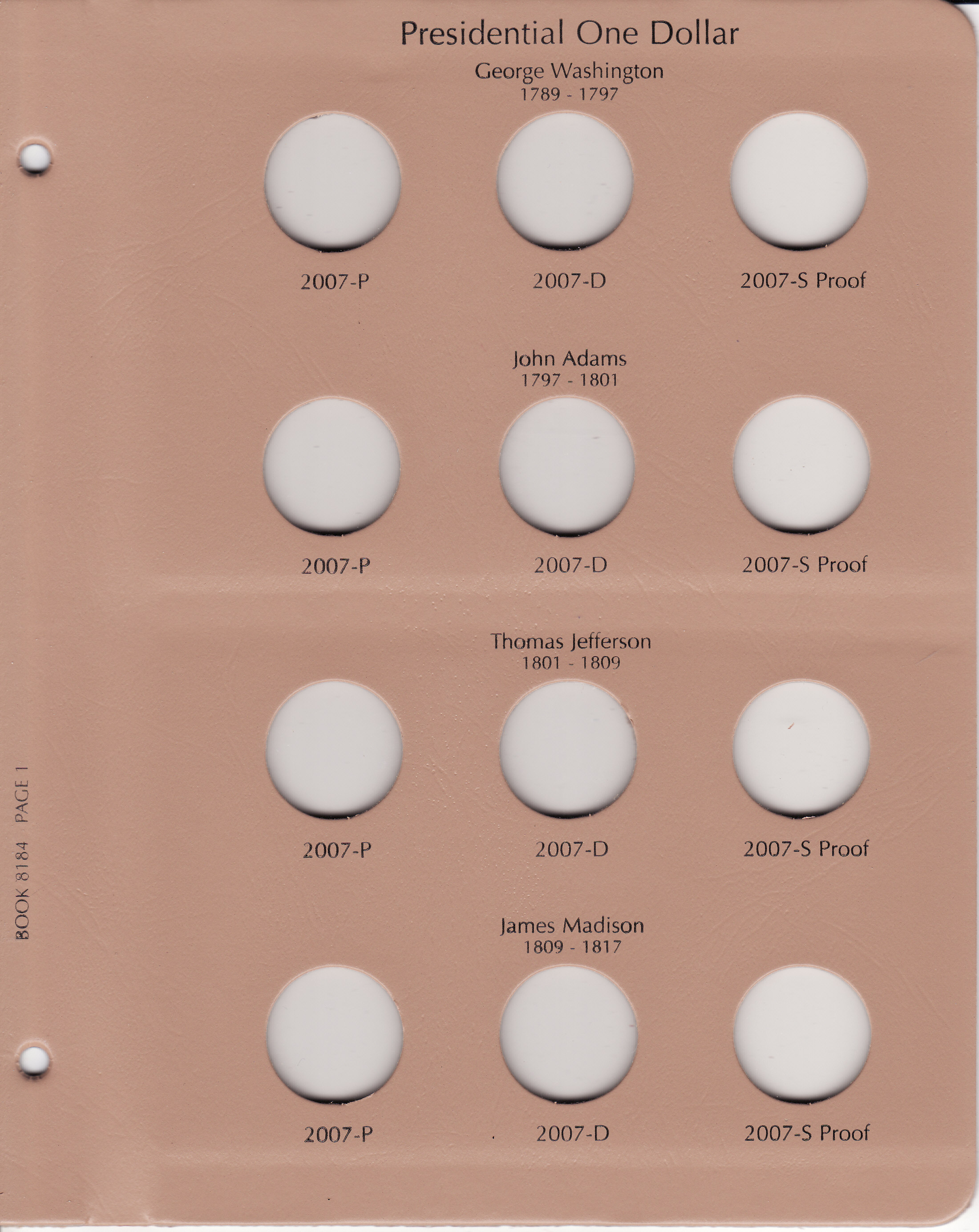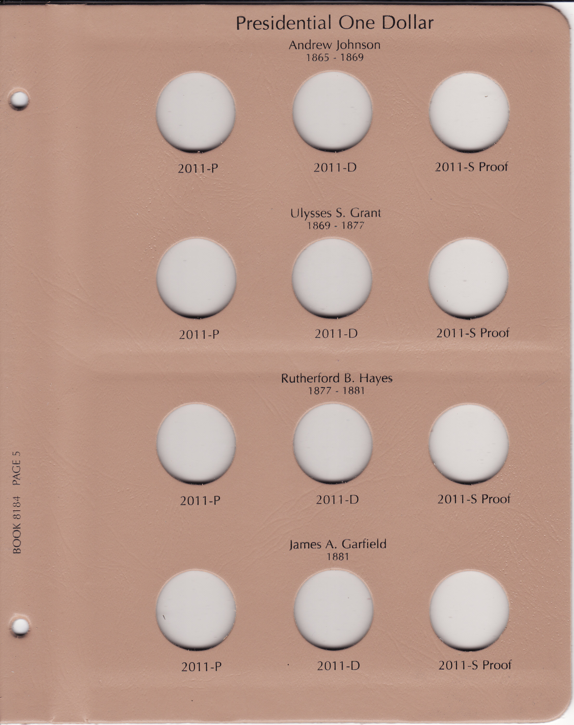 This Dansco Supreme Album for Presidential Dollars 2007-2011 w/ Proof (Dansco model number 8184) consists of a brown leatherette binder with loose-leaf hinged pages. The binder is gold stamped and the plastic coated pages are tan in color with black lettering. The pages are held in the binder with two posts that screw apart so that pages can be added, removed and replaced with ease. If a slip case is desired, the 7/8 inch slip case is the proper size for this album.