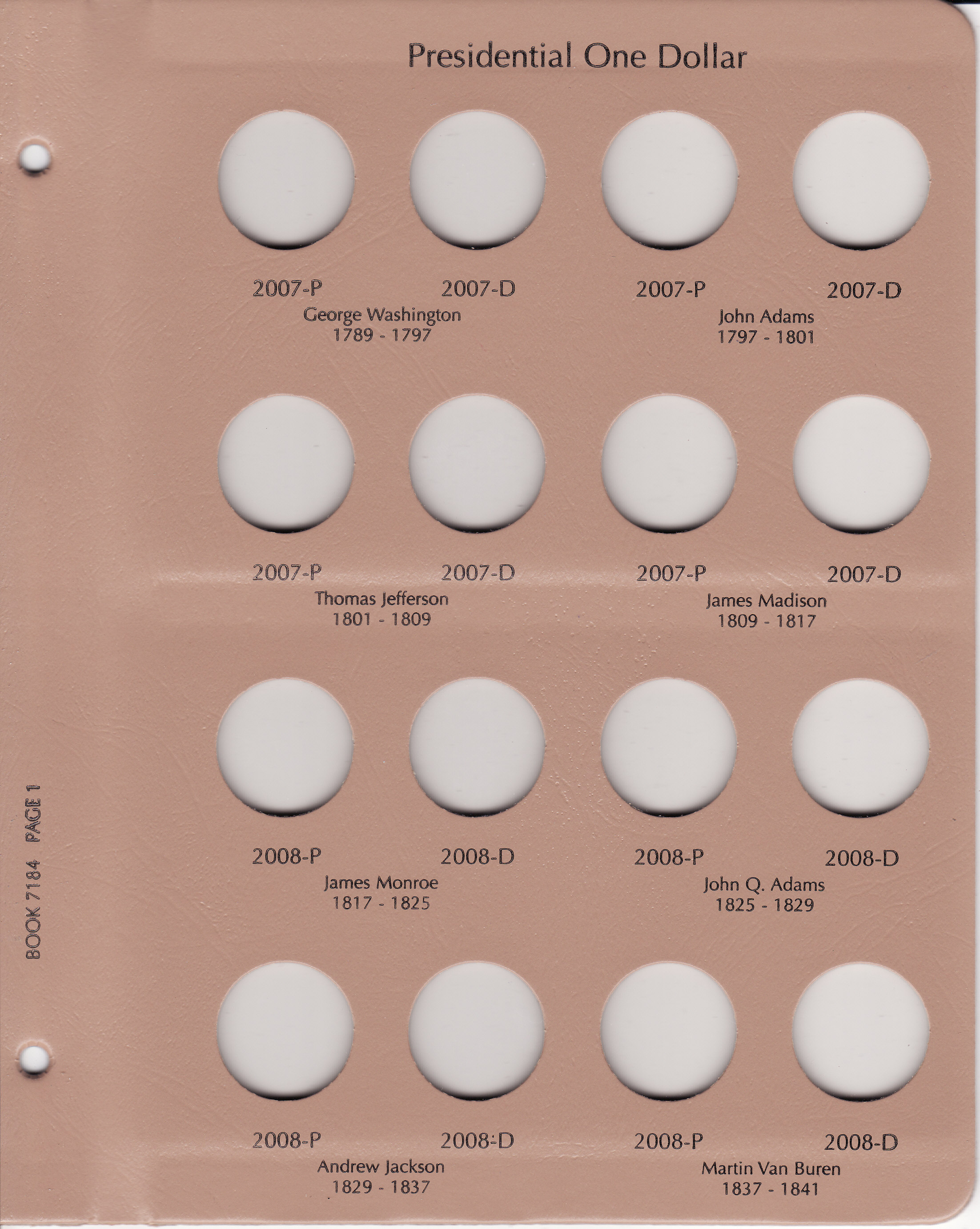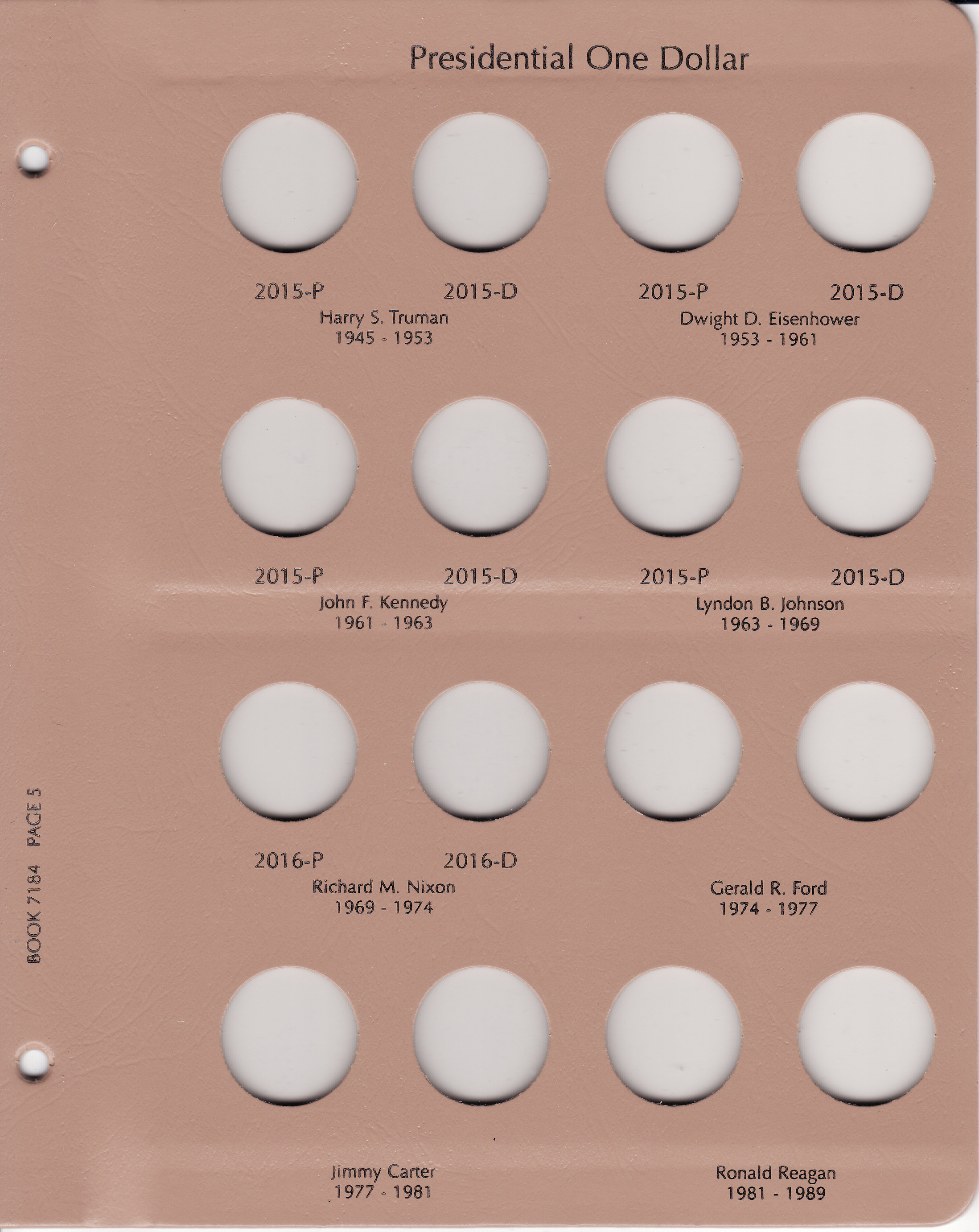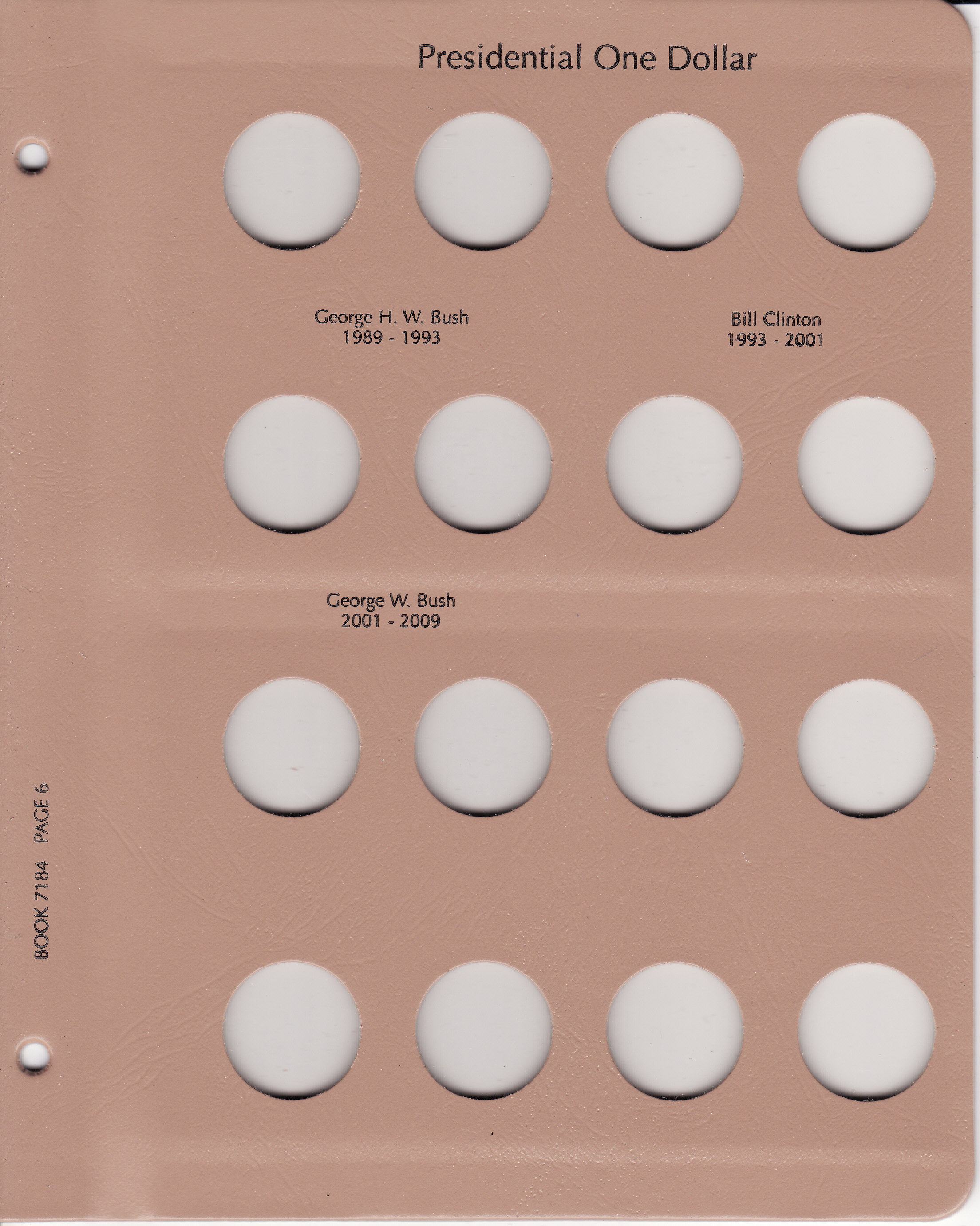 This Dansco Supreme Album for Presidential Dollars 2007-2016 P&D Mints (Dansco model number 7184) consists of a brown leatherette binder with loose-leaf hinged pages. The binder is gold stamped and the plastic coated pages are tan in color with black lettering. The pages are held in the binder with two posts that screw apart so that pages can be added, removed and replaced with ease. If a slip case is desired, the 1 inch slip case is the proper size for this album. The album includes holes for Presidential dollars issued through 2016. There are additional holes labeled for Presidents Jimmy Carter, George H. W. Bush, Bill Clinton, and George W. Bush in the event that those coins are released in the future. There are an additional 10 unlabeled holes on the last page.