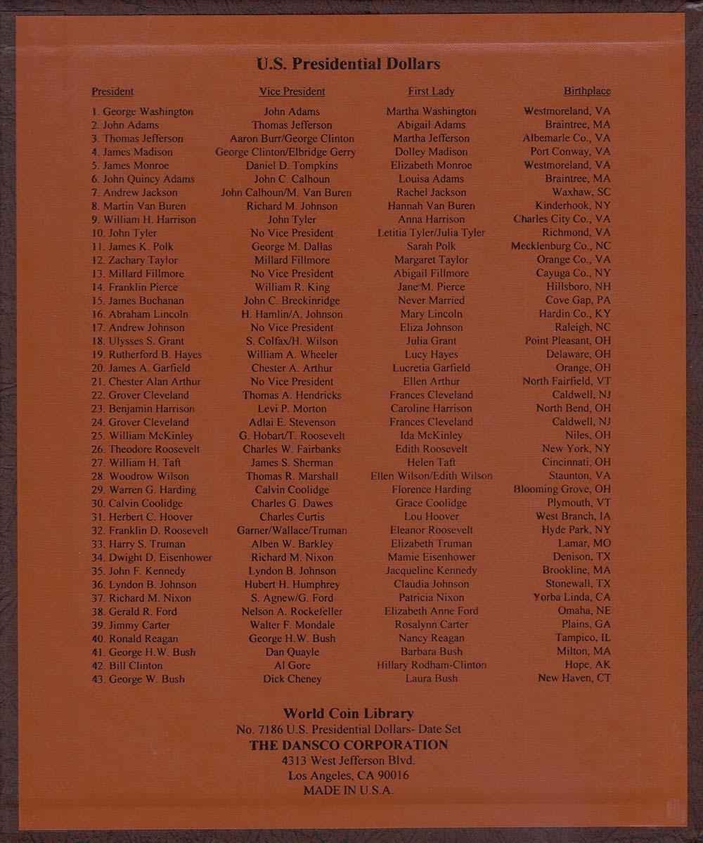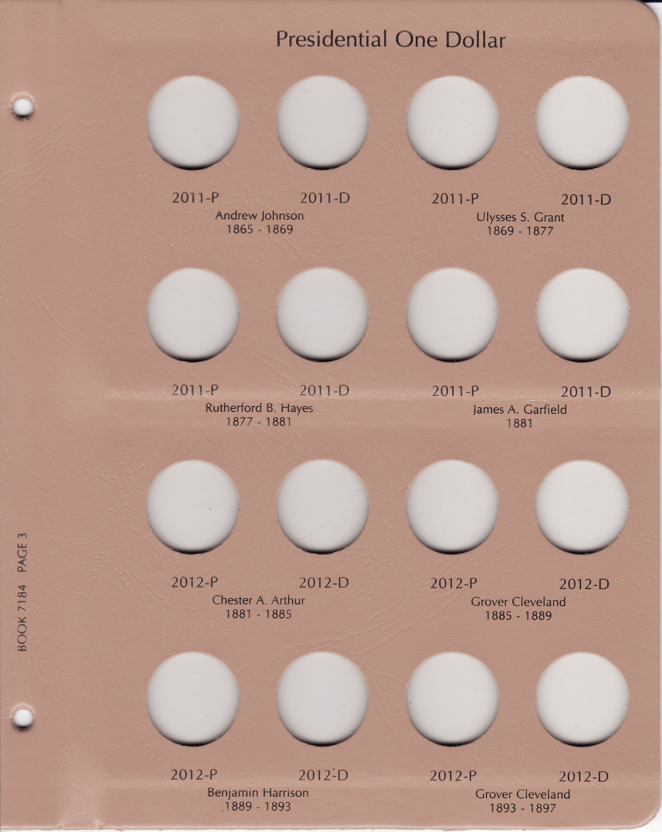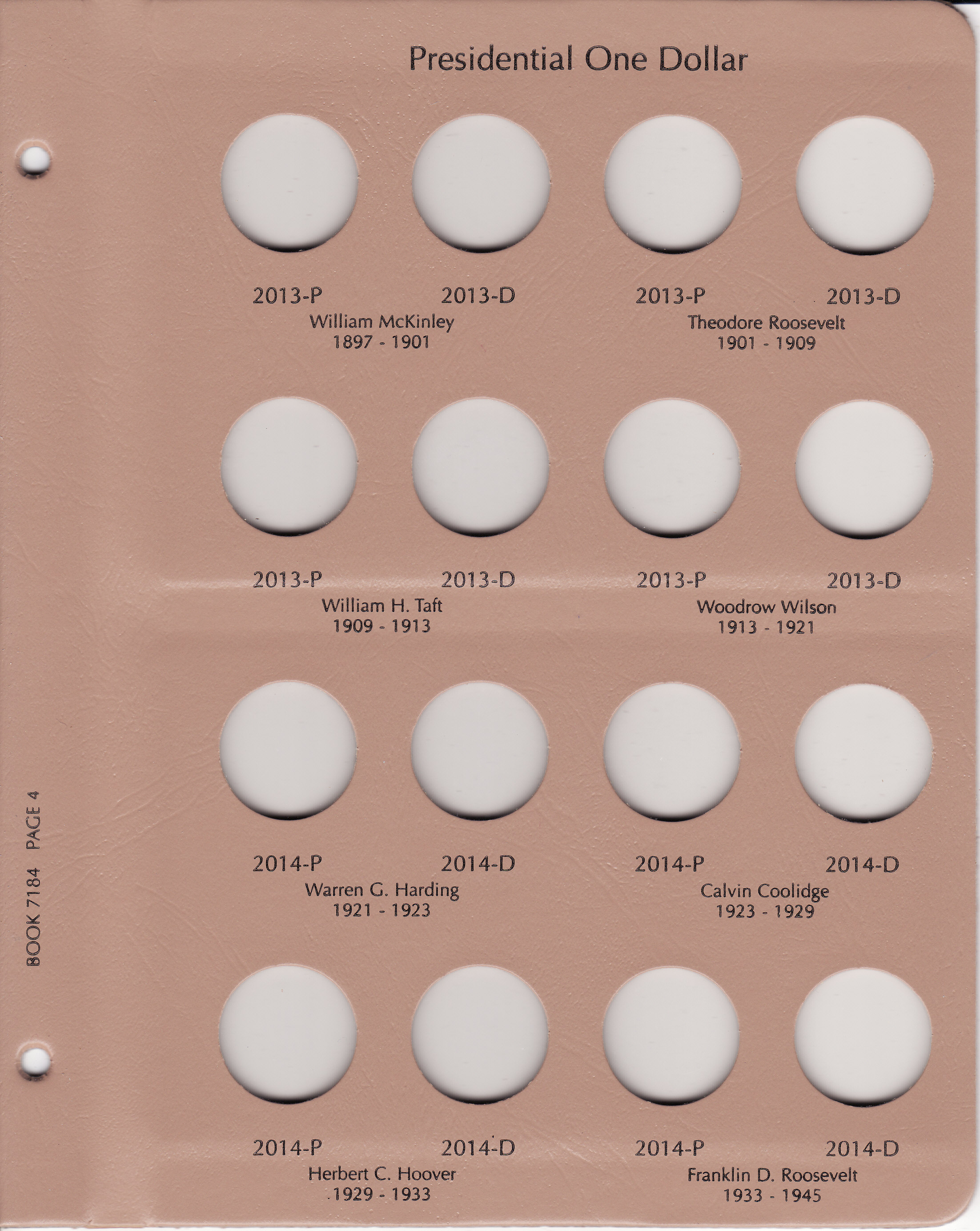 This Dansco Supreme Album for Presidential Dollars 2007-2016 P&D Mints (Dansco model number 7184) consists of a brown leatherette binder with loose-leaf hinged pages. The binder is gold stamped and the plastic coated pages are tan in color with black lettering. The pages are held in the binder with two posts that screw apart so that pages can be added, removed and replaced with ease. If a slip case is desired, the 1 inch slip case is the proper size for this album. The album includes holes for Presidential dollars issued through 2016. There are additional holes labeled for Presidents Jimmy Carter, George H. W. Bush, Bill Clinton, and George W. Bush in the event that those coins are released in the future. There are an additional 10 unlabeled holes on the last page.