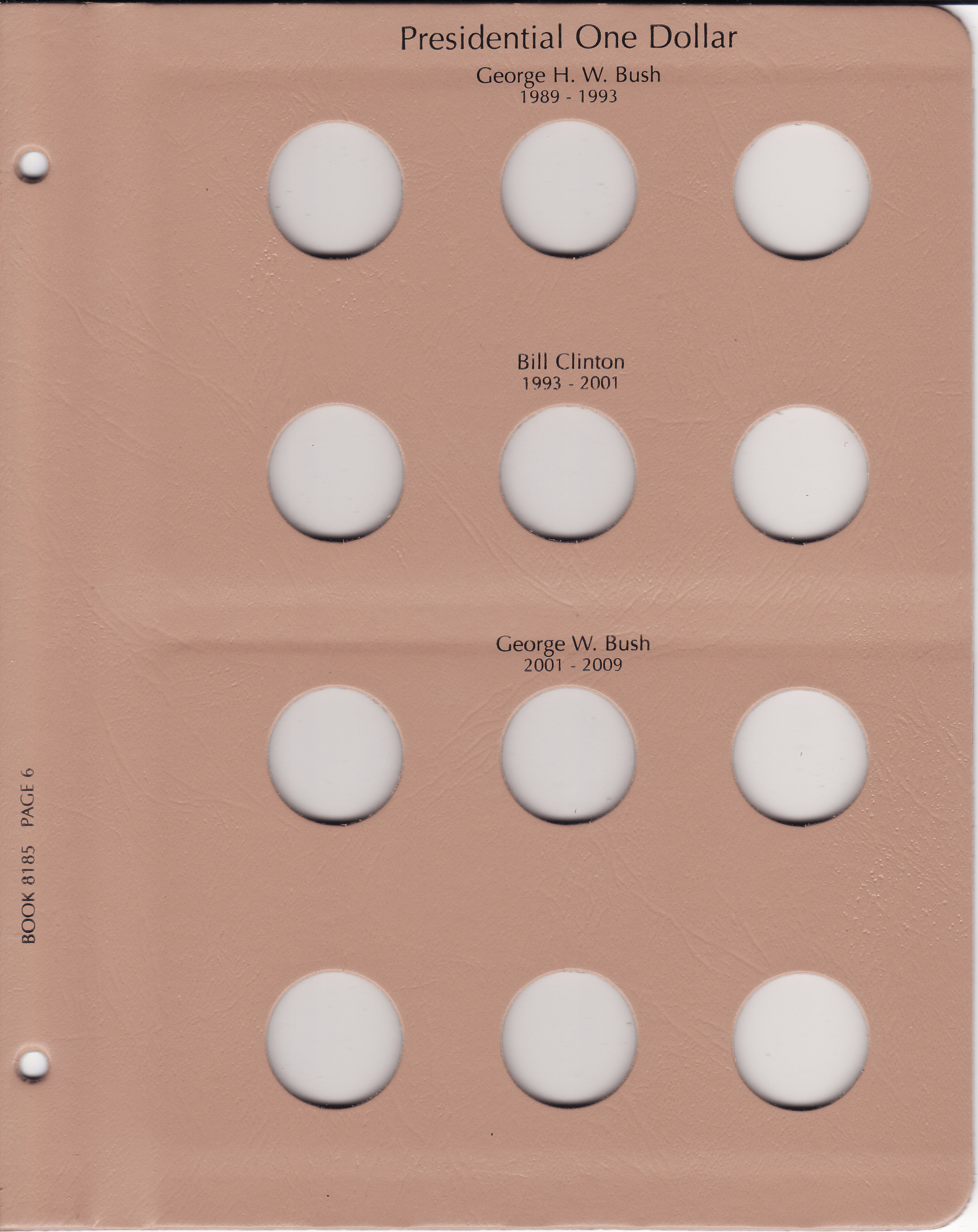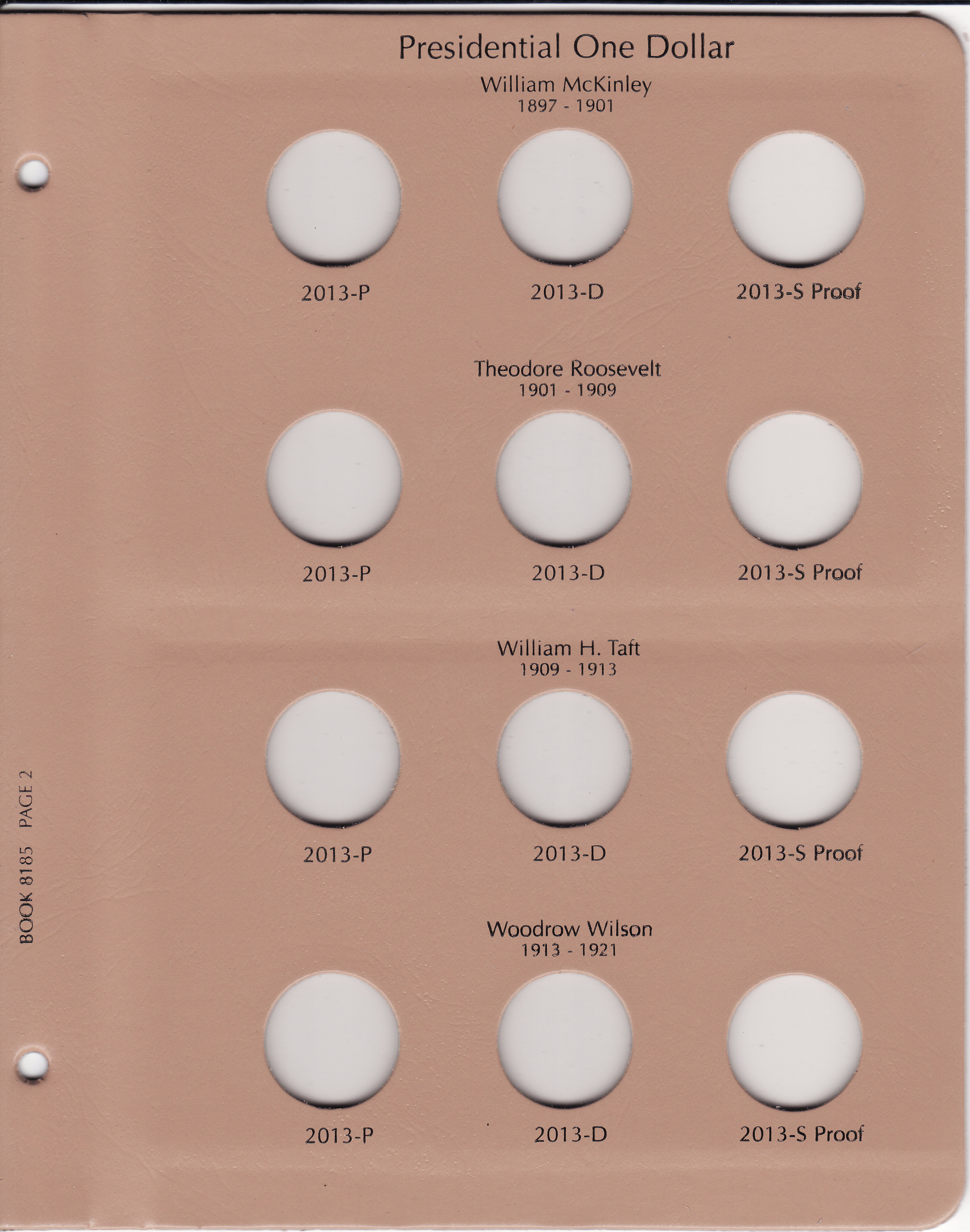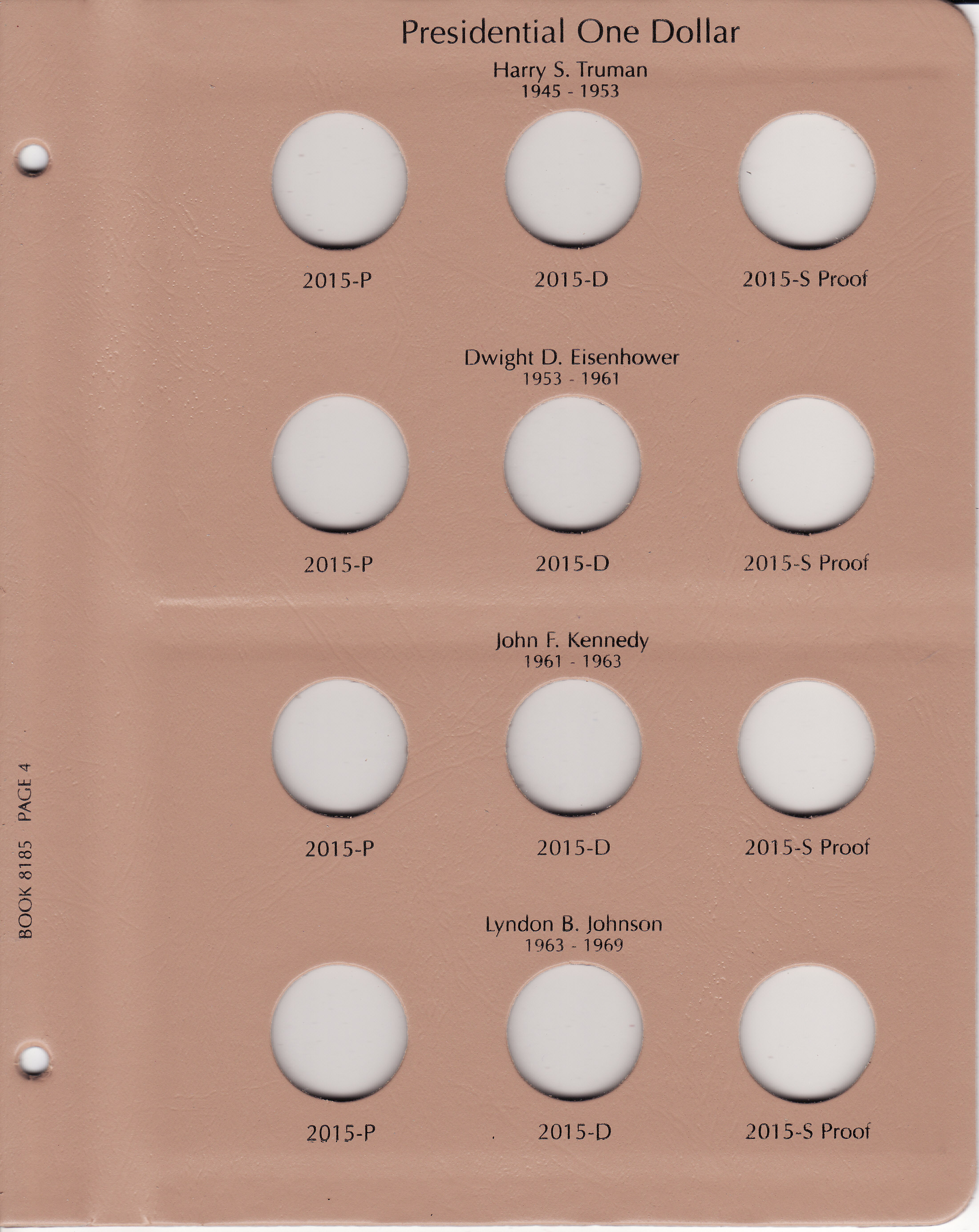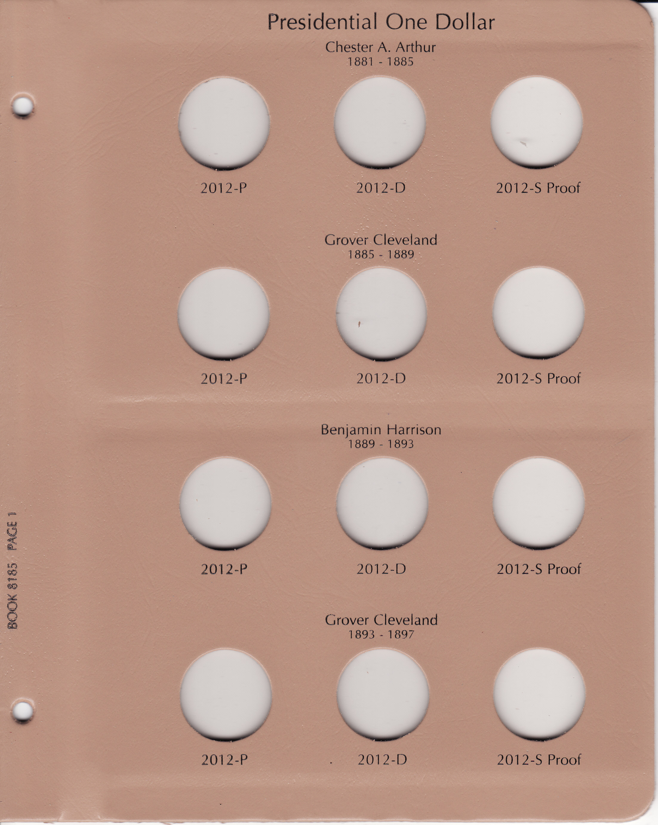 This Dansco Supreme Album for Presidential Dollars 2012-2016 w/ Proof (Dansco model number 8185) consists of a brown leatherette binder with loose-leaf hinged pages. The binder is gold stamped and the plastic coated pages are tan in color with black lettering. The pages are held in the binder with two posts that screw apart so that pages can be added, removed and replaced with ease. If a slip case is desired, the 1 inch slip case is the proper size for this album.