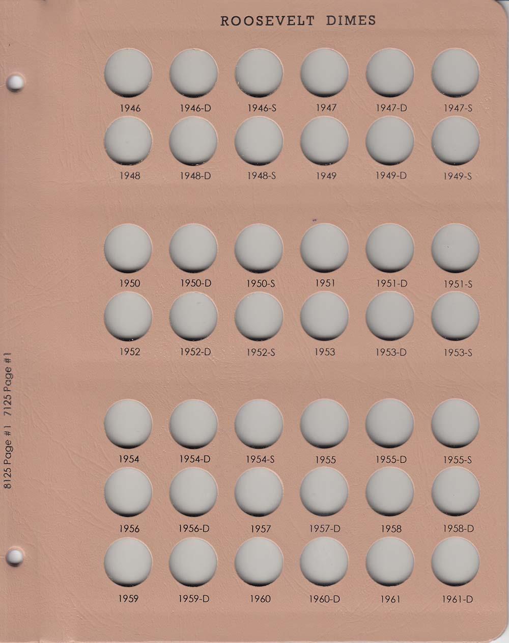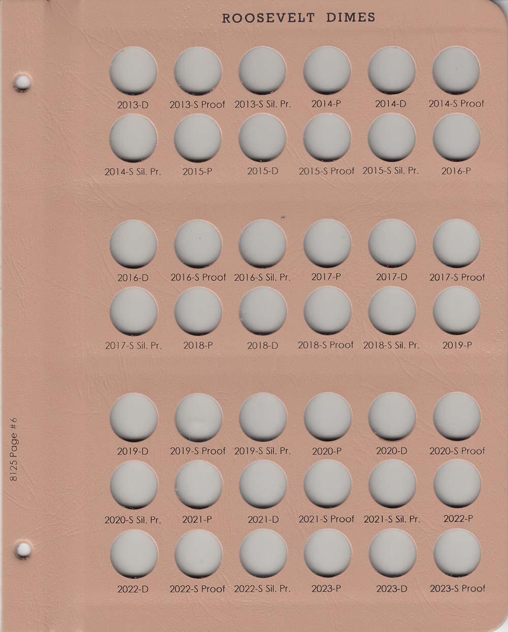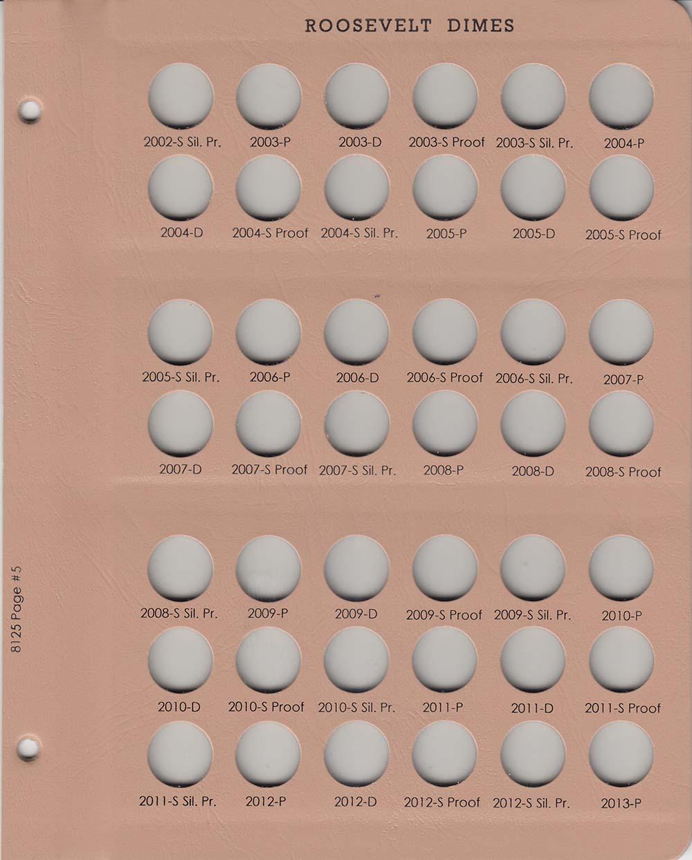 This Dansco Supreme Album for Roosevelt Dimes w/ Proof (Dansco model number 8125) consists of a brown leatherette binder with loose-leaf hinged pages. The binder is gold stamped and the plastic coated pages are tan in color with black lettering. The pages are held in the binder with two posts that screw apart so that pages can be added, removed and replaced with ease. If a slip case is desired, the 1 1/8 inch slip case is the proper size for this album.