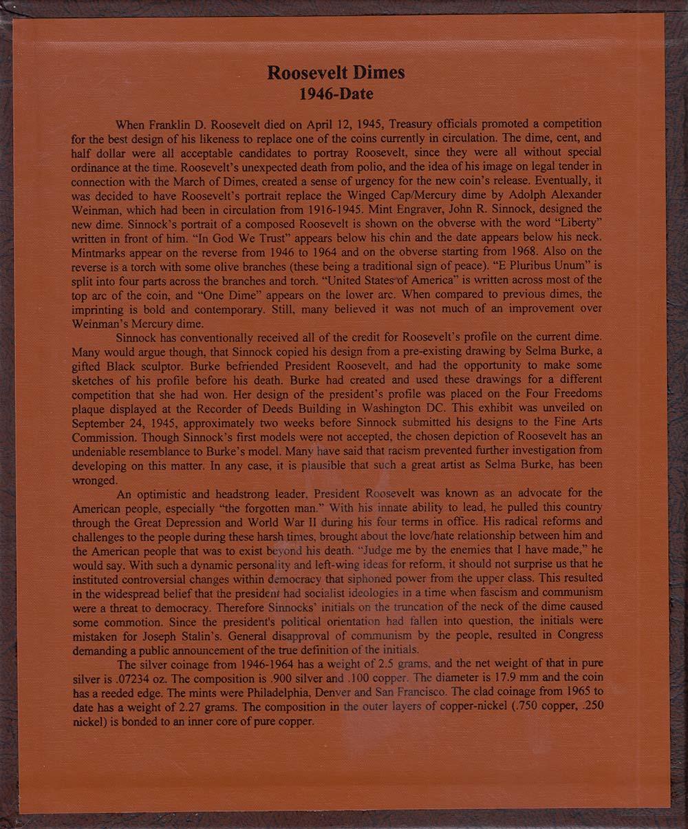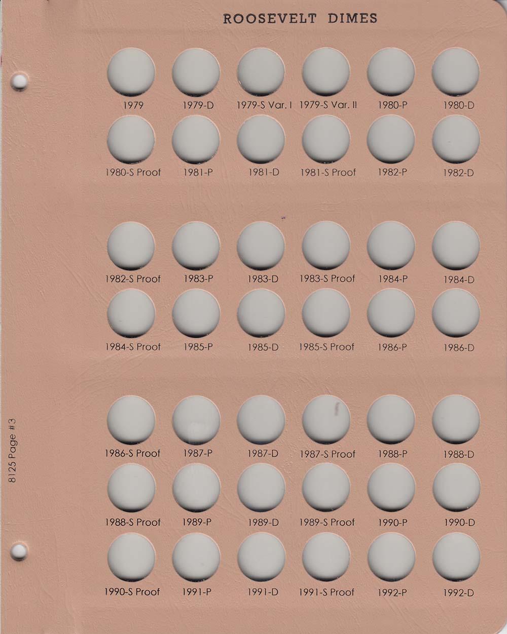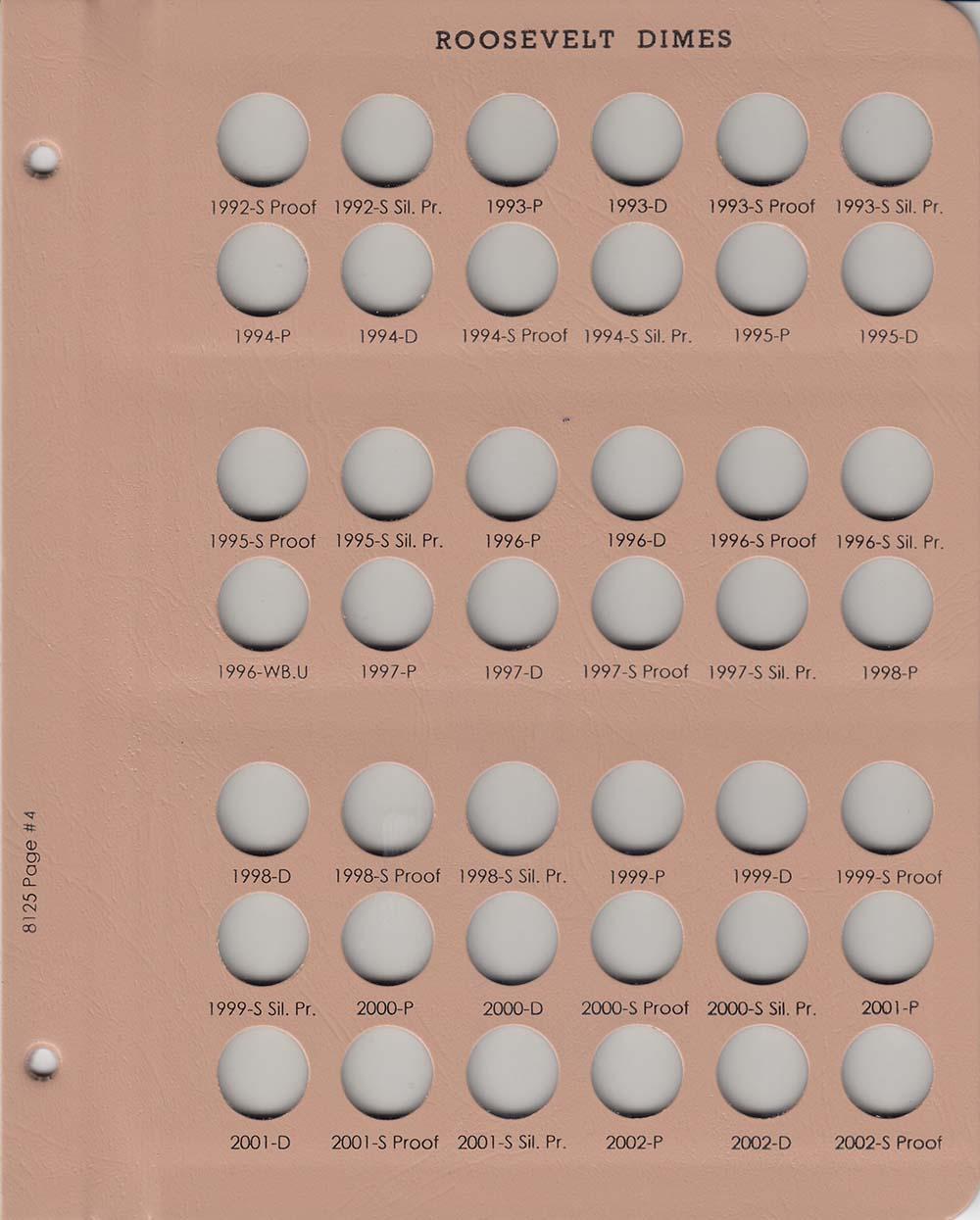 This Dansco Supreme Album for Roosevelt Dimes w/ Proof (Dansco model number 8125) consists of a brown leatherette binder with loose-leaf hinged pages. The binder is gold stamped and the plastic coated pages are tan in color with black lettering. The pages are held in the binder with two posts that screw apart so that pages can be added, removed and replaced with ease. If a slip case is desired, the 1 1/8 inch slip case is the proper size for this album.