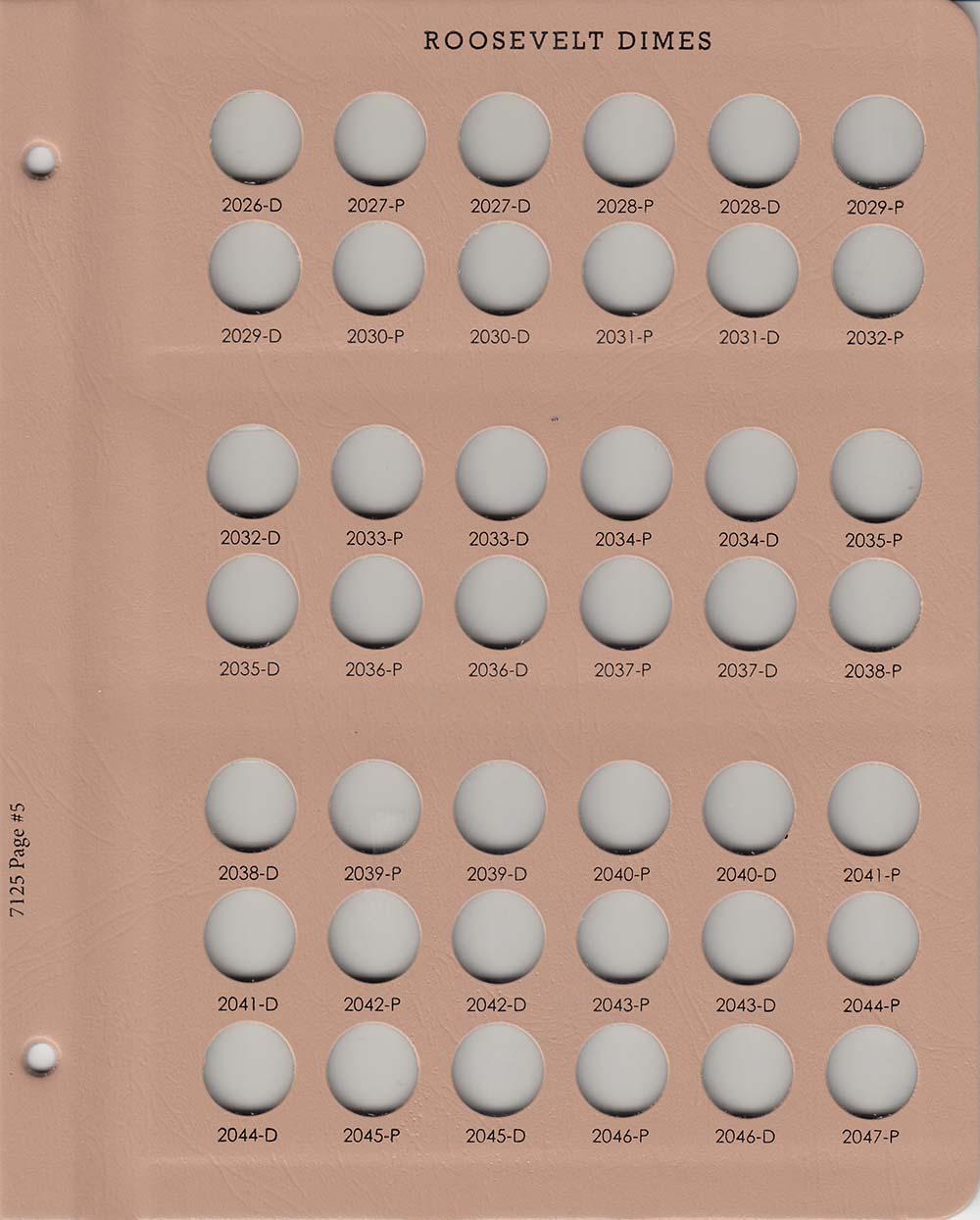 This Dansco Supreme Album for Roosevelt Dimes (Dansco model number 7125) consists of a brown leatherette binder with loose-leaf hinged pages. The binder is gold stamped and the plastic coated pages are tan in color with black lettering. The pages are held in the binder with two posts that screw apart so that pages can be added, removed and replaced with ease. If a slip case is desired, the 3/4 inch slip case is the proper size for this album.