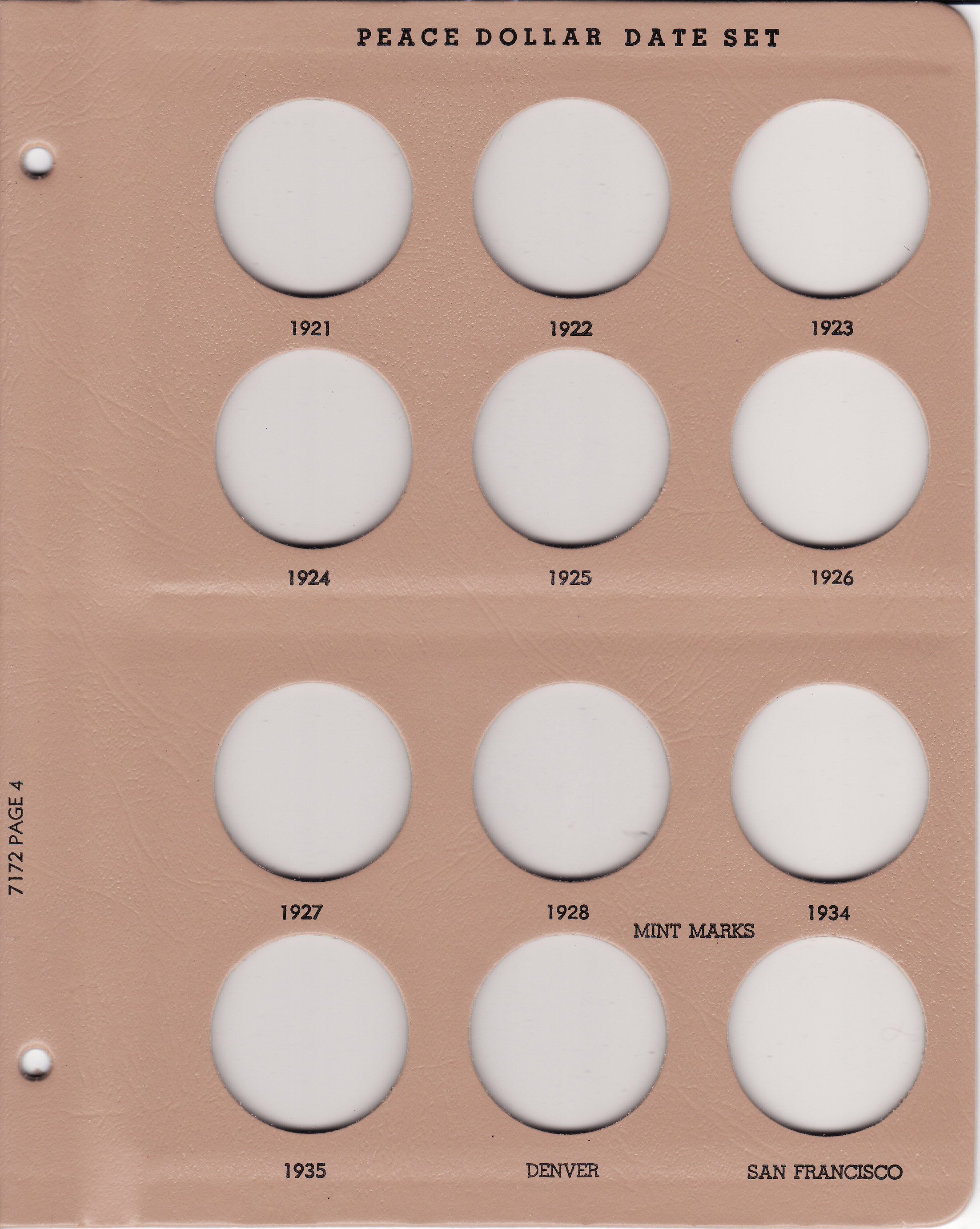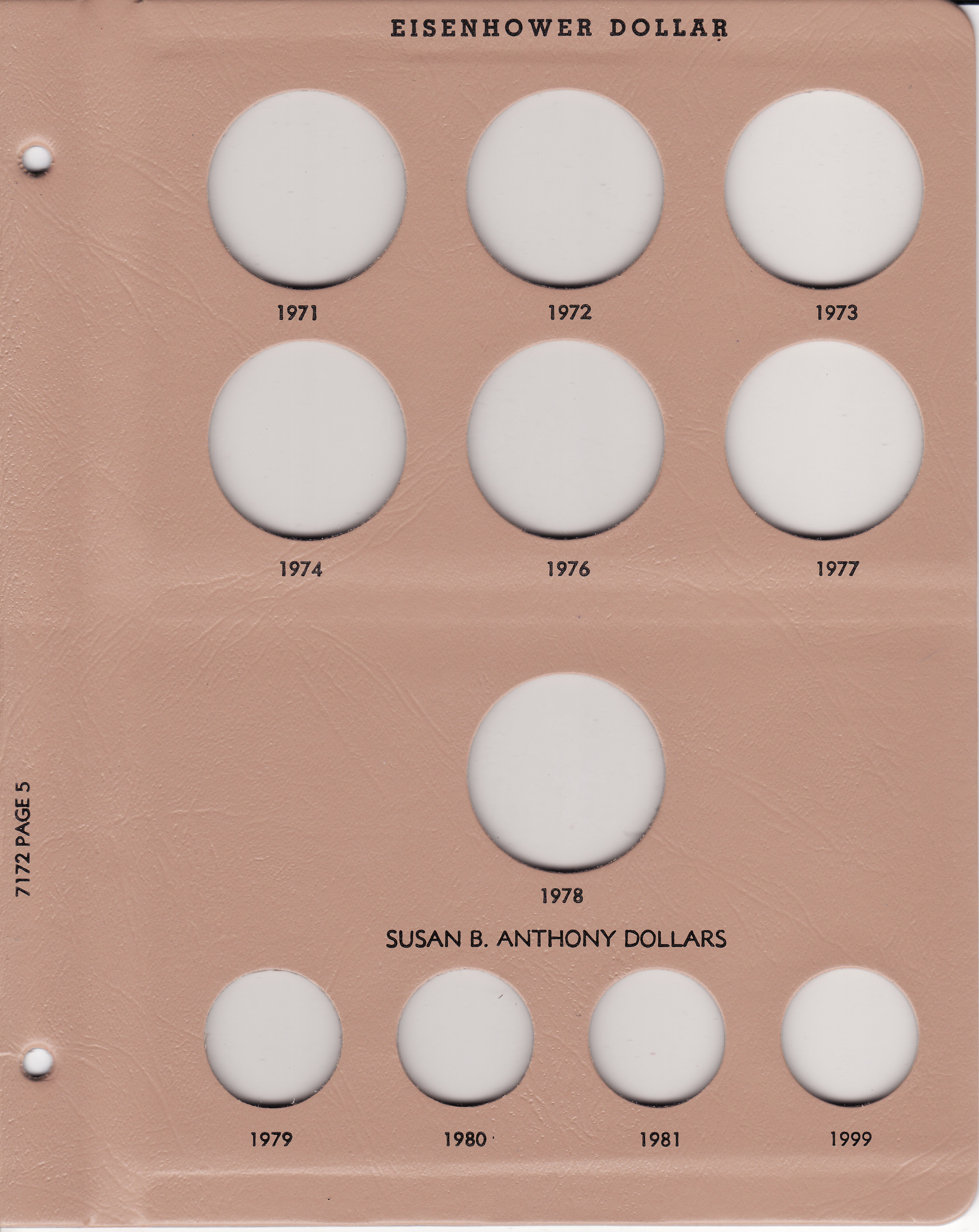 This Dansco Supreme Album for Silver Dollar Date Set 1878-Date (Dansco model number 7172) consists of a brown leatherette binder with loose-leaf hinged pages. The binder is gold stamped and the plastic coated pages are tan in color with black lettering. The pages are held in the binder with two posts that screw apart so that pages can be added, removed and replaced with ease. If a slip case is desired, the 3/4 inch slip case is the proper size for this album.