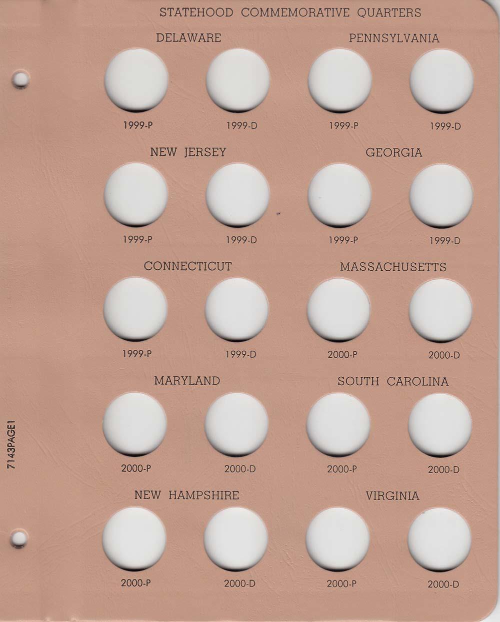 This Dansco Supreme Album for Statehood Quarters 1999-2008, P&D (Dansco model number 7143) consists of a brown leatherette binder with loose-leaf hinged pages. The binder is gold stamped and the plastic coated pages are tan in color with black lettering. The pages are held in the binder with two posts that screw apart so that pages can be added, removed and replaced with ease. If a slip case is desired, the 7/8 inch slip case is the proper size for this album.