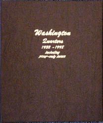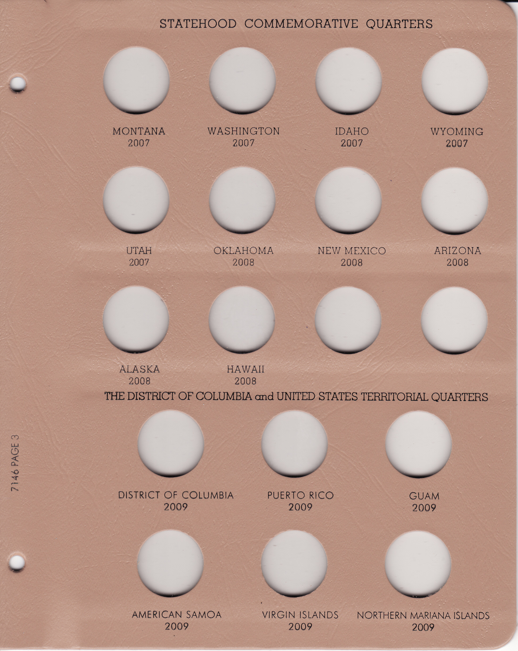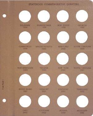 This Dansco Supreme Album for Statehood Quarters 1999-2009 (Dansco model number 7146) consists of a brown leatherette binder with loose-leaf hinged pages. The binder is gold stamped and the plastic coated pages are tan in color with black lettering. The pages are held in the binder with two posts that screw apart so that pages can be added, removed and replaced with ease. If a slip case is desired, the 5/8 inch slip case is the proper size for this album.