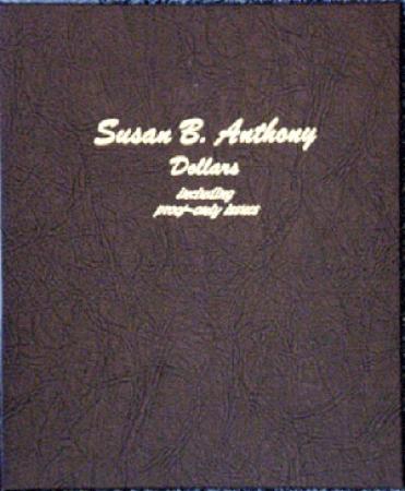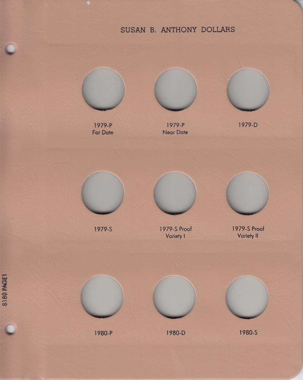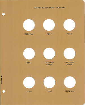 This Dansco Supreme Album for Susan B. Anthony Dollars w/ Proof (Dansco model number 8180) consists of a brown leatherette binder with loose-leaf hinged pages. The binder is gold stamped and the plastic coated pages are tan in color with black lettering. The pages are held in the binder with two posts that screw apart so that pages can be added, removed and replaced with ease. If a slip case is desired, the 5/8 inch slip case is the proper size for this album. PAGE 1: (1979-P FAR DATE, 1979-P NEAR DATE, 1979-D) (1979-S, 1979-S PROOF VARIETY 1, 1979-S VARIETY II) (1980-P, 1980-D, 1980-S) PAGE 2: (1980-S PROOF, 1981-P, 1981-D) (1981-S, 1981-S PROOF VARIETY I, 1981-S VARIETY II) (1999-P, 1999-D, 1999-P PROOF)