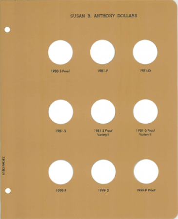 Dansco Replacement pages are used to update older versions of albums or replace worn pages. This page is page 2 of the Susan B Anthony Dollars 1980-1999 album (Dansco model 8180).