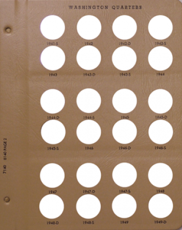 Dansco Replacement pages are used to update older versions of albums or replace worn pages. This page is page 2 of the Washington Quarters 1941-S-1949-S album (Dansco model 7140).