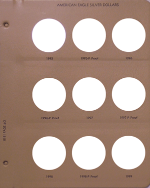 Dansco Replacement pages are used to update older versions of albums or replace worn pages. This page is page 3 of the American Silver Eagle w/ Proof album (Dansco model 8181).
