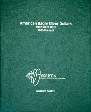 Intercept Shield coin albums are museum quality and a handsome, safe way to store and protect your coins. This album has spaces for mint state American Eagle Silver Dollars. The album contains three pages with spaces for issues from 1986 to 2012. The album is constructed from high-grade, acid-free and sulfur-free materials and lined with Intercept Shield, a breakthrough technology protecting your valuable coins from environmental damage. The album also comes with a slip case giving your coins DOUBLE PROTECTION. Intercept Shield acts as a neutralizing agent cleansing the air around the coin protecting it from the harmful effects of corrosion.