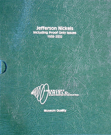 Intercept Shield coin albums are museum quality and a handsome, safe way to store and protect your coins. This album has spaces for Jefferson Nickels from 1938 to 2002. The album contains five pages and spaces for all Jefferson Nickels are provided, including proof-only S-mint issues beginning in 1971. The album is constructed from high-grade, acid-free and sulfur-free materials and lined with Intercept Shield, a breakthrough technology protecting your valuable coins from environmental damage. The album also comes with a slip case giving your coins DOUBLE PROTECTION. Intercept Shield acts as a neutralizing agent cleansing the air around the coin protecting it from the harmful effects of corrosion.