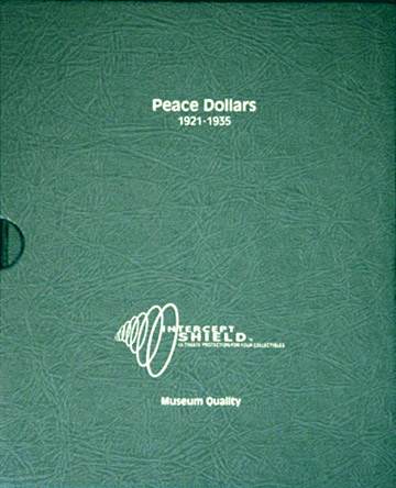 Intercept Shield coin albums are museum quality and a handsome, safe way to store and protect your coins. This album has spaces for Peace Dollars from 1921 to 1935. The album contains two pages with a space for each date/mint Peace Dollar released between 1921 and 1935. The album is constructed from high-grade, acid-free and sulfur-free materials and lined with Intercept Shield, a breakthrough technology protecting your valuable coins from environmental damage. The album also comes with a slip case giving your coins DOUBLE PROTECTION. Intercept Shield acts as a neutralizing agent cleansing the air around the coin protecting it from the harmful effects of corrosion.