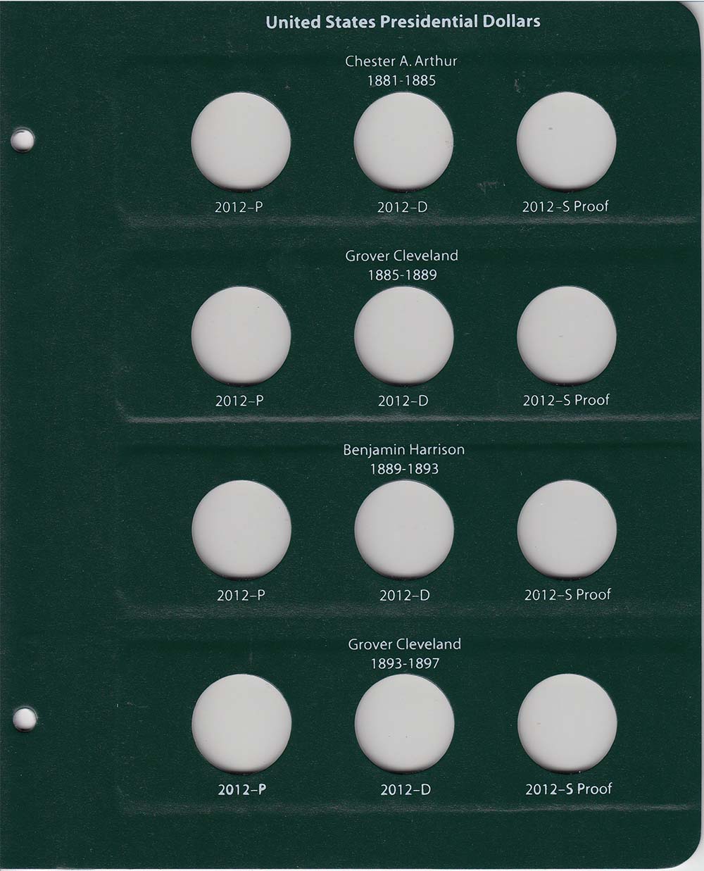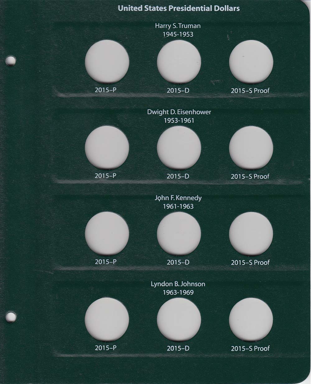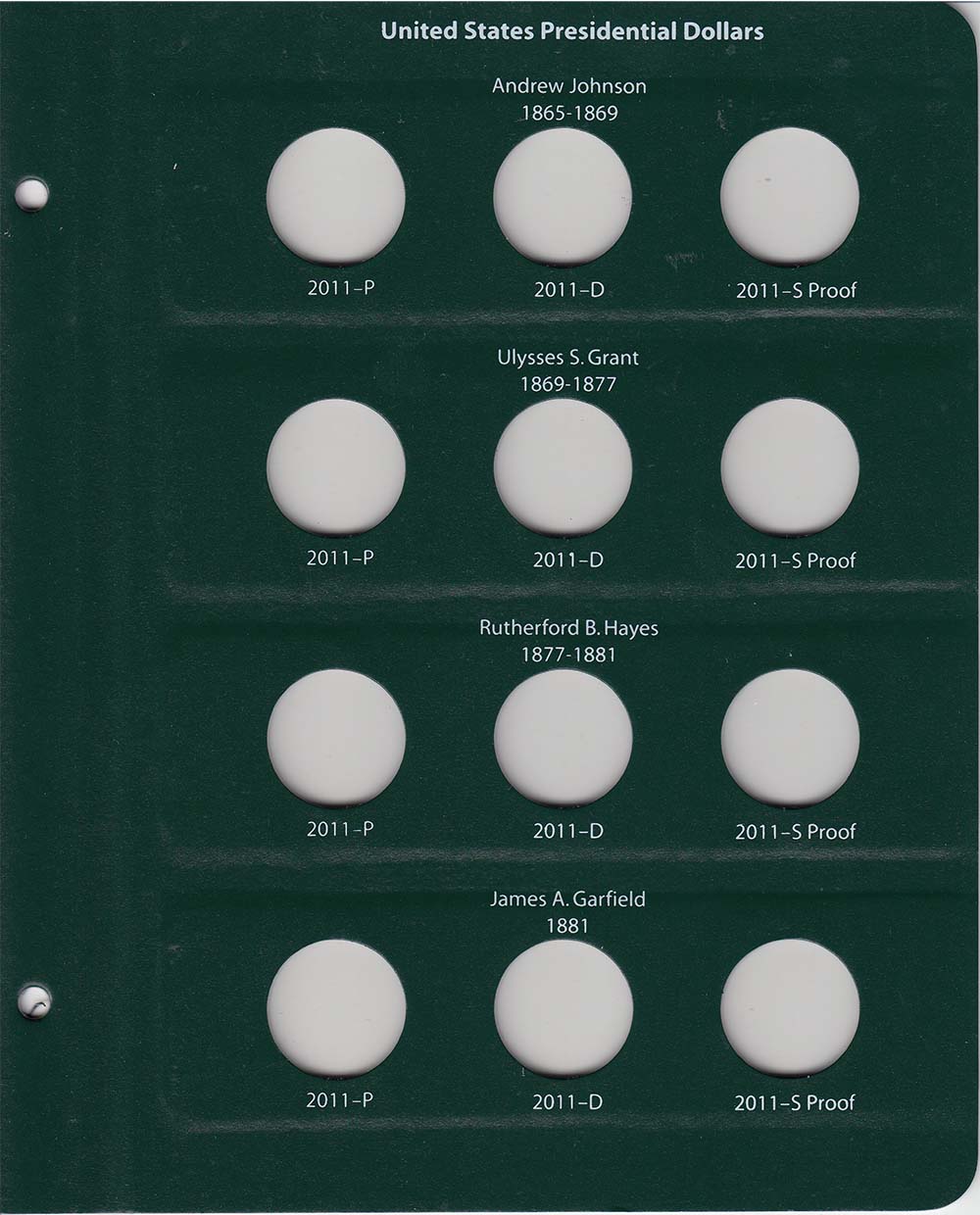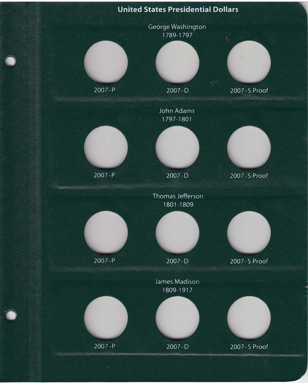 Intercept Shield coin albums are museum quality and a handsome, safe way to store and protect your coins. This album has spaces for Presidential Dollars issued starting in 2007. The album contains nine pages and has three holes per President to display circulation strike Philadelphia Mint (P) and Denver Mint (D) issues and a proof San Francisco Mint (S) strike for each President. Each page contains twelve holes to cover four Presidents and one year of the program. Each page is labeled with the President's name and years served. The nine pages cover George Washington issued in 2007 through Lyndon B. Johnson to be issued in 2015. The album contains room to add additional pages when the final eligible presidents to be honored are determined. The album is constructed from high-grade, acid-free and sulfur-free materials and lined with Intercept Shield, a breakthrough technology protecting your valuable coins from environmental damage. The album also comes with a slip case giving your coins DOUBLE PROTECTION. Intercept Shield acts as a neutralizing agent cleansing the air around the coin protecting it from the harmful effects of corrosion.