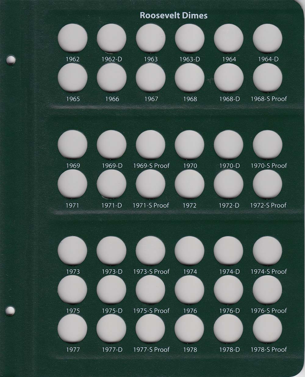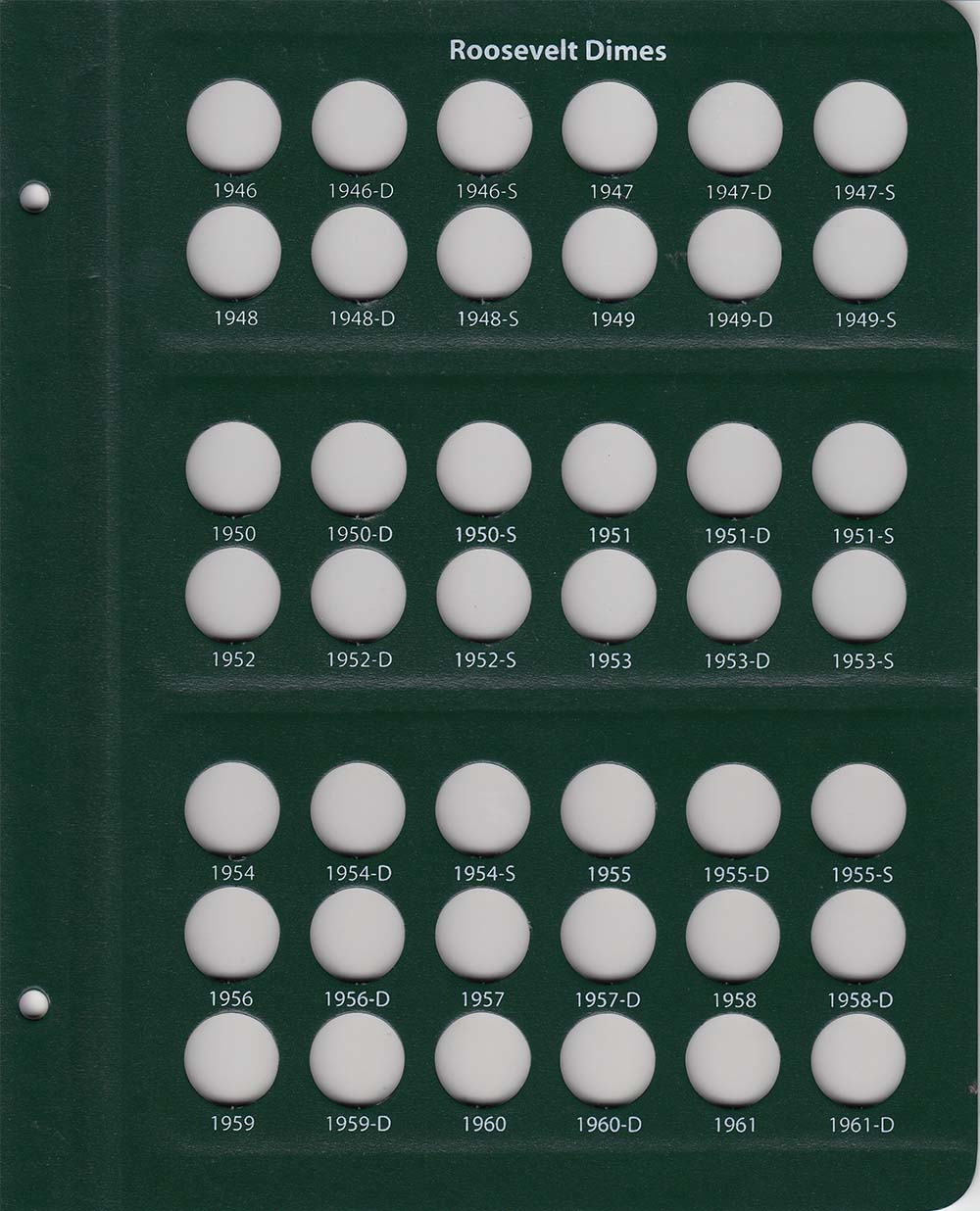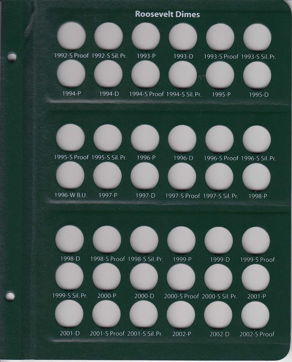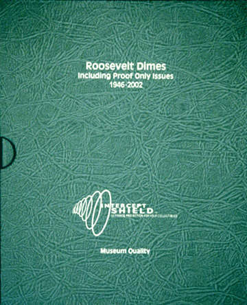Intercept Shield coin albums are museum quality and a handsome, safe way to store and protect your coins. This album has spaces for Roosevelt Dimes from 1946 to 2002. The album contains four pages and spaces for all Roosevelt Dimes are provided. The only die varieties included are the 1979-S Filled and Clear S varieties. Spaces for proof-only S-mint issues beginning in 1968 are included. Beginning in 1992, spaces for both Clad and Silver proof coins are included. Spaces are provided for 2002-P, 2002-D and a single 2002-S proof. The album is constructed from high-grade, acid-free and sulfur-free materials and lined with Intercept Shield, a breakthrough technology protecting your valuable coins from environmental damage. The album also comes with a slip case giving your coins DOUBLE PROTECTION. Intercept Shield acts as a neutralizing agent cleansing the air around the coin protecting it from the harmful effects of corrosion. PAGE 1: (1946)(1946D)(1946S)(1947)(1947D)(1947S) (1948)(1948D)(1948S)(1949)(1949D)(1949S) (1950)(1950D)(1950S)(1951)(1951D)(1951S) (1952)(1952D)(1952S)(1953)(1953D)(1953S) (1954)(1954D)(1954S)(1955)(1955D)(1955S) (1956)(1956D)(1957)(1957D)(1958)(1958D) (1959)(1959D)(1960)(1960D)(1961)(1961D) PAGE 2: (1962)(1962D)(1963)(1963D)(1964)(1964D) (1965)(1966)(1967)(1968)(1968D)(1968S PROOF) (1969)(1969D)(1969S PROOF)(1970)(1970D)(1970S PROOF) (1971)(1971D)(1971S PROOF)(1972)(1972D)(1972S PROOF) (1973)(1973D)(1973S PROOF)(1974)(1974D)(1974S PROOF) (1975)(1975D)(1975S PROOF)(1976)(1976D)(1976S PROOF) (1977)(1977D)(1977S PROOF)(1978)(1978D)(1978S PROOF) PAGE 3: (1979)(1979D)(1979S VAR I)(1979S VAR. II)(1980P)(1980D) (1980 S PROOF)(1981P)(1981D)(1981S PROOF)(1982P)(1982D) (1982S PROOF)(1983P)(1983D)(1983S PROOF)(1984P)(1984D) (1984S PROOF)(1985P)(1985D)(1985S PROOF)(1986P)(1986D) (1986S PROOF)(1987P)(1987D)(1987S PROOF)(1988P)(1988D) (1988S PROOF)(1989P)(1989D)(1989S PROOF)(1990P)(1990D) (1990S PROOF)(1991P)(1991D)(1991S PROOF)(1992P)(1992D) PAGE 4: (1992S PROOF)(1992S SIL PR)(1993P)(1993S PROOF)(1993S SIL PR) (1994P)(1994D)(1994S PROOF)(1994S SIL PR)(1995P)(1995D) (1995S PROOF)(1995S SIL PR)(1996P)(1996D)(1996S PROOF)(1996S SIL PR) (1996W B.U.)(1997P)(1997D)(1997S PROOF)(1997S SIL PR)(1998P) (1998D)(1998S PROOF)(1998S SIL PR)(1999P)(1999D)(1999S PROOF) (1999S SIL PR)(2000P)(2000D)(2000S PROOF)(2000S SIL PR)(2001P) (2001D)(2001S PROOF)(2001S SIL PR)(2002P)(2002D)(2002S PROOF)