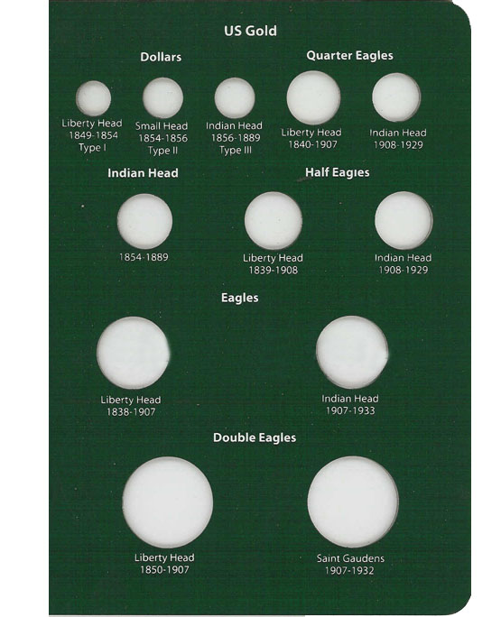 Intercept Shield coin albums are museum quality and a handsome, safe way to store and protect your coins. This page is made to be added to the Intercept Shield United States Type album for collectors who wish to add the gold types to their set.