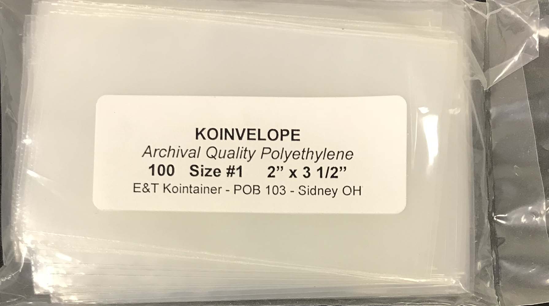 E & T Kointainer introduced the use of inert polyethylene bags in the 1950s. Just insert the coin in the bag, fold over, and place in a flip or paper envelope. 100 Koinvelopes per pack.